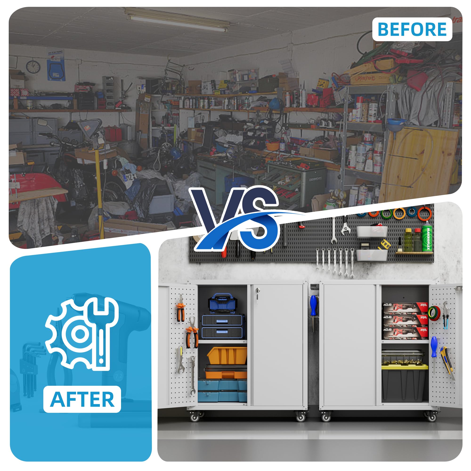 Industrial-Grade Durability & Rust-Proof Protection:Crafted from heavy-duty cold-rolled steel, this garage cabinet withstands up to 100 lbs of weight—perfect for bulky tools, power equipment, or automotive supplies. Features eco-friendly powder coating for superior resistance to rust, moisture, and garage chemicals. Built to survive harsh environments, from humid basements to dusty workshops.