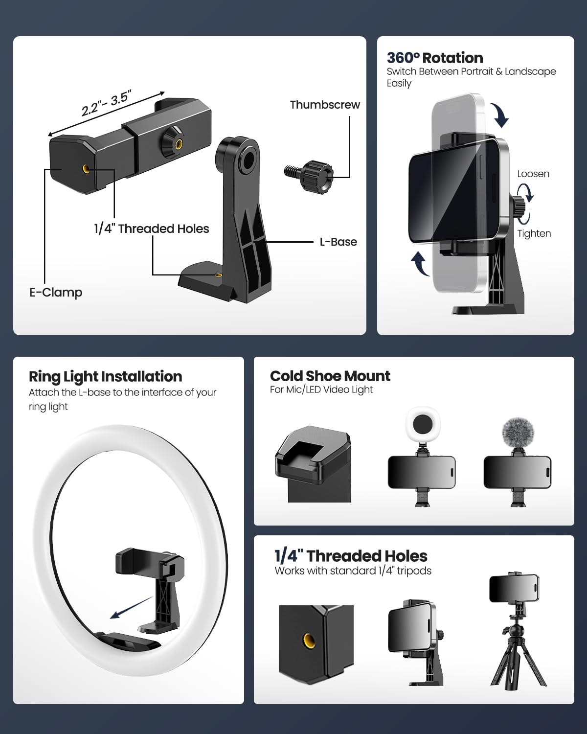 【360° Adjustable Angles & Wide Compatibility】Designed with a 360° rotatable head and adjustable phone holder for flexible shooting angles—portrait, landscape, low-angle, or overhead. Compatible with most smartphones, cameras, webcams, GoPros, and even small tablets.