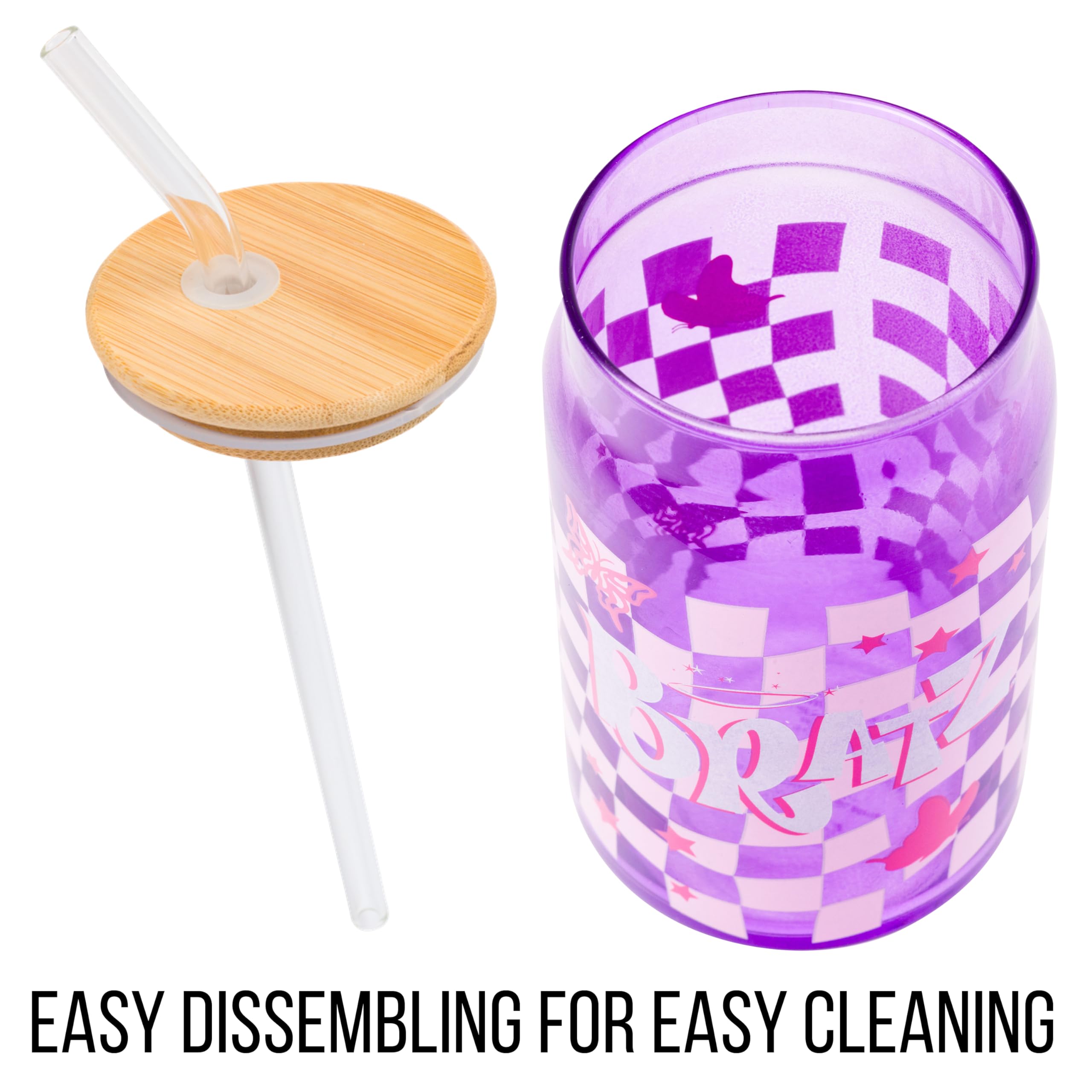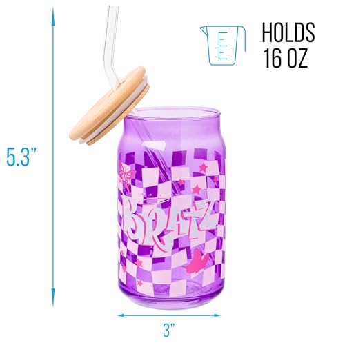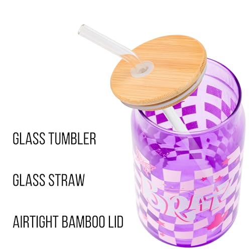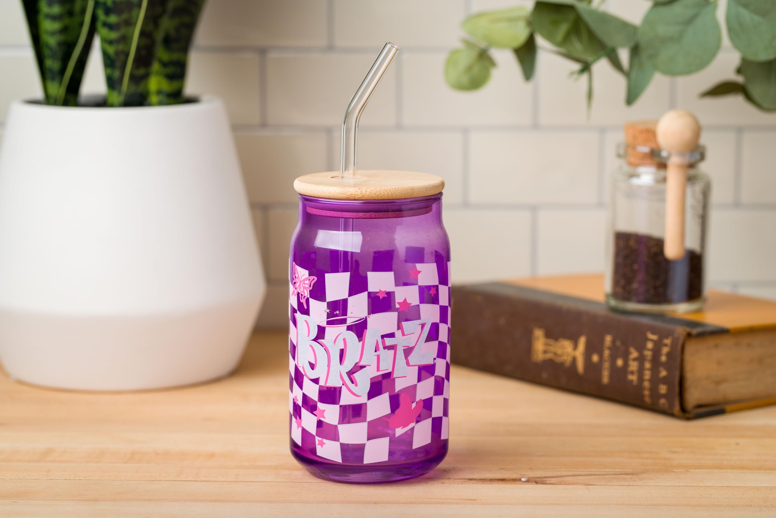 Enjoy your favorite drinks with this Bratz themed glass tumbler! Bratz themed tumbler features the iconic Bratz logo against a purple checkered background. Surrounding the logo are stars and butterflies. Glass tumbler is purple. Tumbler is complete with a bamboo lid and reusable glass straw, promoting eco-conscious living. 16 ounce tumbler is perfect for enjoying any beverage. Complete with a secure bamboo lid and reusable glass straw, this is the perfect cup to bring on your daily adventures. HAND WASH ONLY. NOT microwave safe. Looking for a gift? This glass tumbler makes a great gift for Bratz fans. Great for holidays, birthdays, and housewarmings. Take a dive into the fictional world with Silver Buffalo! Silver Buffalo provides fans with official merchandise from their favorite characters. Working alongside licensors and brands, we create unique and imaginative products which are designed with great care and detail. Silver Buffalo aims to connect fans to their favorite cartoon characters, superheroes, movies, tv-series, and more. Celebrate your fandom!
