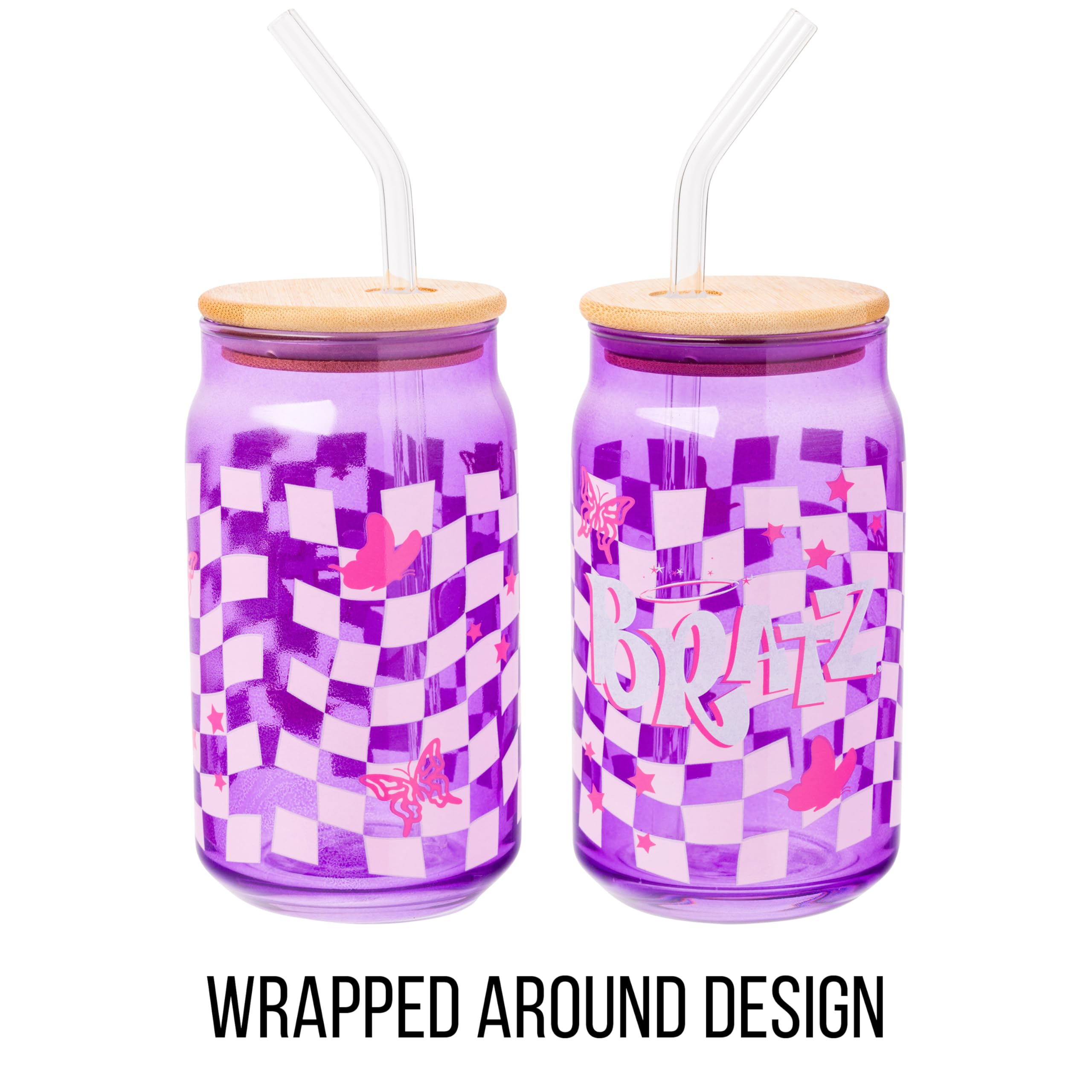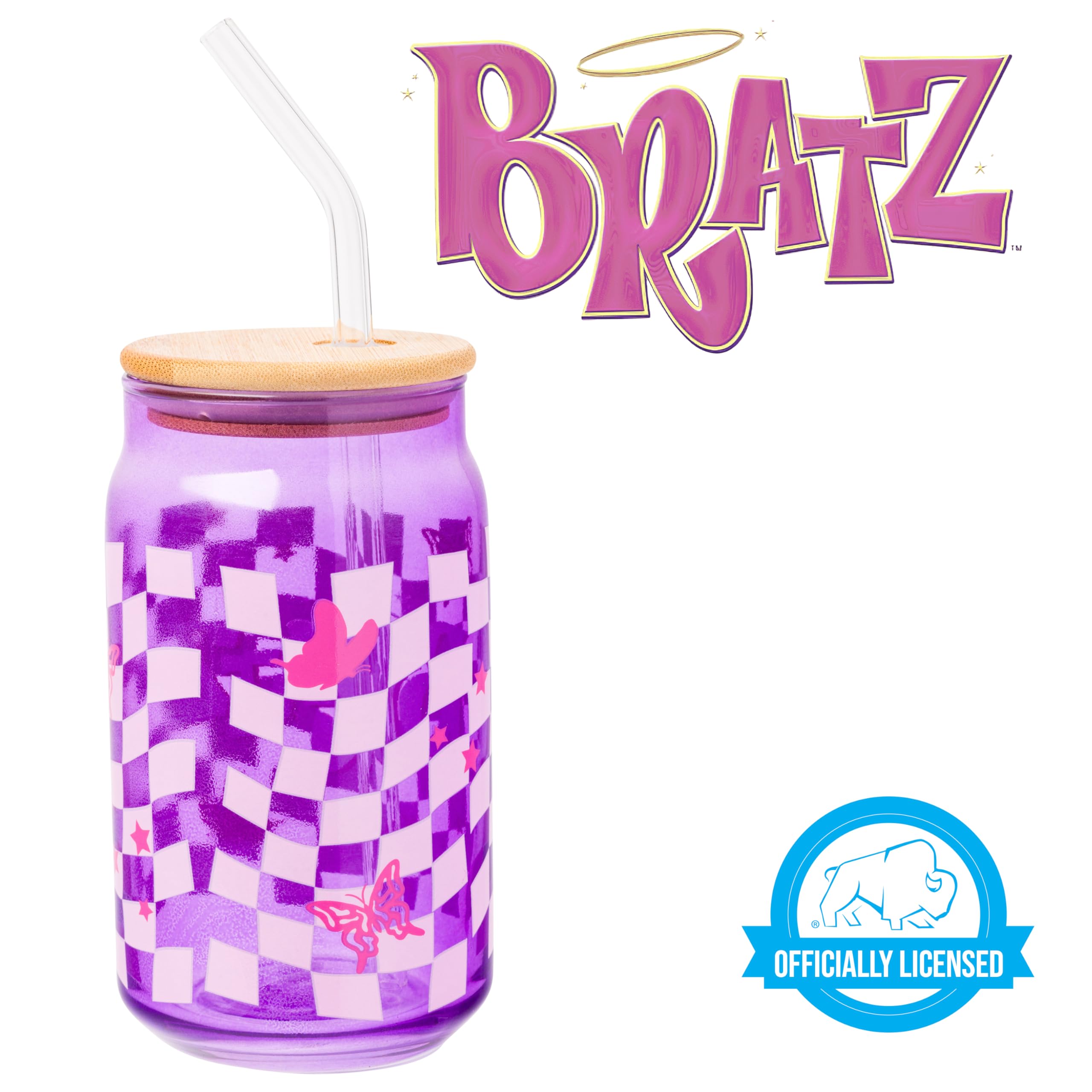 BRATZ TUMBLER: Bratz themed tumbler features the iconic Bratz logo against a purple checkered background. Surrounding the logo are stars and butterflies. Glass tumbler is purple.