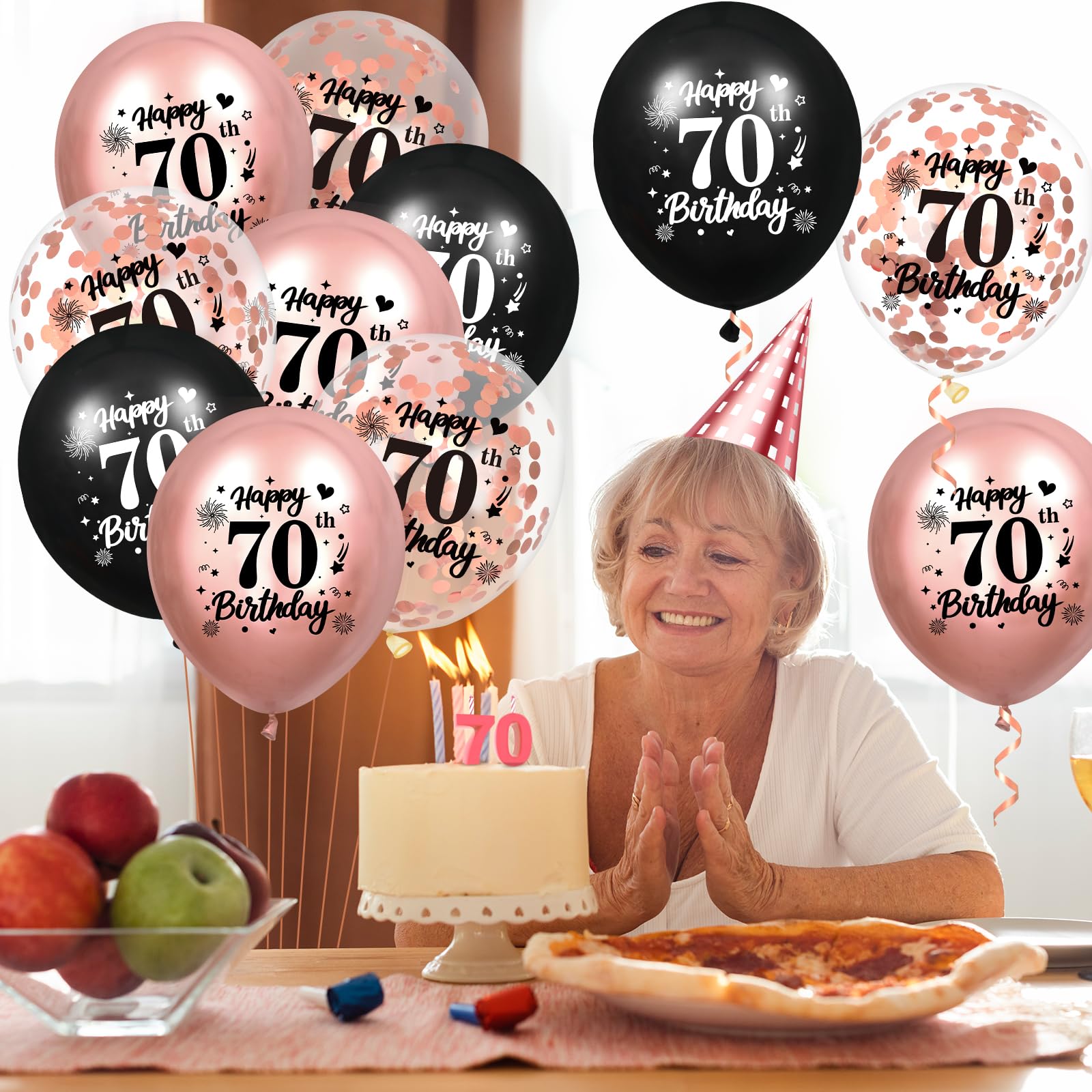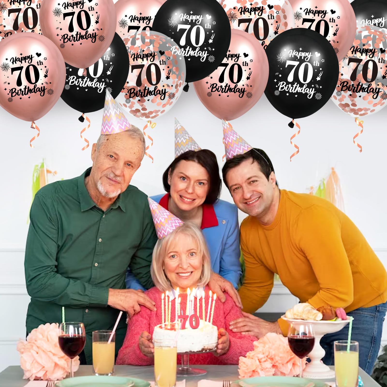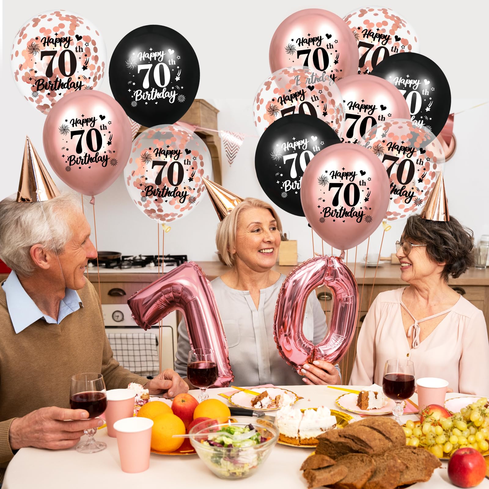 【70th Birthday Party Decorations】: “Romantic rose gold” + “mysterious black” + “featured confetti” latex balloons as 70th birthday party decorations, everyone will praise after seeing them, rose gold 70th balloons are essential decorations for 70th birthday party which can be used as a photo background for everyone to record the loving moment