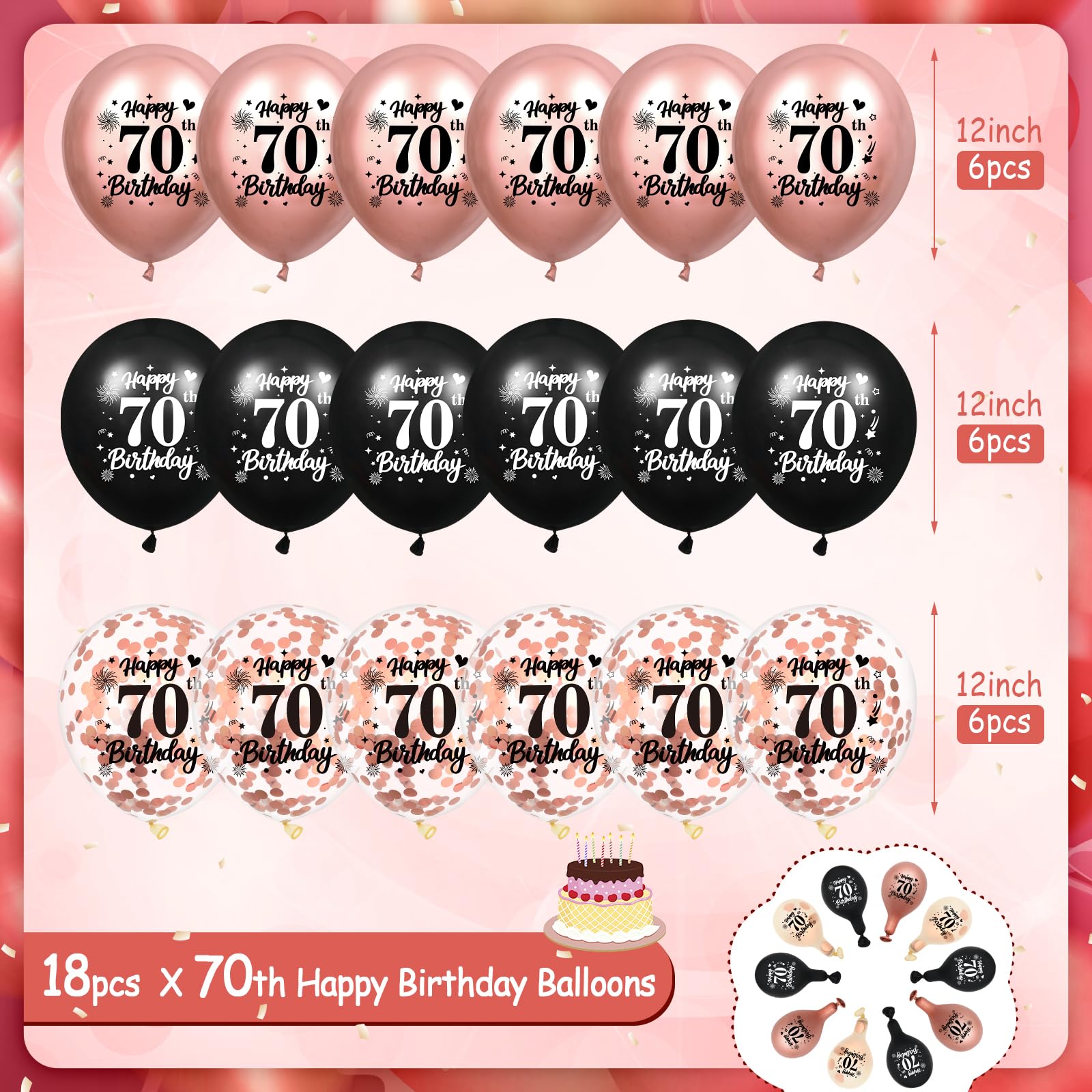 【70th Birthday Balloons】: This 70th birthday balloons set includes 6 pieces of rose gold balloons,6 pieces of confetti balloons and 6 pieces of black balloons, each 70th balloon is printed with exquisite patterns, and there comes with a roll of rose gold ribbon