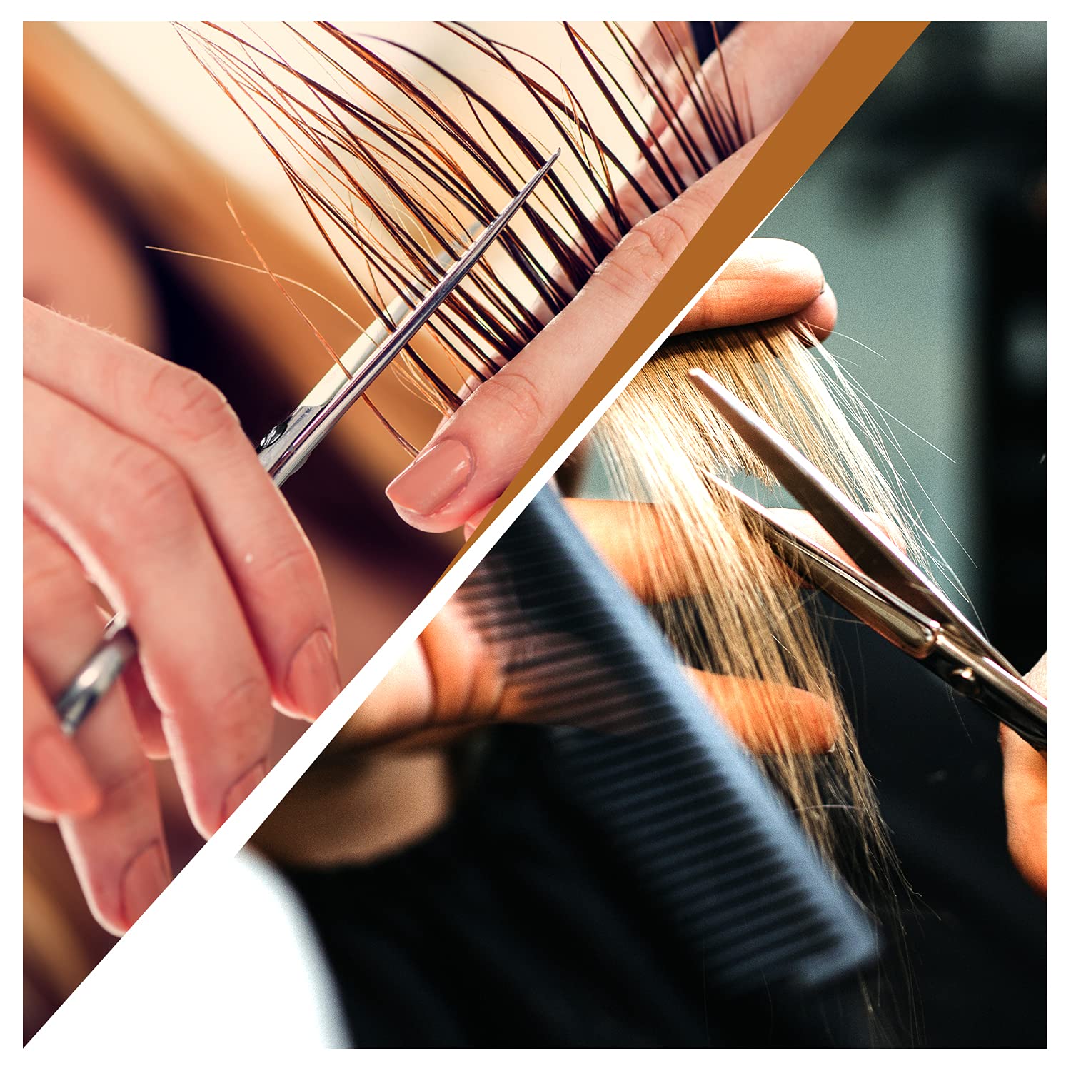 CONVENIENT DESIGN: The super sharp blades can easily trim hair and achieve desired results with ease. The ideal weight of scissors allows perfect balance and stability. Its smooth stainless steel texture and sharp blades don't let hair get caught.