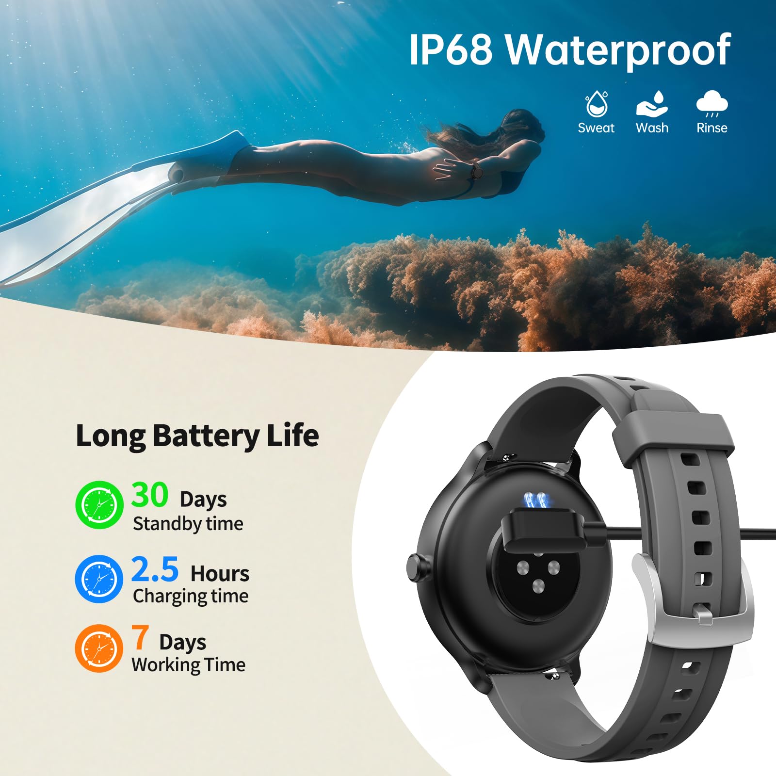 Waterproof Watch with IP68 & 7-Day Long Battery: DR03 Smart watch is IP68 rated waterproof, so you can wear it while washing your hands, face or daily sweating without worrying about water intrusion. (Do not use for baths, saunas, hot springs, etc.) Crafted with a 290mAh battery delivers 7 days of active use or 30 days standby. Multitask effortlessly: control phone music, set calculator, use alarms, and enjoy all-day health guard.