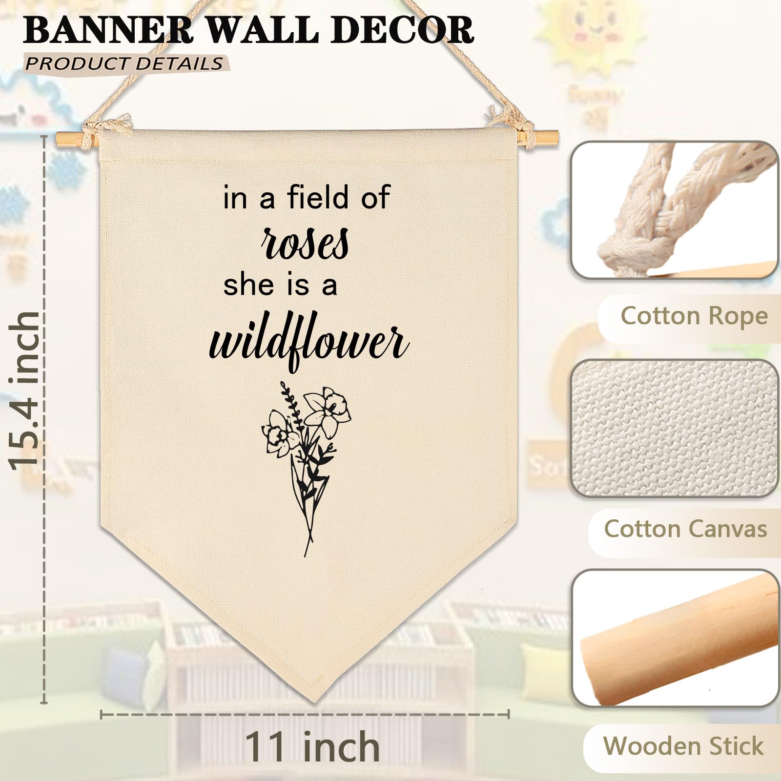Crafted from natural cotton canvas, this 15.4 x 11 inch nursery wall banner brings a soft and calming touch to baby room, above crib or toddler space. The durable fabric keeps its shape with a natural texture, while the clear print stays bright with everyday use. Lightweight and easy to hang, it comes with a wooden dowel and pre-tied twine for quick setup on walls, doors or shelves. The versatile size fits small spaces without feeling crowded, making it perfect for creating a cozy nursery atmosphere. A thoughtful gift for baby showers, newborn arrival or first birthday.