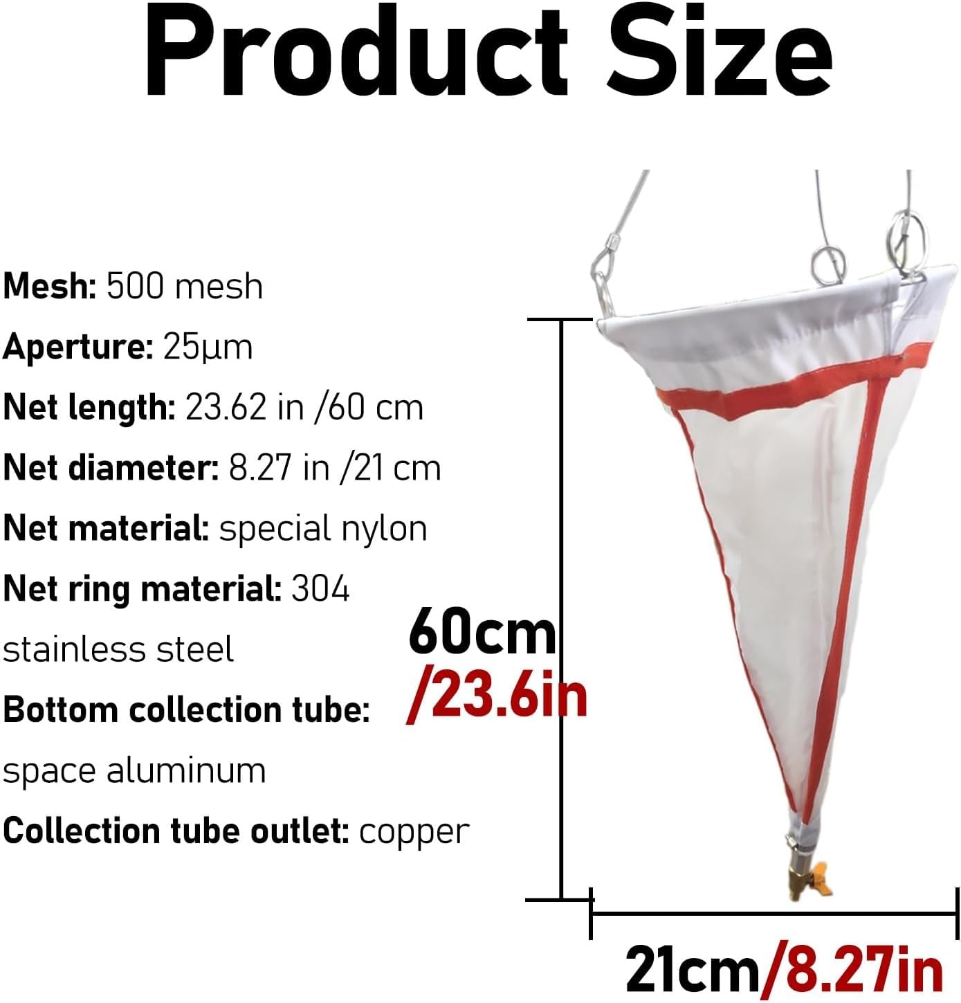 Parameters: Aperture: 25 μm, Net length: 23.62 in/60 cm, Net diameter: 8.27in/21 cm, Net material: special nylon, Net ring material: 304 stainless steel, Bottom collection tube: space aluminum, Collection tube outlet: copper