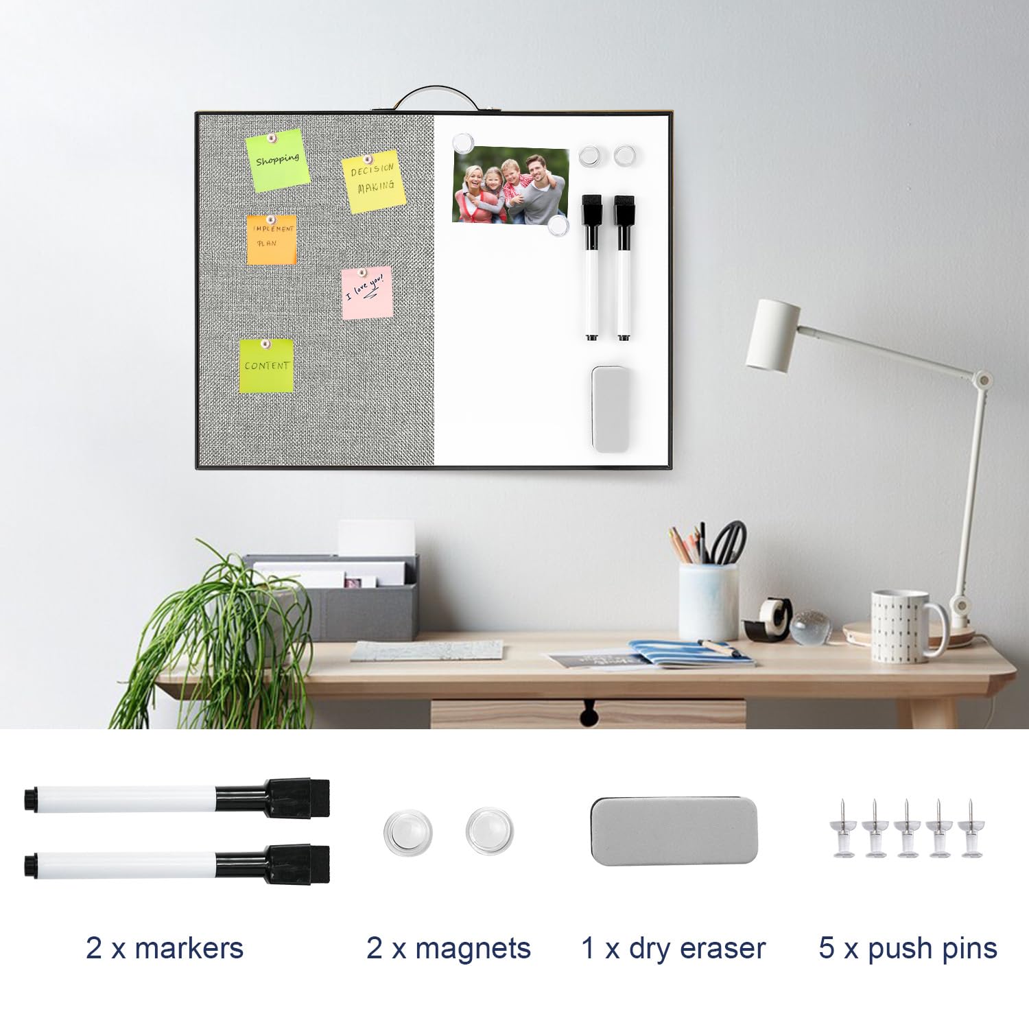 EXTRA ACCESSORIES: This bulletin board comes with 2 dry-erase markers, 1 eraser, 2 magnets, and 5 thumbtacks/push pins.