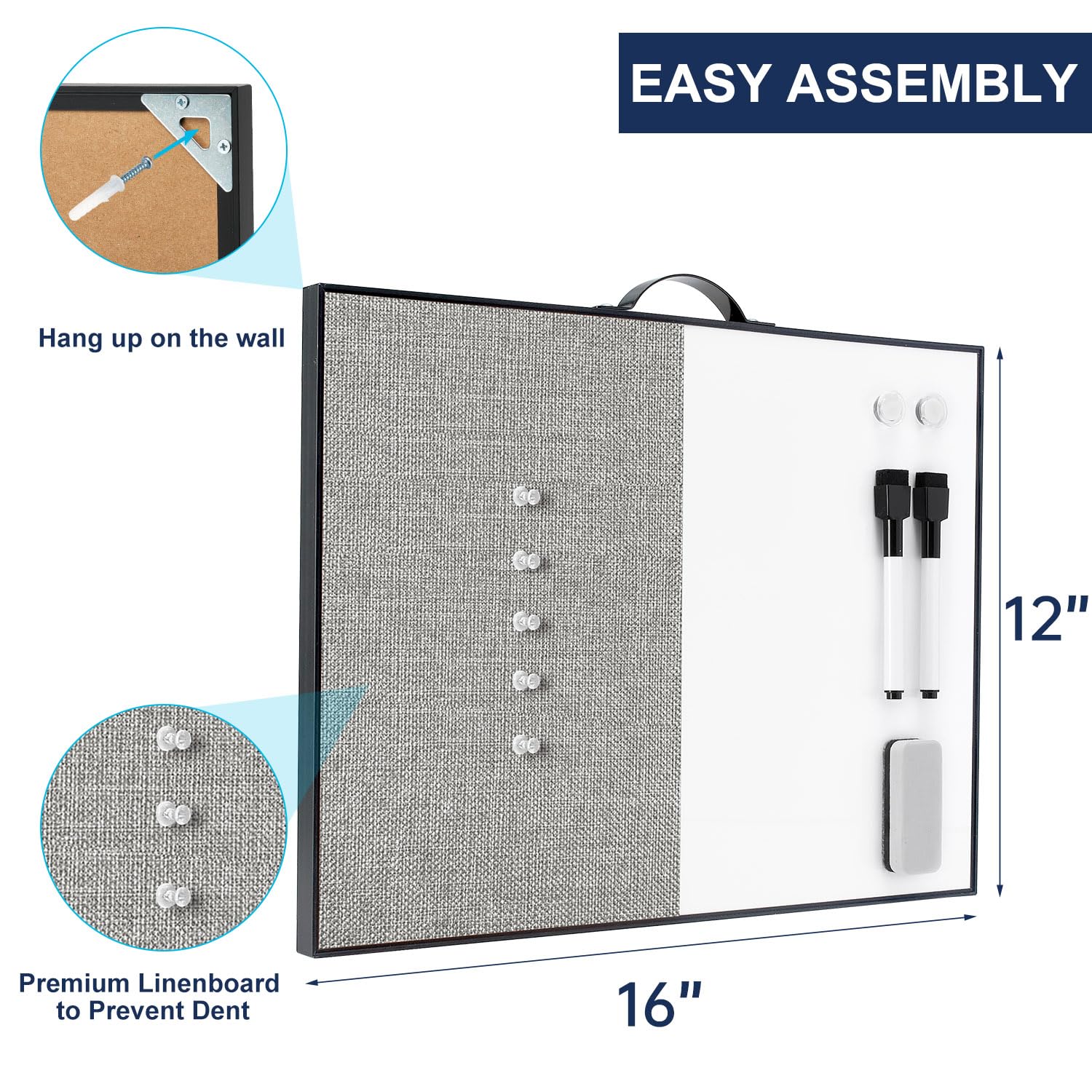 PREMIUM QUALITY: This 12" X 16" small whiteboard set includes dry erase board and linen board. The magnetic whiteboard comes with a smooth surface, easy to clean up and write on. The bulletin cork board is equipped with premium linen, fits all variety of nails and pins without damage to the cork.