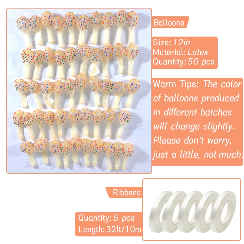 WHAT YOU GET: There are 50 pieces rainbow polka dots balloons and 5 white ribbons in the package. And our quick response service. If you have any problems, please feel free to contact us and we will respond as soon as possible