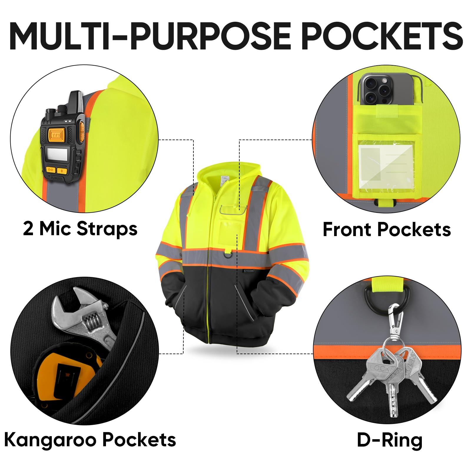 [VERSATILE DESIGN] This safety hoodie jacket not only prioritizes safety but also offers a fashionable and functional design. The classic kangaroo pocket design gets rid of bulky big pockets, the transparent card pocket on the upper left side allow you to conveniently store your work permit, ID card, and other essentials. The D-ring port can also be used to hang small tools and keys