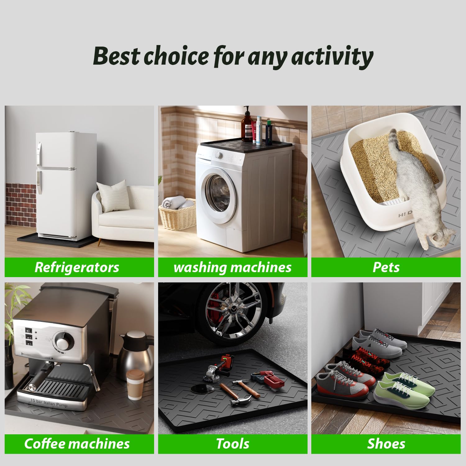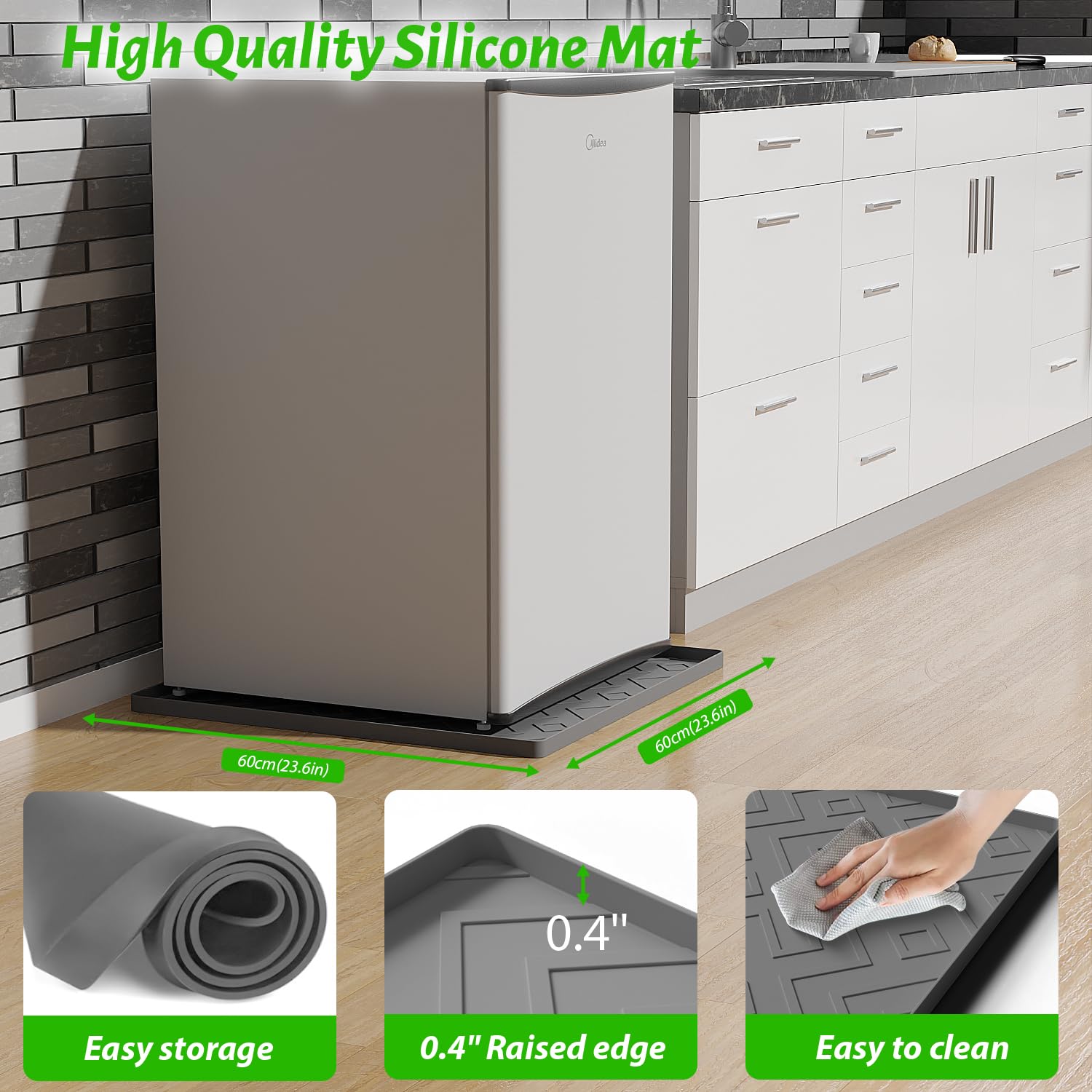 EWX Mini Fridge Silicone Mat 23.6"x23.6"x0.4" - Non-Slip, Spill-Proof, Drip Prevention Protect your home and appliances with the EWX Mini Fridge Silicone Mat. This versatile, high-quality mat keeps your floors clean and dry, making it ideal for mini fridges, washing machines, dryers, wine coolers, and dishwashers. Key Features: Non-Slip Design Our silicone mat features a robust non-slip surface that keeps your appliances securely in place, whether on tiles, hardwood floors, or floors. Spill-Proof and Drip Prevention Expertly designed to catch and contain leaks or spills, this mat keeps your floors clean and dry, protecting your surfaces from water damage. Easy to Clean Simply wipe it down with a damp cloth or rinse under running water. The durable silicone material resists stains and odors. Perfect Size With dimensions of 23.6"x23.6"x0.4", this mat provides ample coverage for most household appliances, offering reliable protection for a wide range of uses. Multi-Functional Use Ideal for mini fridges, washing machines, dryers, wine coolers, and dishwashers. Its versatility means you can use it wherever extra protection is needed. High-Quality Construction Made from premium, food-grade silicone, this mat withstands daily wear and tear, offering a long-lasting solution for your appliance needs. Why Choose EWX? At EWX, we are committed to providing high-quality, reliable products that meet your needs. Our silicone mat offers superior performance and protection for your home appliances. Product Specifications: Dimensions: 23.6"x23.6"x0.4" Material: Food-grade silicone Color: Gray Weight: Lightweight yet durable Package Includes: 1 x EWX Mini Fridge Silicone Mat Enhance the longevity of your appliances and maintain a clean, dry home environment with the EWX Mini Fridge Silicone Mat. Order yours today and experience the difference in quality and performance.