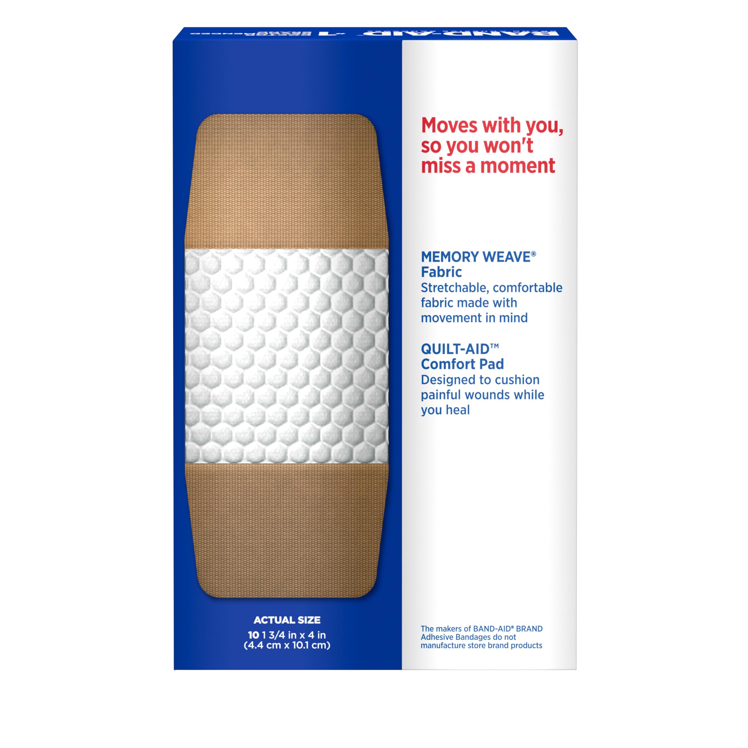 Try BAND-AID Brand Sterile Flexible Fabric Adhesive Bandages to cover & protect minor wounds, cuts, scrapes & burns. Made with Memory Weave fabric for comfort & flexibility, these first-aid wound care bandages stretch & flex as you move for all day comfort. Each fabric bandage features a Quilt-Aid Comfort Pad designed to cushion & protect painful wounds while you heal which may help to prevent re-injury. Made with a Hurt-Free Pad, these comfortable bandages won't stick to the wound as they wick away blood & fluids, allowing for gentle pain-free removal. From the #1 doctor recommended bandage brand, Extra Large Adhesive Bandages help protect against dirt & germs that may cause infection for up to 24 hours, making them a great addition to a first aid kit or wound care supplies. Plus, wounds covered with a bandage heal faster than uncovered wounds. For proper wound care, change bandage daily or when wet & treat wound with an antibiotic ointment such as Neosporin prior to application.