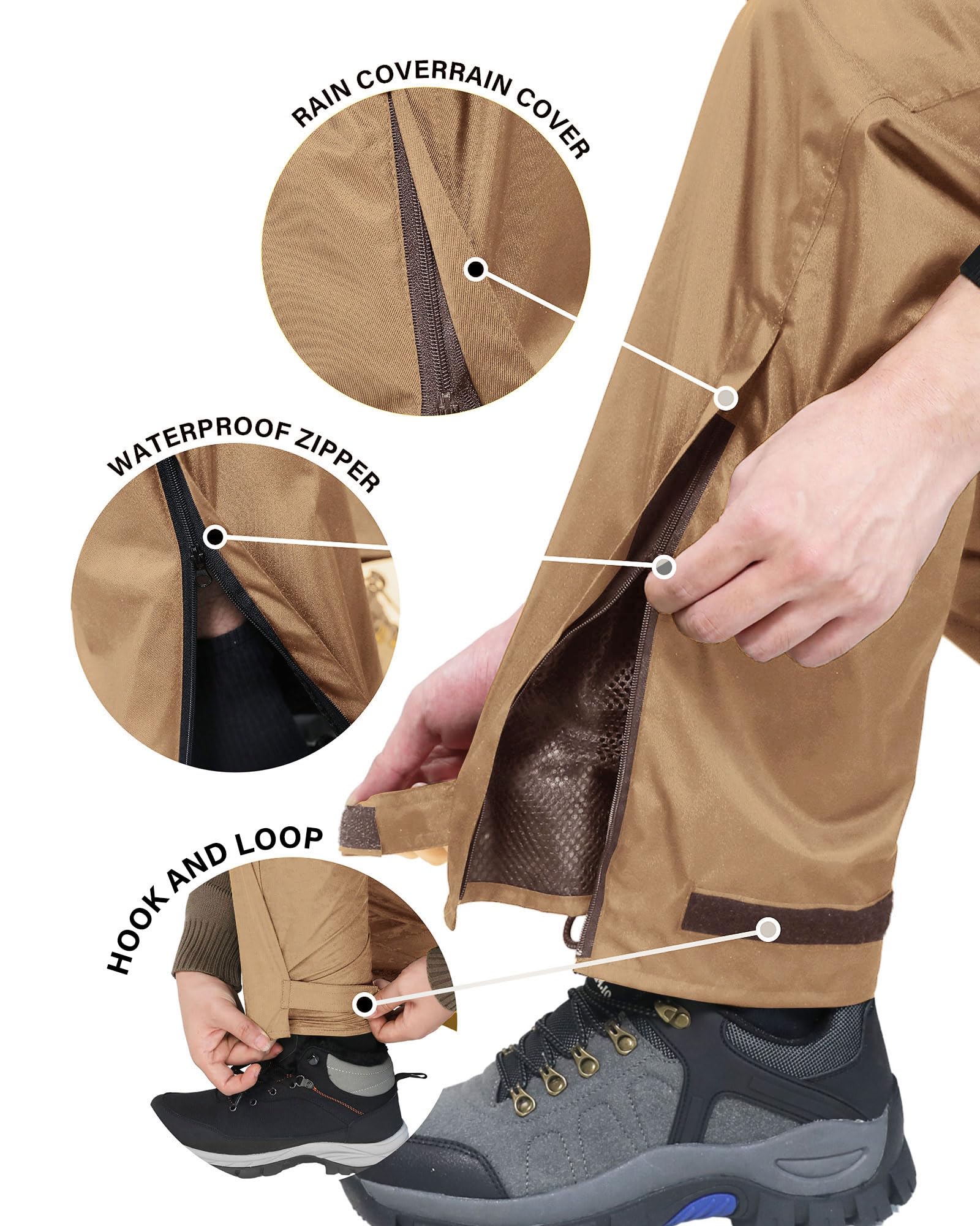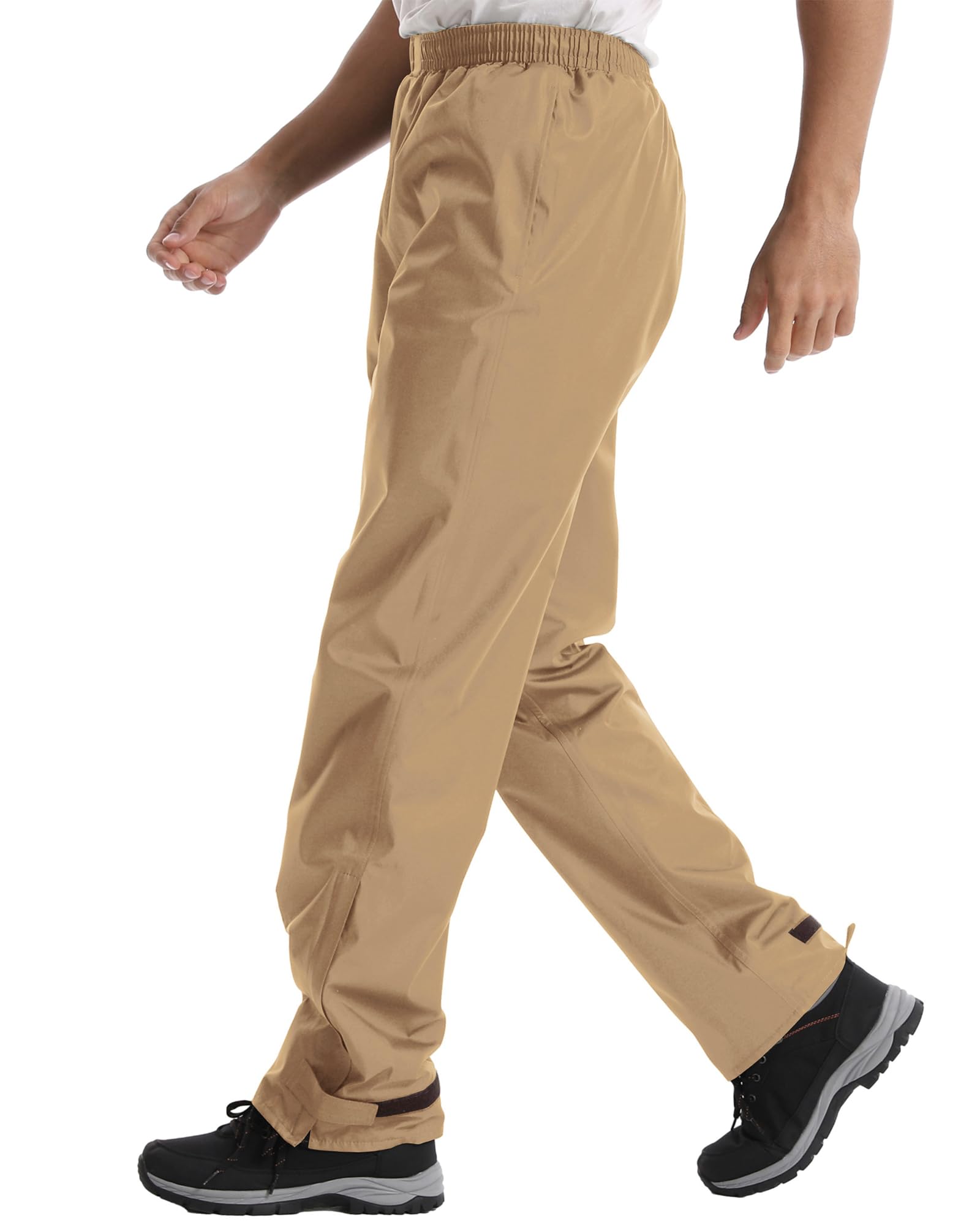Comfortable Fit: The rain pants are designed with zipper openings on the legs to easily put on and take off boots and shoes. The hook and loop on the legs is adjustable. There's a soft mesh layer in the lining, comfortable and breathable