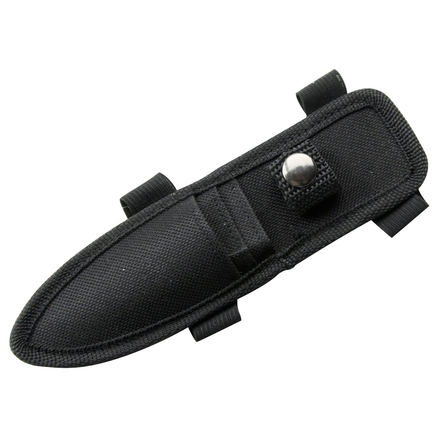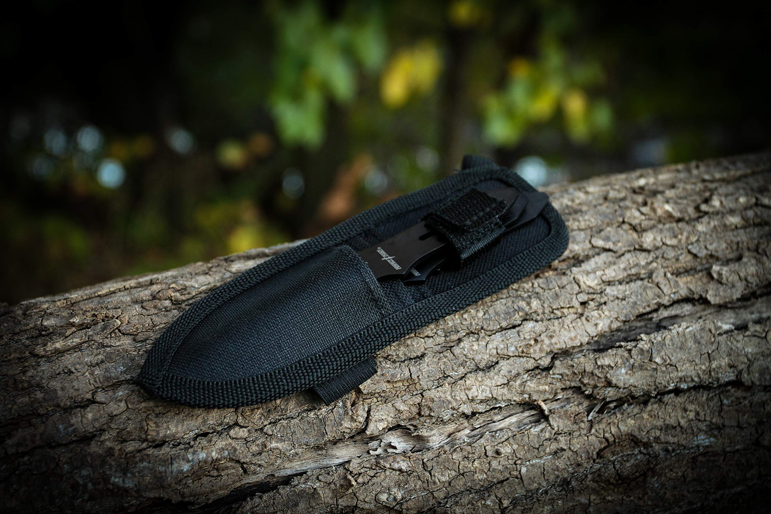 This is a 3-piece throwing knife set, the throwing knife is a single piece construction made of stainless steel, designed specifically for target throwing sport. The blade grinding produces a pointy and strong blade tip that is good for sticking into a target board. The same blade grinding also result in a shallow and thick edge which is not proficent in any utility cutting tasks. The handle is designed to be longer than the blade and without scales in order to achieve optimized flying stablization rather than cutting ergonomics. Throwing knife over length is 5.5", the set comes in with a black nylon sheath