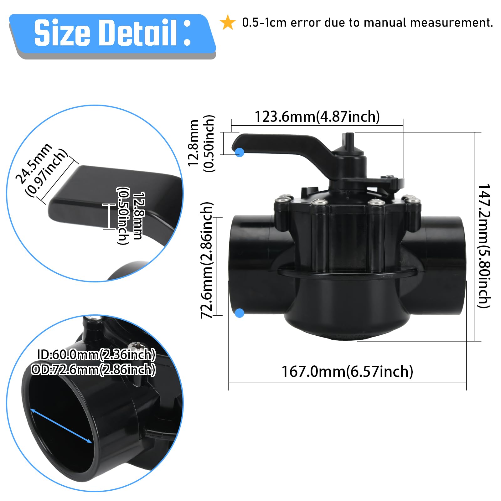 【WIDE APPLICATION】: 2 inch 3 way pool valve is compatible Jandy 4717 never lube diverter valve; 2 to 2-1/2-inch; 2 inch pipe slip fits into the valve ports and the 2-1/2-inch slips on the outside of the valve ports