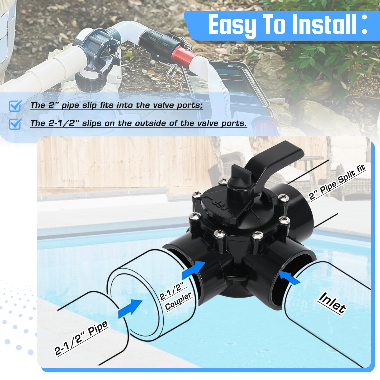 【EASY TO INSTALL】: The 2" pipe slip fits into the valve ports and the 2-1/2" slips on the outside of the valve ports, and 2-1/2" pipe can be connected to 2-1/2" pipe coupler, 45° or 90° fittings. No need for grease or lubrication, supports direct replacement of faulty valves, saving time and money