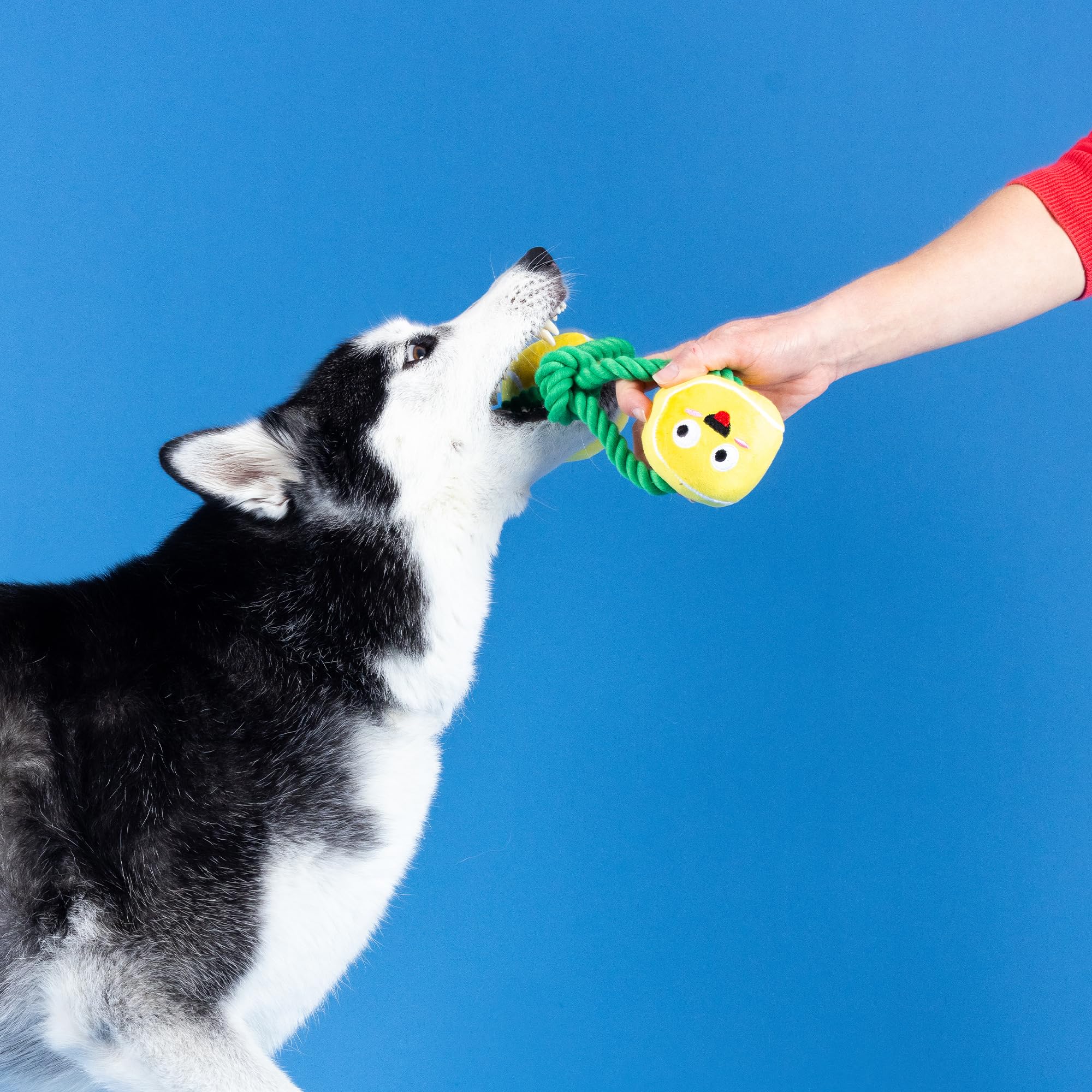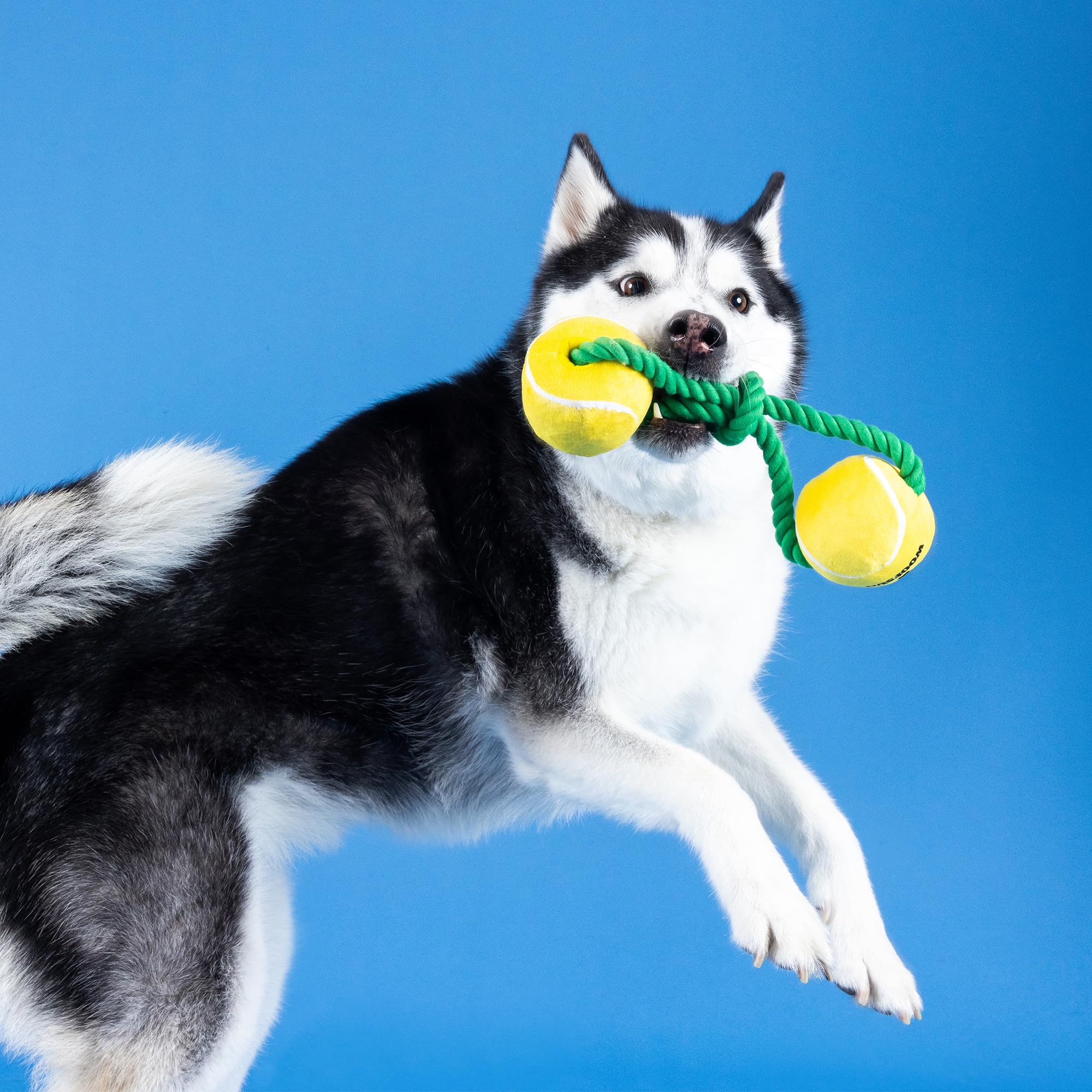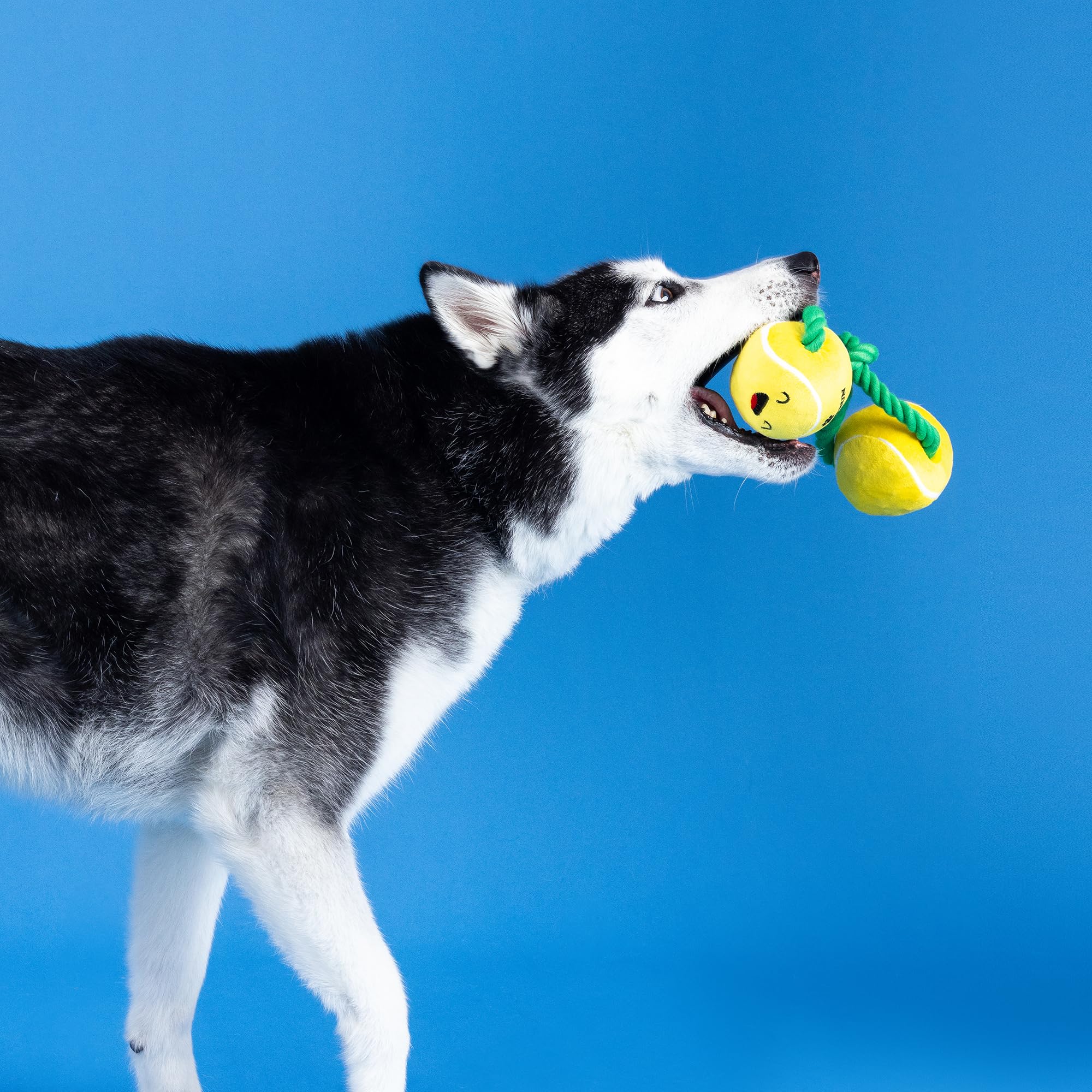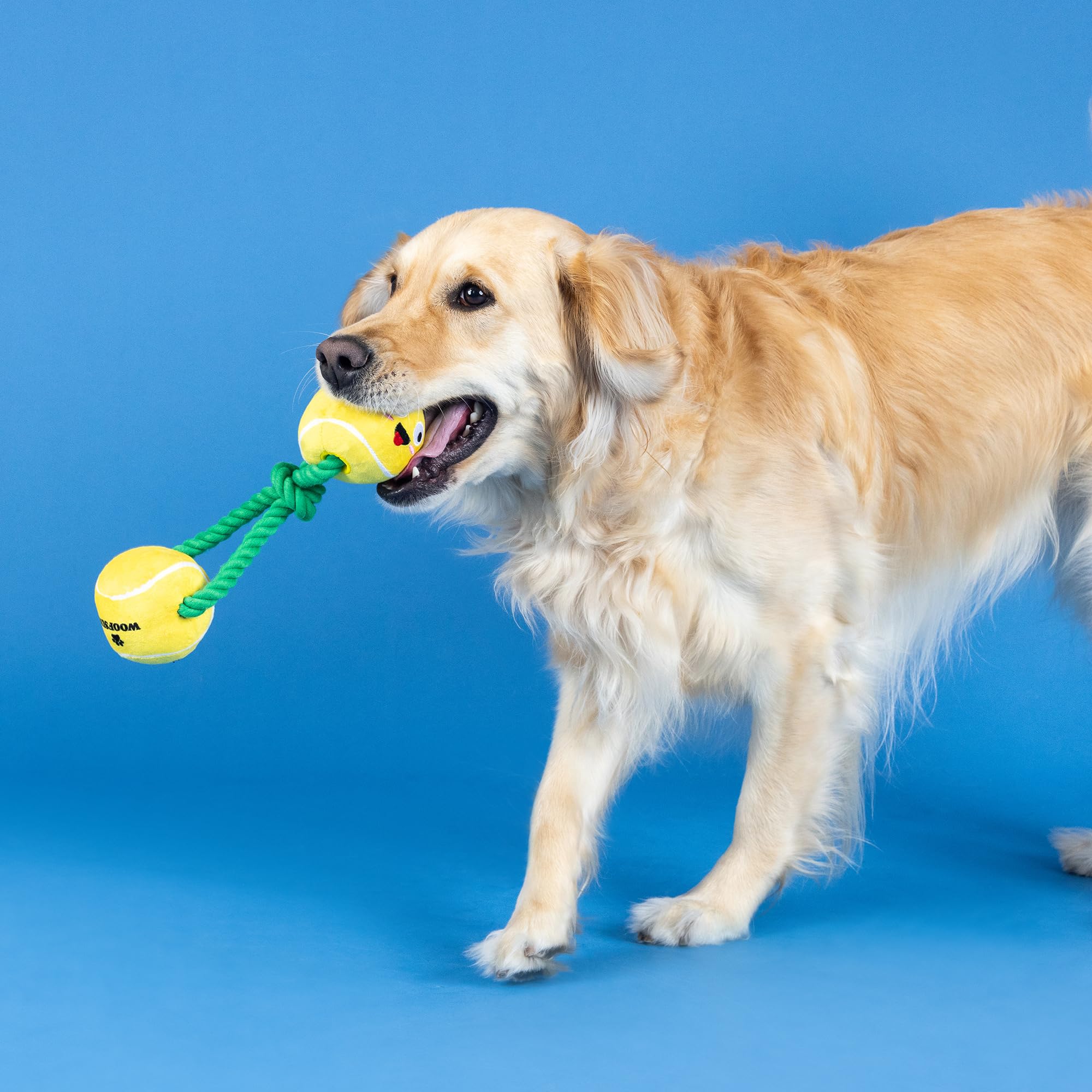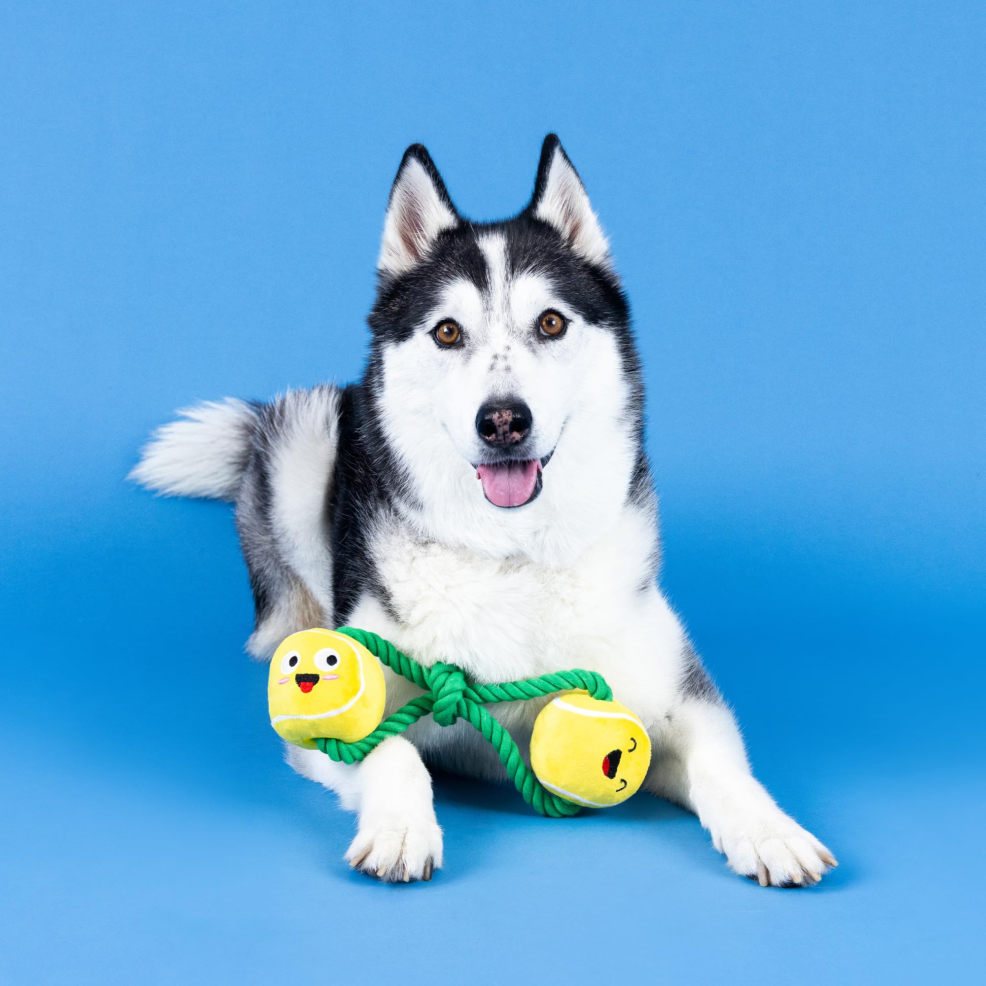 Welcome to Wagsdale! The “Game, Set, Match” plush toy is for pups that love sports. Made with 2 super loud squeakers, crazy crinkle paper, and tuggable rope, this toy was designed with interactive play in mind. Whether you squeak, crinkle, tug, or toss it, it'll really serve your pup during playtime. Great for all dog sizes and not intended for aggressive chewers.