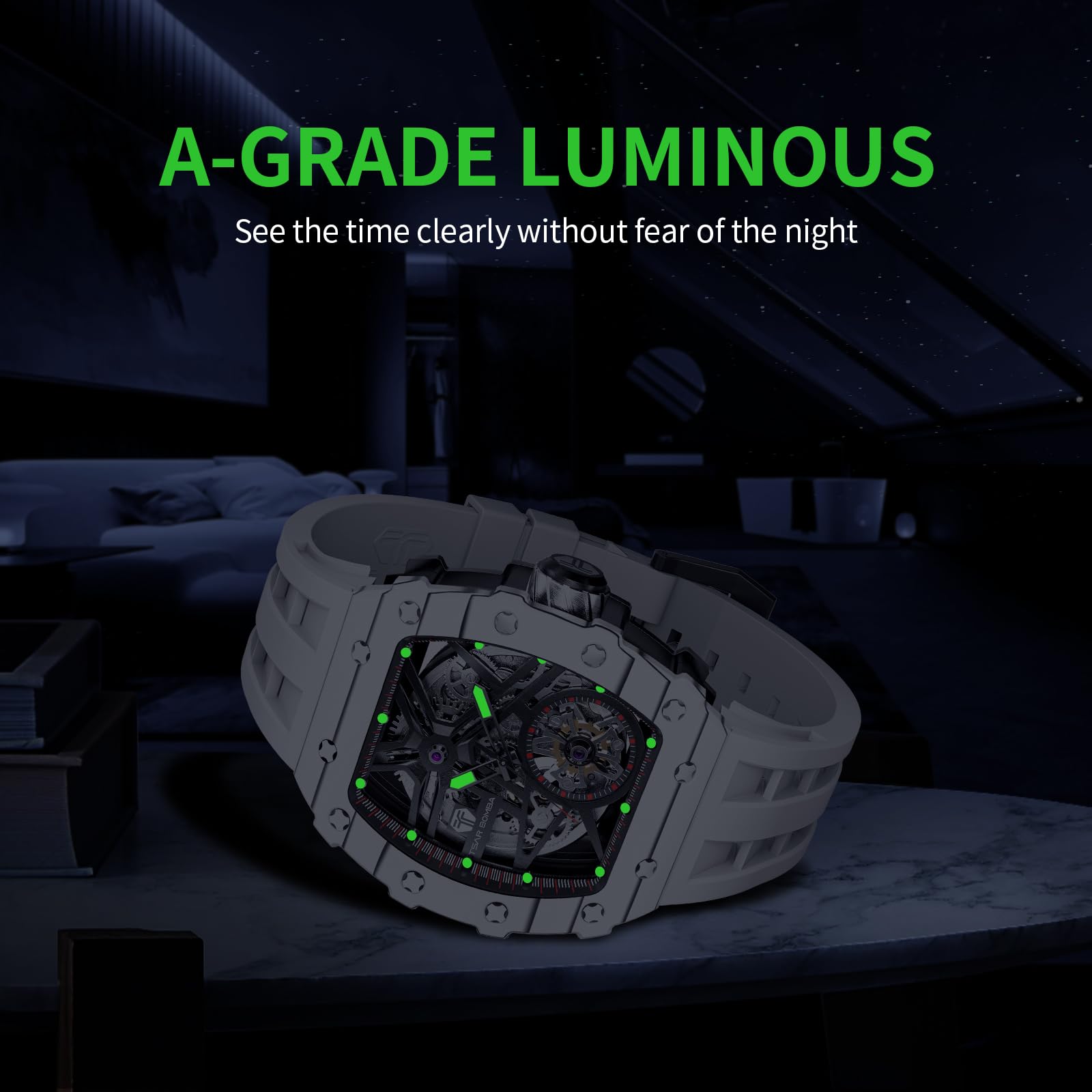 💦【Fluorine Rubber Strap & Waterproof 5ATM】Comfortable,durable,flexible and elastic FKM rubber strap, softer and more flexible than natural rubber or TPU, it is a better choice for you guys. All tested for waterproof, innovative enhanced anti-fog. Waterproof to 5BAR, the watch can be used for cold water, rain and daily water splash. Luminous pointer design, environmentally friendly luminous coating, fast light absorption.