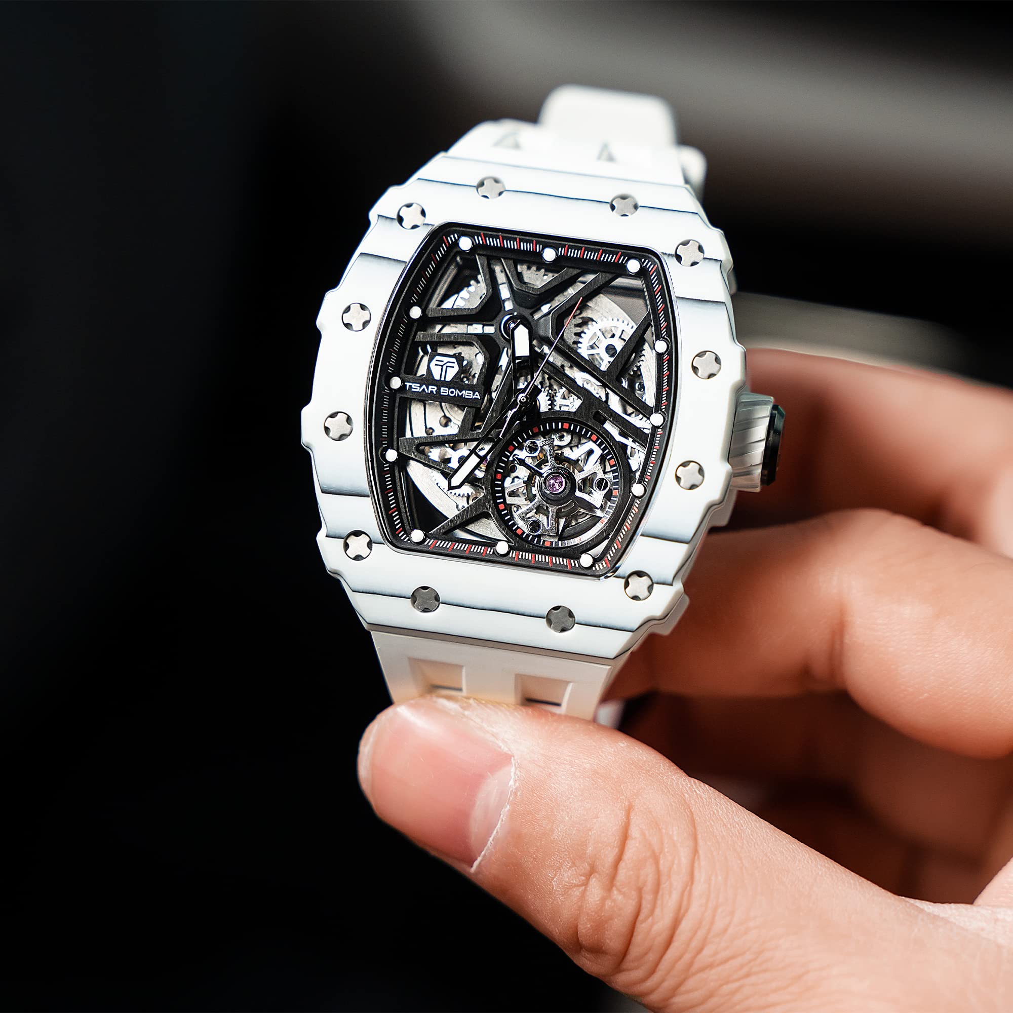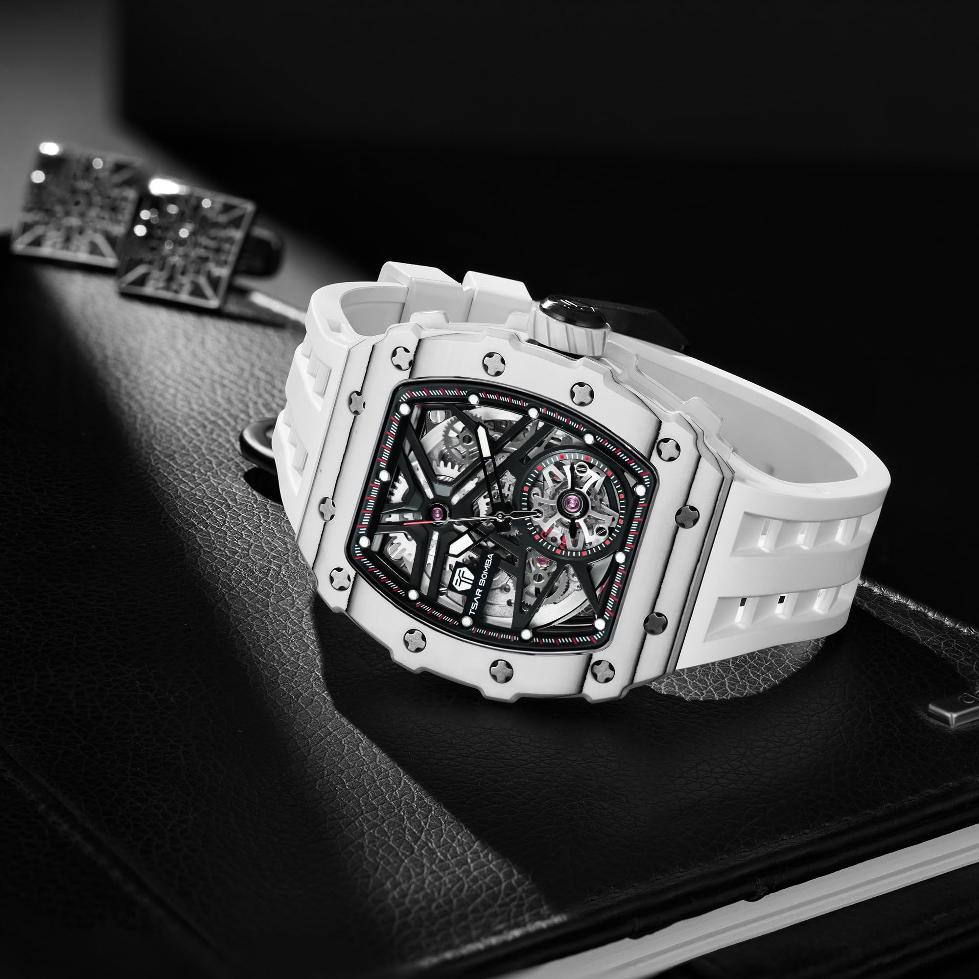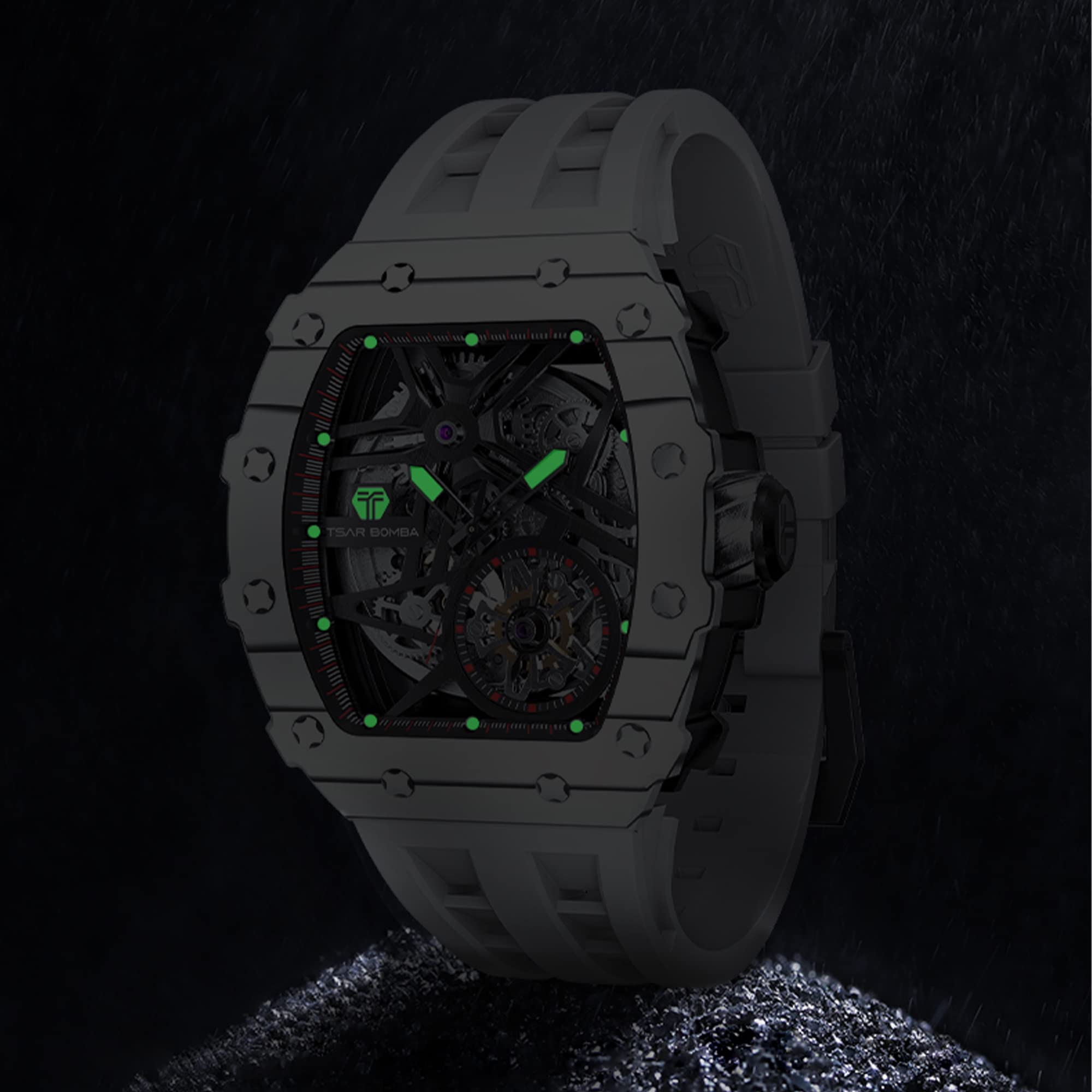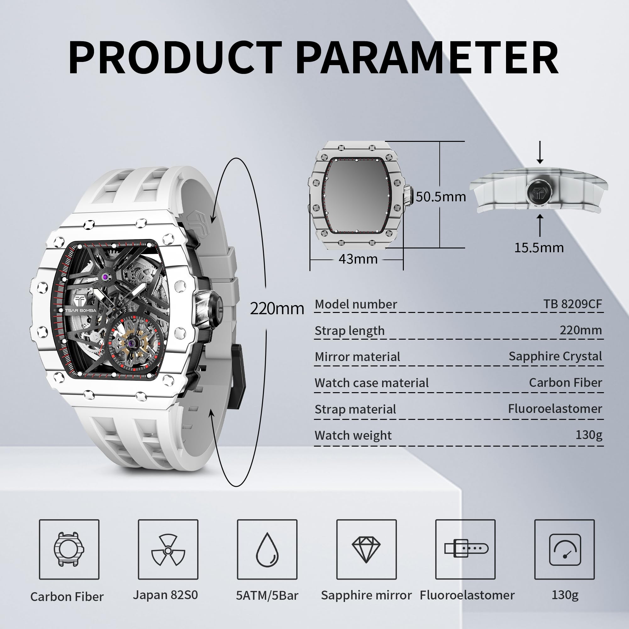 ✨【TSAR BOMBA 8209-STAR Guardian】Upgrade lighter aerospace grade hard material-frame of carbon fiber which ensure ideal shock resistance. T-Series-8209 born in the Sino-German Force Lab.A subtle crystallization of watchmaking craftsmanship and high-tech materials.International award for barrel-shaped design, Ergonomic fit. With double-sided high-transparent hollow design, allowing you to have a high-definition and transparent mechanical sense of sight, all the exquisite designs at a glance.