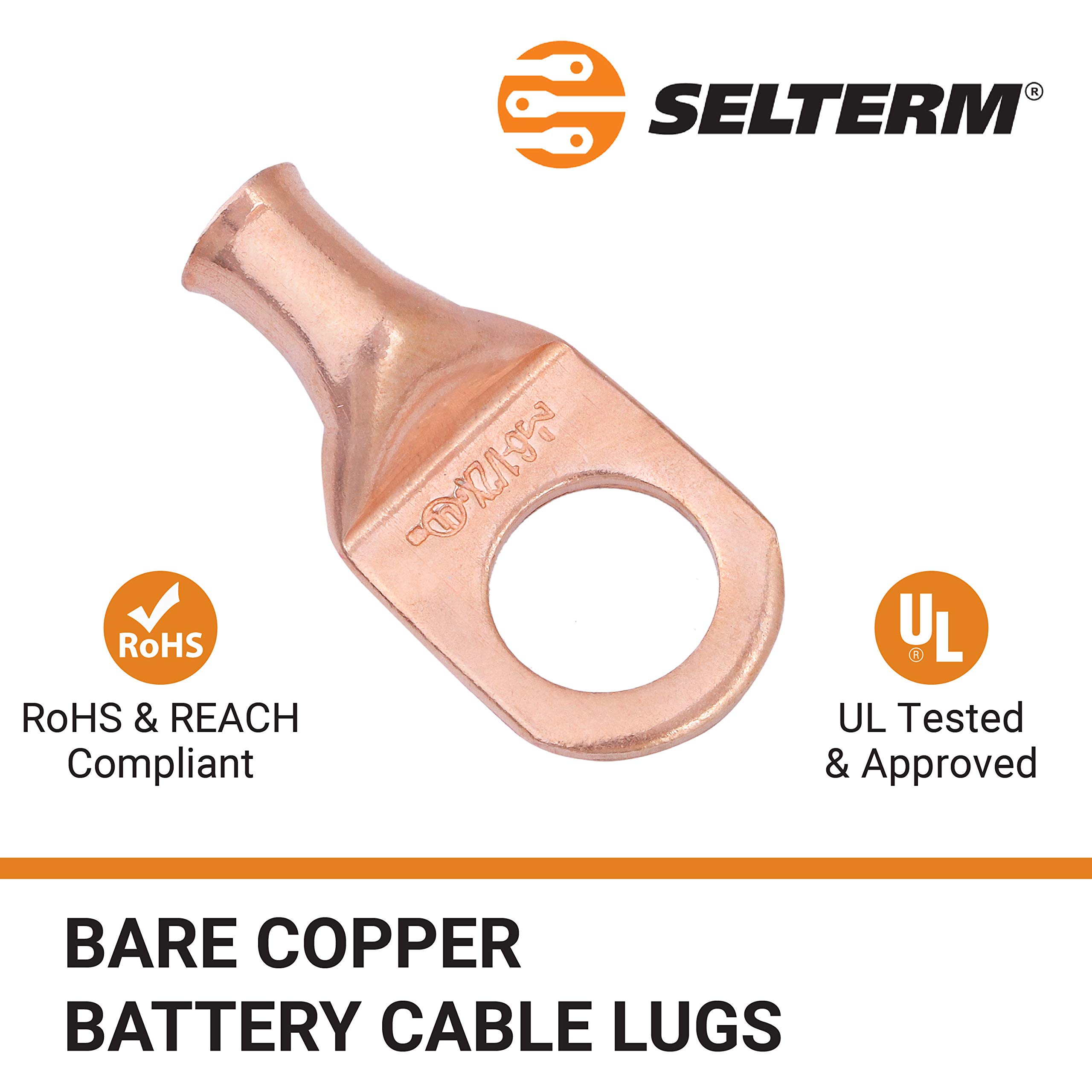 PERFECT FIT: Selterm provides freedom to choose from a wide range of wire sizes, stud sizes, and pack quantities from 2 - 25 pcs best suitable for all requirements and applications as battery connectors; Superior material quality of copper terminals lugs can be crimped or soldered; Use with a compatible copper cable; Audio wire may not be a direct fit; Recommend to check product dimensions to ensure a proper fit of the connectors