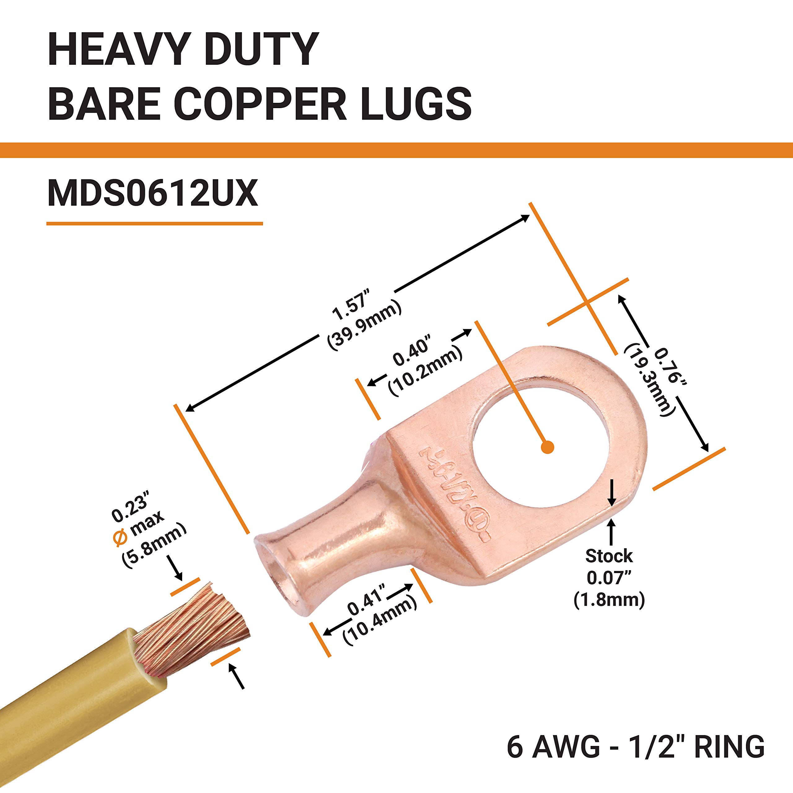 PACKAGE CONTENTS: 2 PCS of Heavy Duty Bare Copper 6 Gauge (AWG) 1/2" Ring Battery Terminal Connectors / Lugs; 100% annealed copper, providing a high degree of conductivity for maximum current flow when used as battery terminals