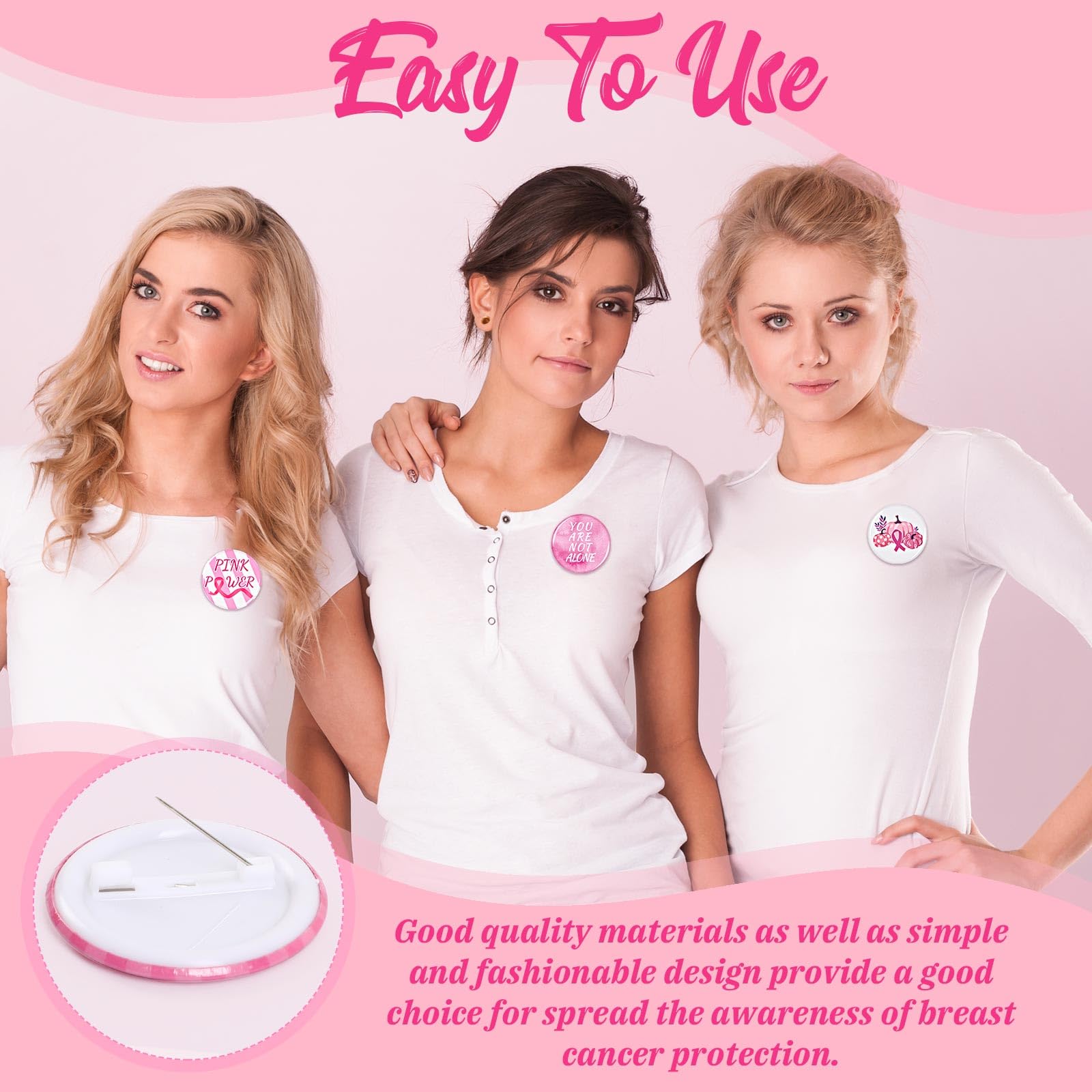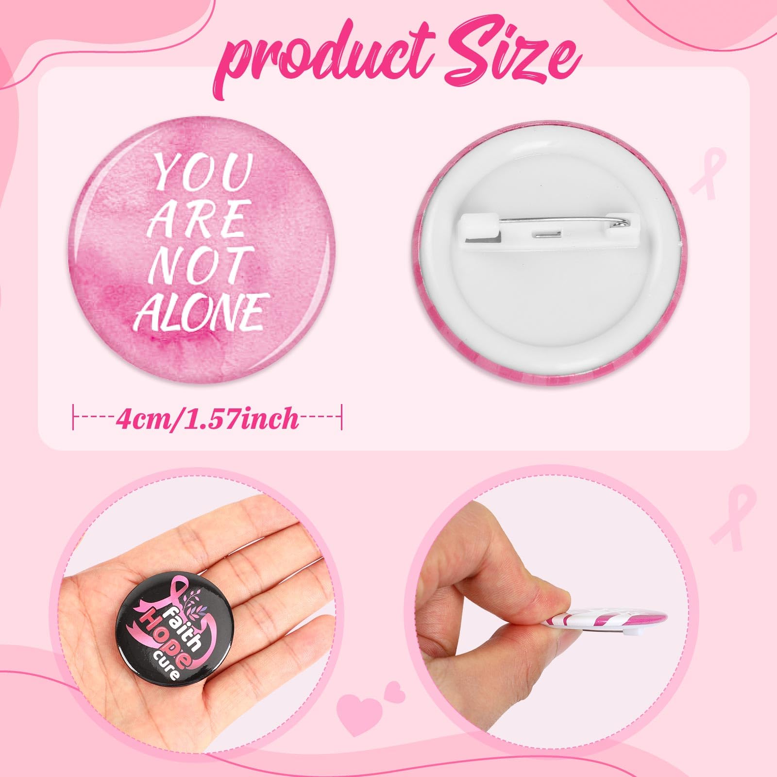 [Good Quality Materials] The breast cancer awareness buttons badges are made of good-quality plastic. The breast cancer pins with a diameter of 4cm/1.57inch is made of lightweight material, which are not easily deformed and easy to handle. Pink ribbon awareness breast pin features a rich pattern printed on the surface and won't fade easily