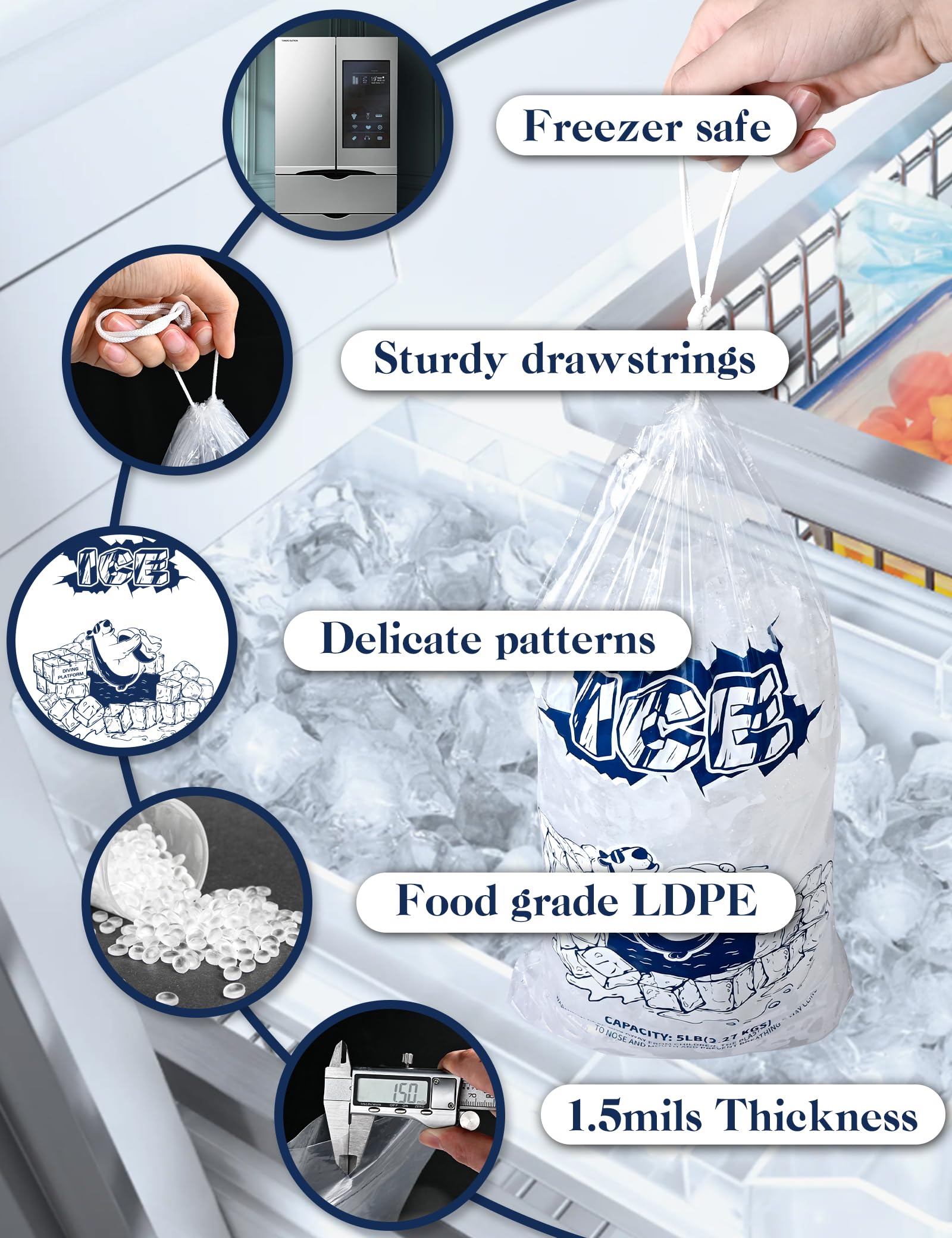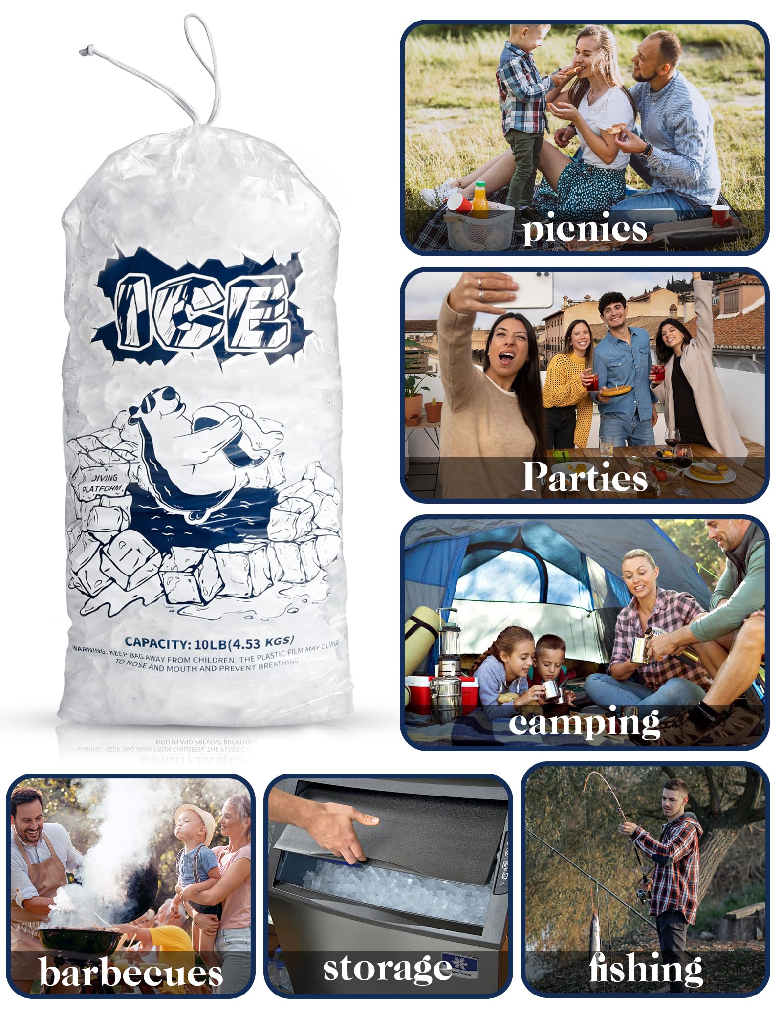 【Convenient Drawstring Closure】Our ice bags have a super convenient drawstring closure that lets you quickly seal the bag in seconds after the ice is filled, preventing any dust and dirt from ruining your ice. The drawstring turns into a carrying handle immediately after sealing, making it easy for you to transfer the ice quickly. In addition, the drawstring closure allows you to open and reseal the bag effortlessly, allowing you to use the ice as you wish.
