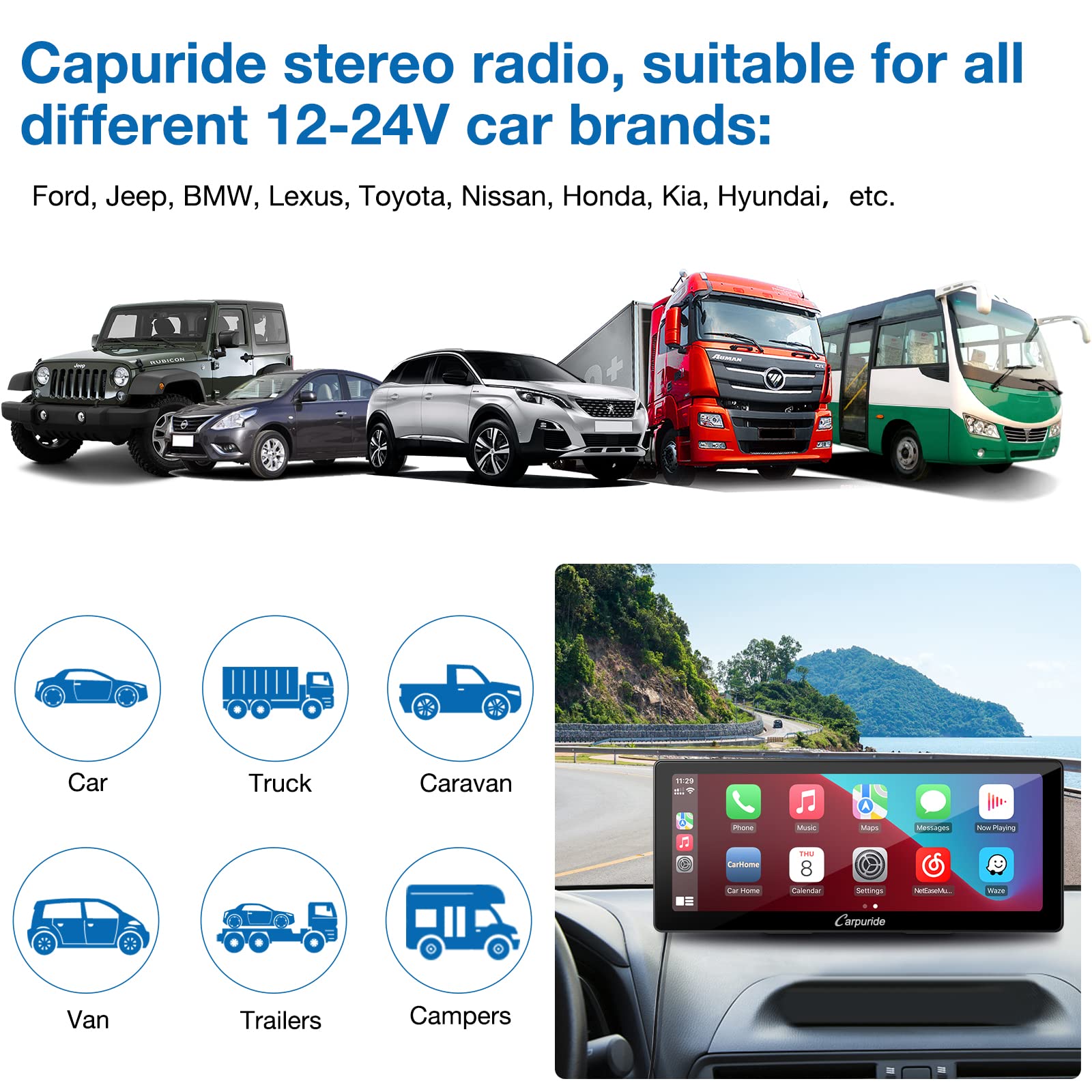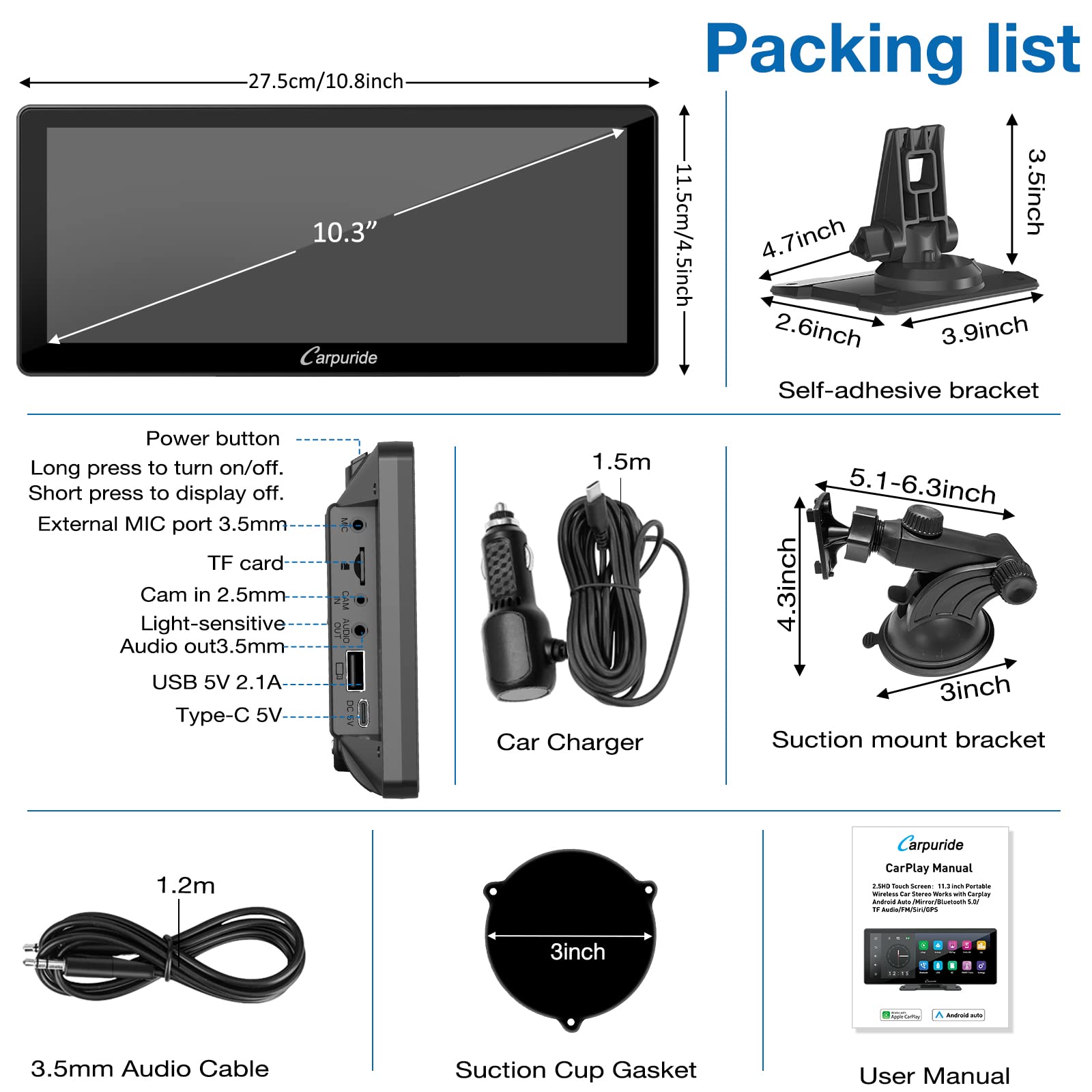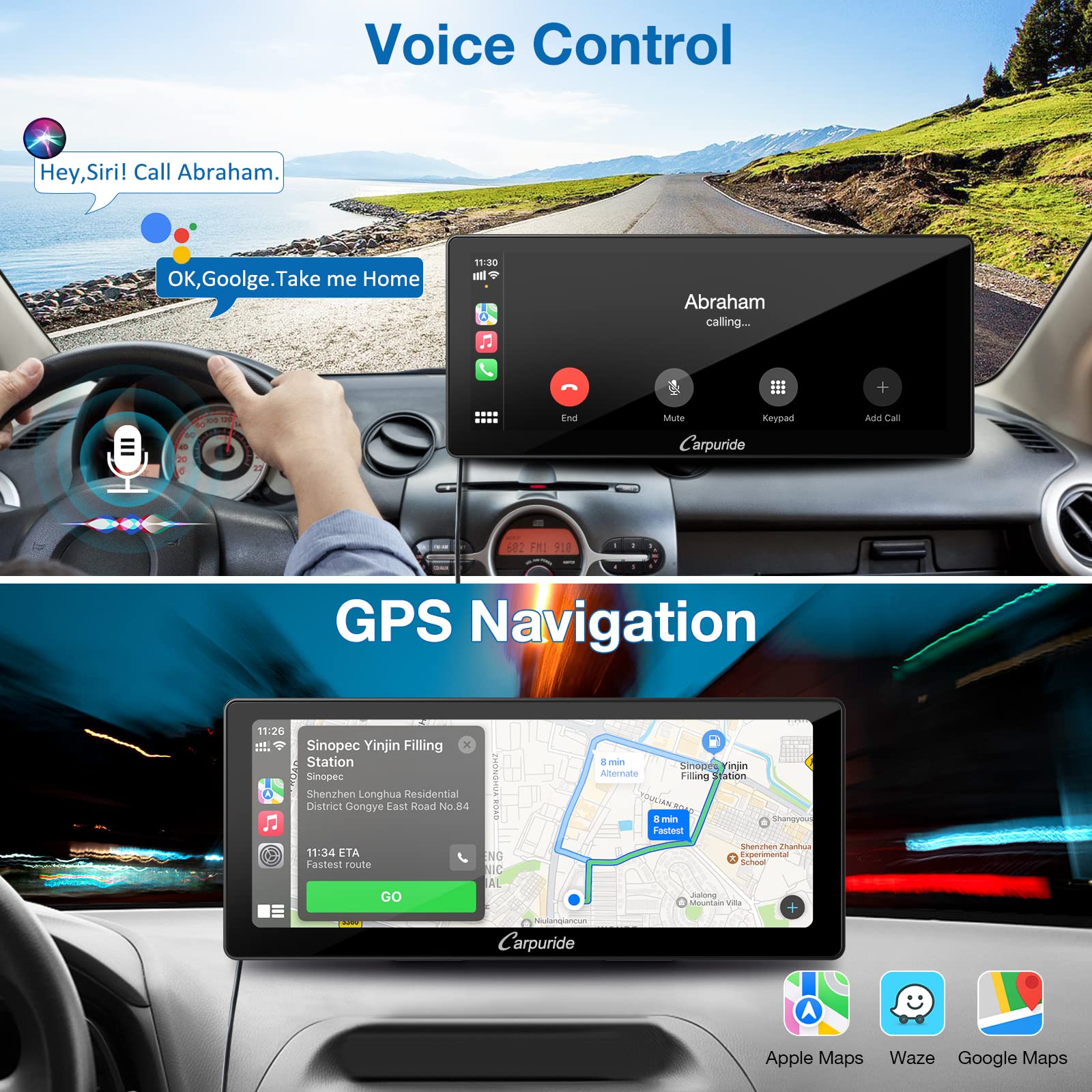 Wirelessly 10.3 inches IPS Smart Display - Carpuride 103 portable car stereo compatible with Carplay & Android Auto. After link wirelessly, puting all your phone’s best features in a clean, safe, and easy-to-use hd touchscreen, wirelessly handle gps navigation, messaging, phone calls, bluetooth music, Siri. Never worry about heating and battery damage caused by using your mobile phone for navigation for a long time.