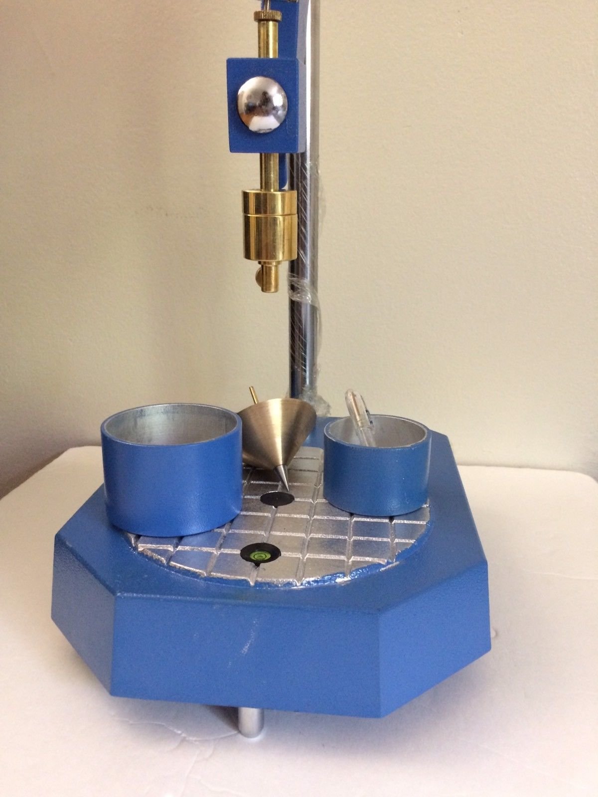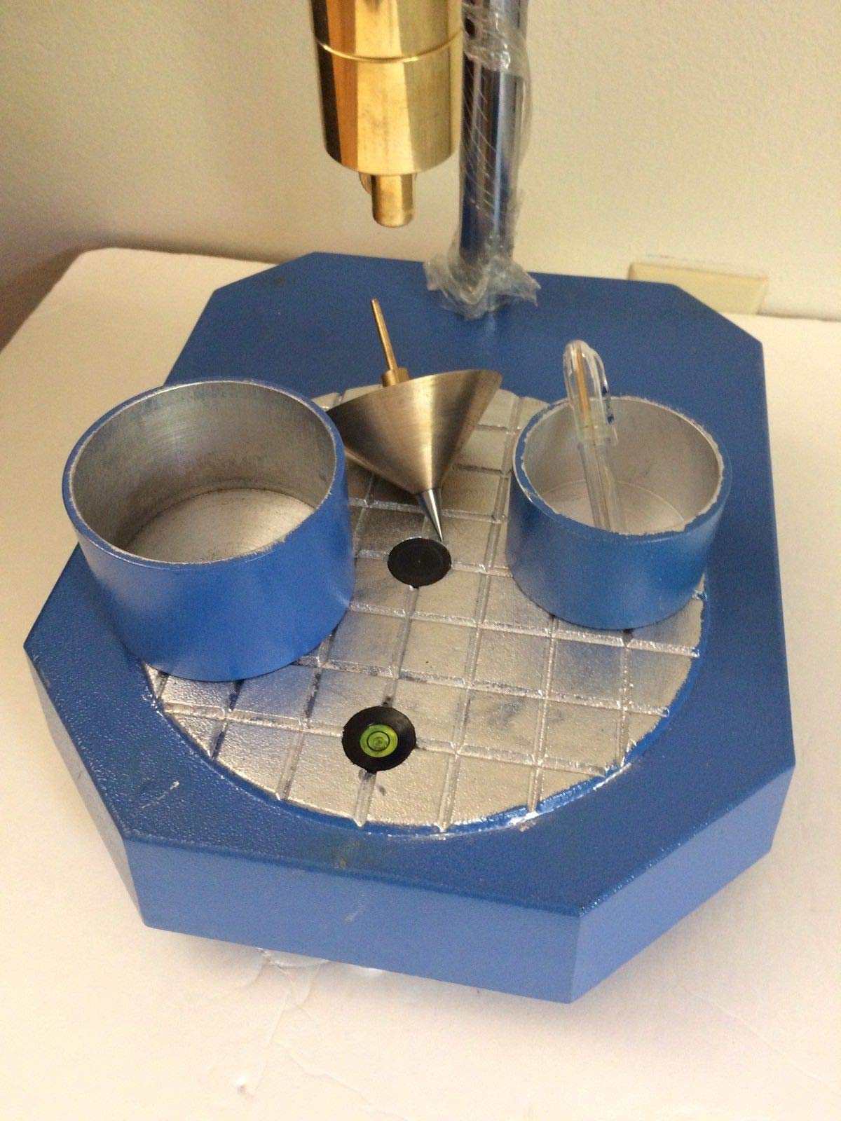 Standard Penetrometer consists of a vertical pillar mounted on a base provided with leveling screws. The head, together with dial plunger rod a cone (or needle) slides on a pillar and can be clamped at any desired height. A rack and pinion and pointer assemble provides fine adjustment of needle or cone tip to sample.