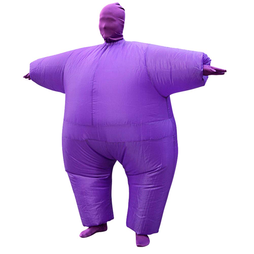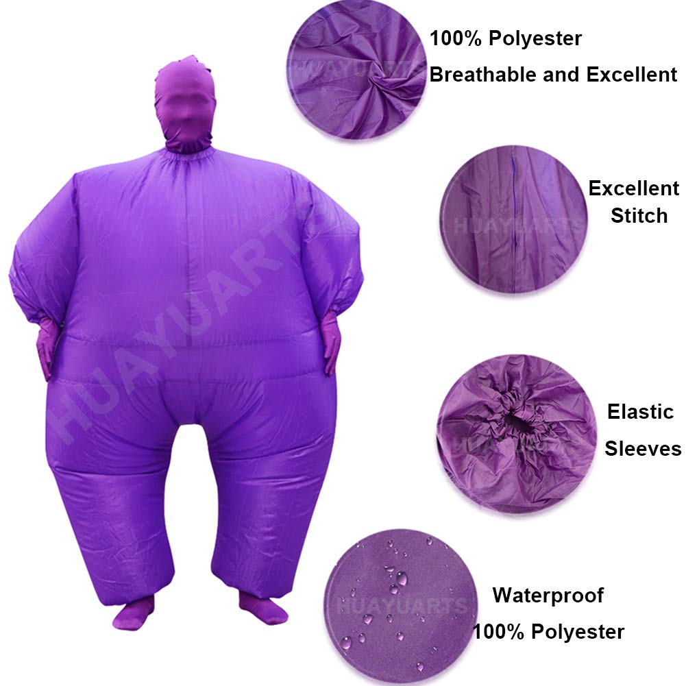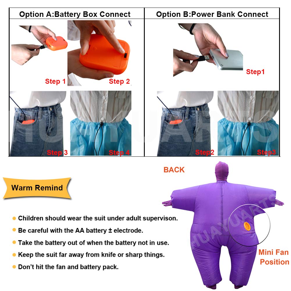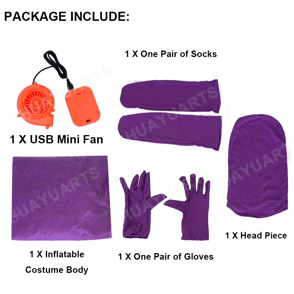 Includes inflatable full body suit, head piece, gloves, socks and air-filled fan powered by batteries or USB