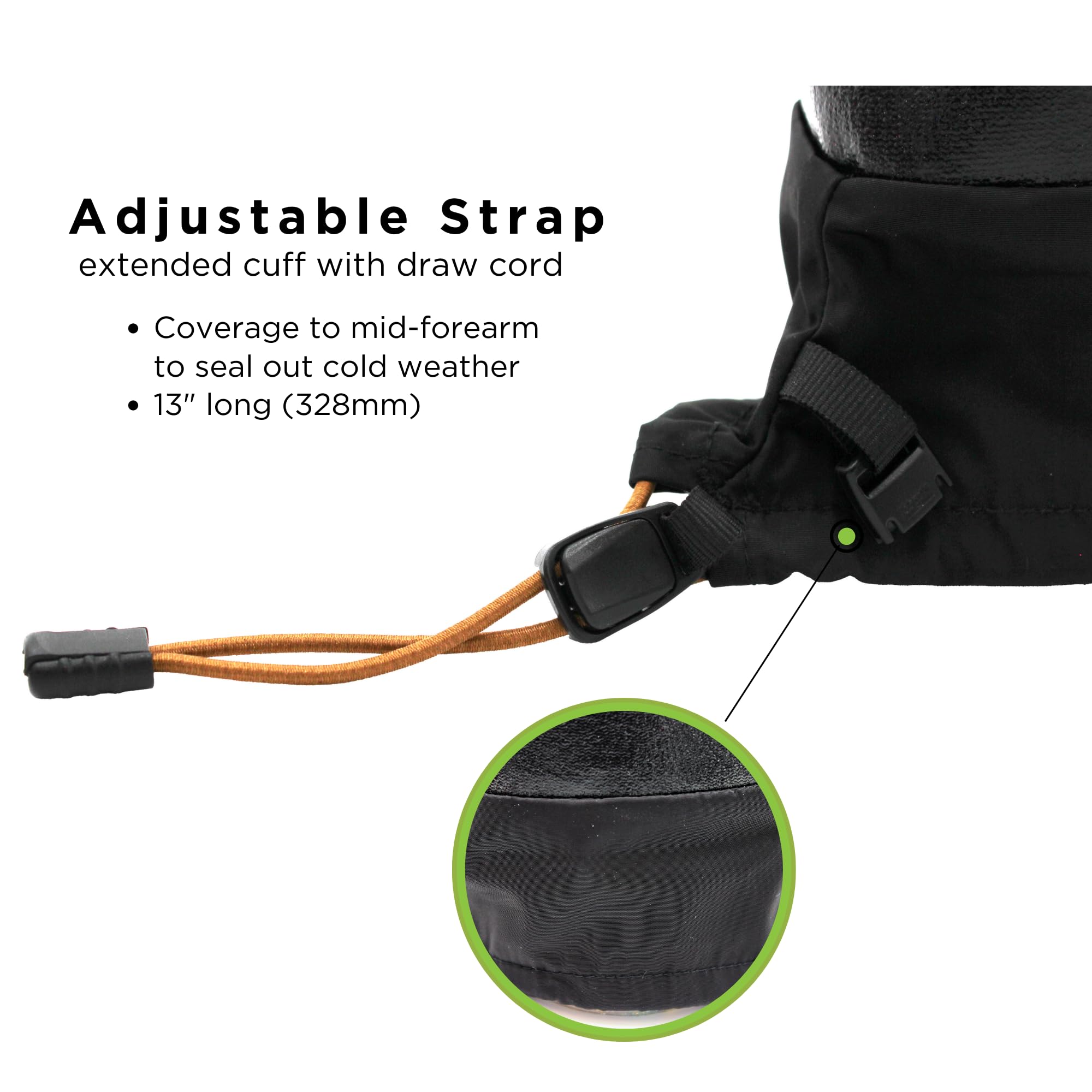 Integrated Cuff And Drawstring: The 282-02 model features a built-in nylon sleeve with an adjustable drawstring toggle. This cuff seals tightly around your arm or jacket sleeve to keep out snow, ice, and debris, making it perfect for deep-snow activities and harsh winter wind.