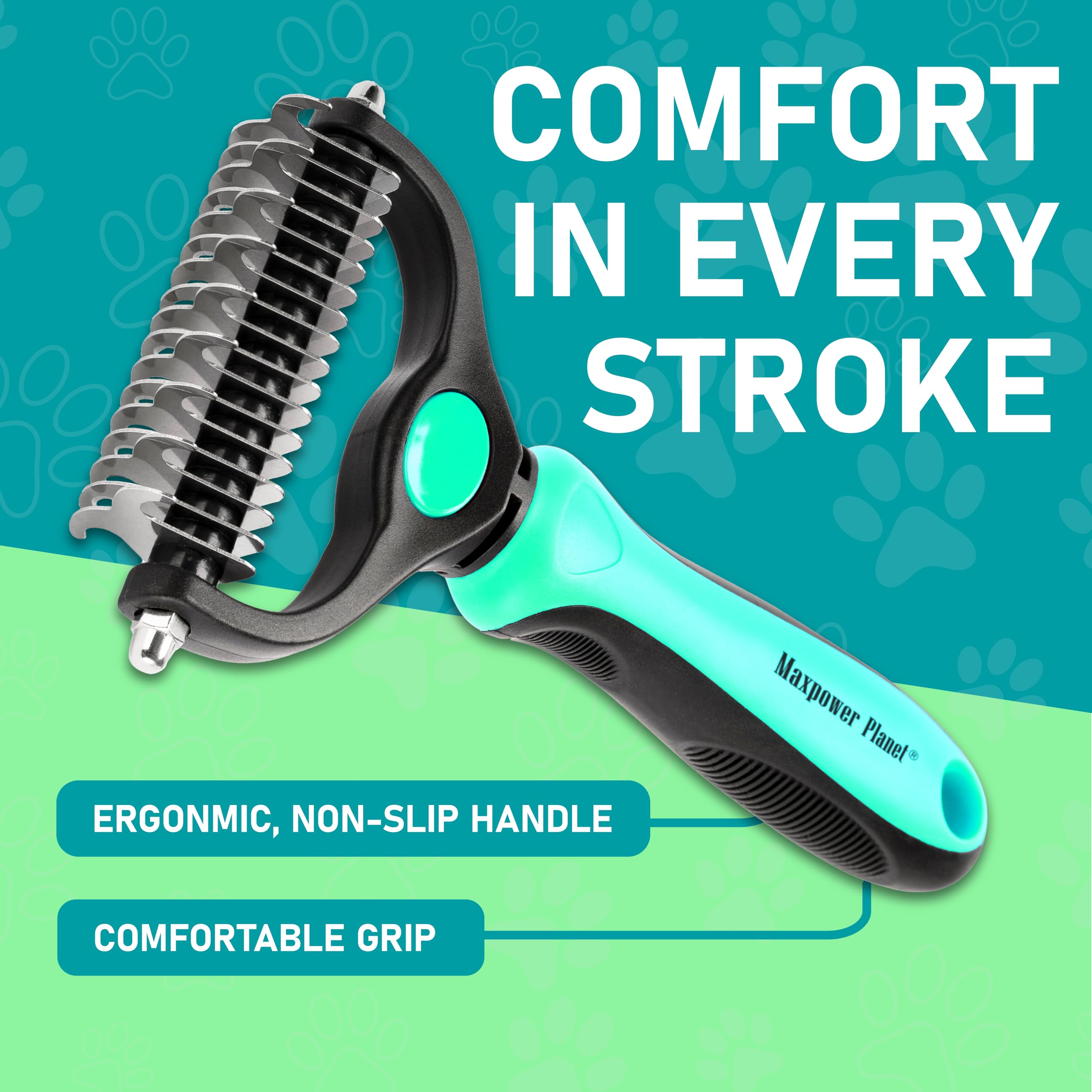 DUAL-SIDED DESIGN: Our grooming brush is perfect for dematting and deshedding your pet's coat! With a dual-sided design, use the 9-teeth side to tackle stubborn mats and tangles and the 17-teeth side to thin out and deshed your pet's fur.