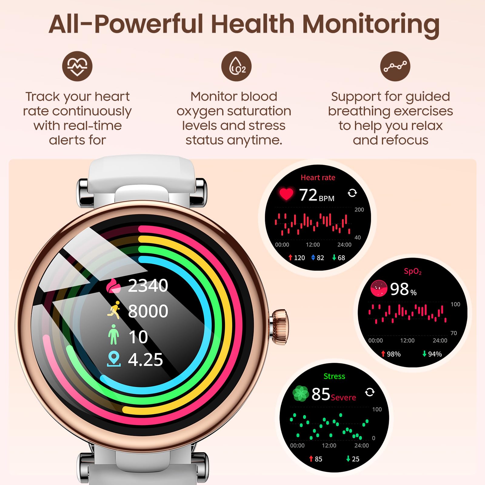 [Comprehensive Health Tracking] Supports 24/7 continuous monitoring of heart rate, blood oxygen saturation, and stress levels (non-medical grade), providing real-time insights into your body's changes. Whether during daily activities, work sessions, or nighttime rest, the watch automatically records relevant data and alerts you promptly when abnormalities occur. View trend analysis through the companion app for a complete health overview.