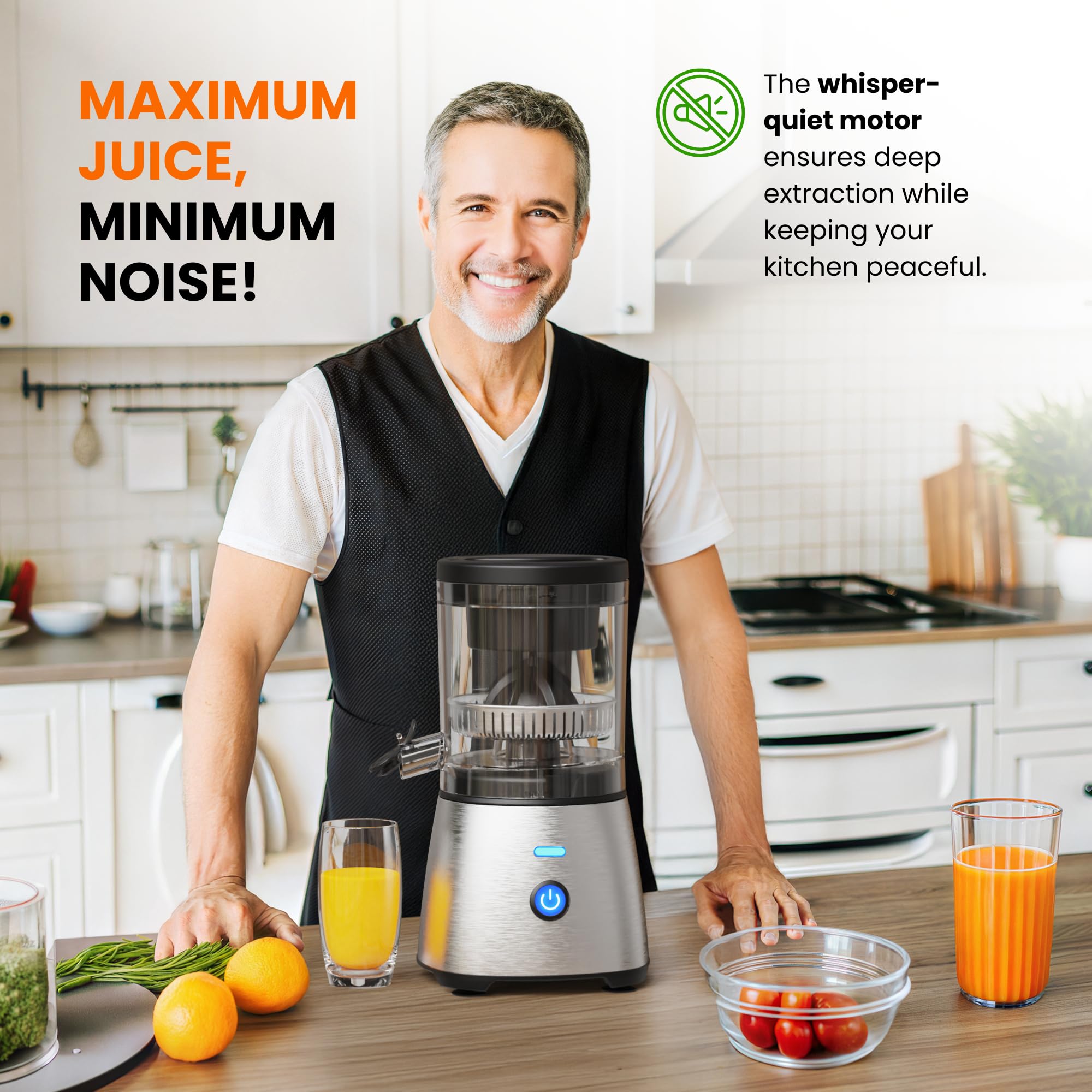 Compact & Stylish — Designed for modern kitchens, this compact juicer fits neatly on any counter. With a sleek stainless steel body and a space-saving 22x19x31.7 cm footprint, it offers both performance and visual appeal in one convenient appliance.