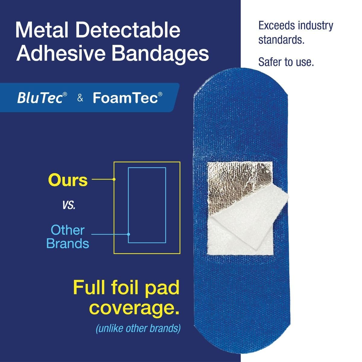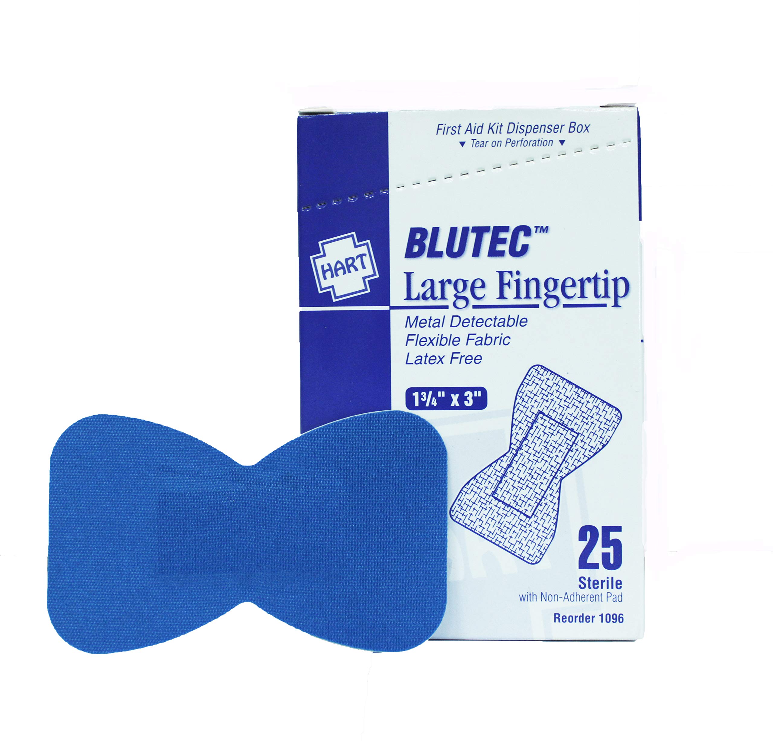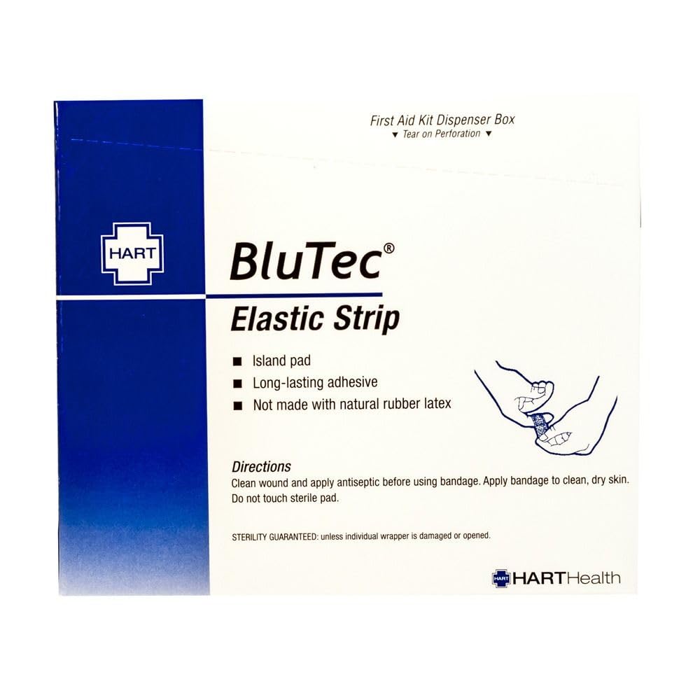 Hart Health 1089 BlueTec 1" x 3" Metal Detectable Elastic Strip Bandages, Flexible Fabric, Latex Free, 100 Per Box , Metal-detectable blue woven elastic strip adhesive bandage for temporary minor wound protection. Heavy-woven, blue elastic clothMetal-Detectable: BluTec's foil size and weight are 0.75 inches and .0335 grams. Best uses: Food Processing Plants, Meat Packers, & Food Manufacturing