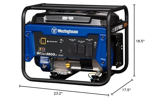 The Westinghouse WGen3600cv Portable Generator with CO Sensor is a convenient generator to keep you powered on the road or at your home during a power outage. With 4,650 peak watts and 3,600 running watts, this generator runs for up to 14 hours at a time with a 4 gallon (15 L) gasoline fuel tank. The WGen3600cv features a powerful 212cc 4-Stroke OHV Westinghouse Engine with a cast iron sleeve designed for durability, featuring a built-in fuel gauge and automatic low oil shutdown. It’s equipped with an RV Ready TT-30R 30A outlet that conveniently hooks to your travel trailer, keeping the air conditioner and travel necessities up and running all day long with an L5-30R outlet and household duplex outlets. Without the addition of the wheel kit, this unit minimizes sliding when being transported. Rubber outlet covers provide added protection from the environment and rugged conditions. An intuitive control panel makes the WGen3600cv simple and easy to use with guided yellow touchpoints. The WGen3600cv Portable Generator is complete with a 3-Year Limited Warranty and Lifetime Technical Support, backed by our nationwide Westinghouse customer service and support network.
