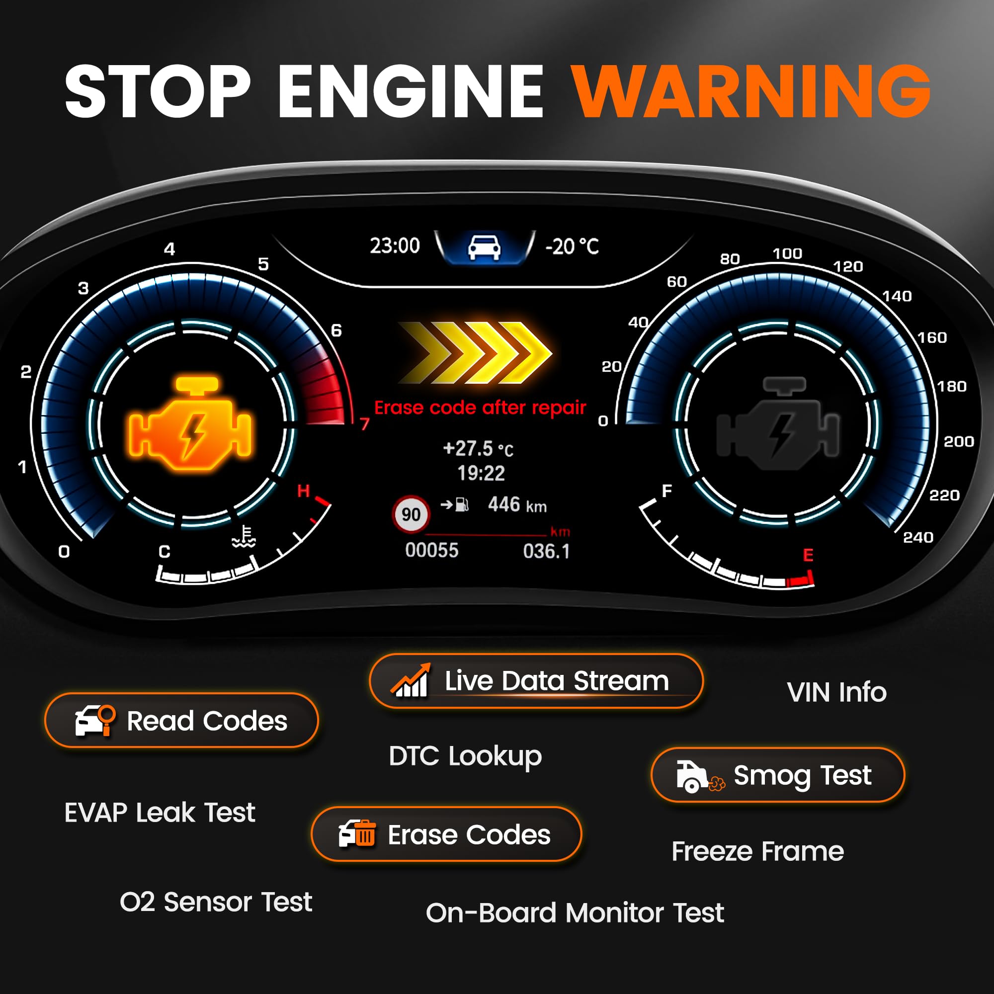 Full OBD2 Diagnostics: Engine Light On? No more guesswork! Check engine code reader reads codes to pinpoint all engine issues in seconds. After repairs, quickly clear codes and turn off the warning light. Supports displaying live data in text and graphs, freeze frame display, on-board monitoring, EVAP system tests. Compatible with 99% of global vehicle models, including American (1996+), European (1998+), and Asian (1996+) vehicles via the standard 16-pin OBDII port