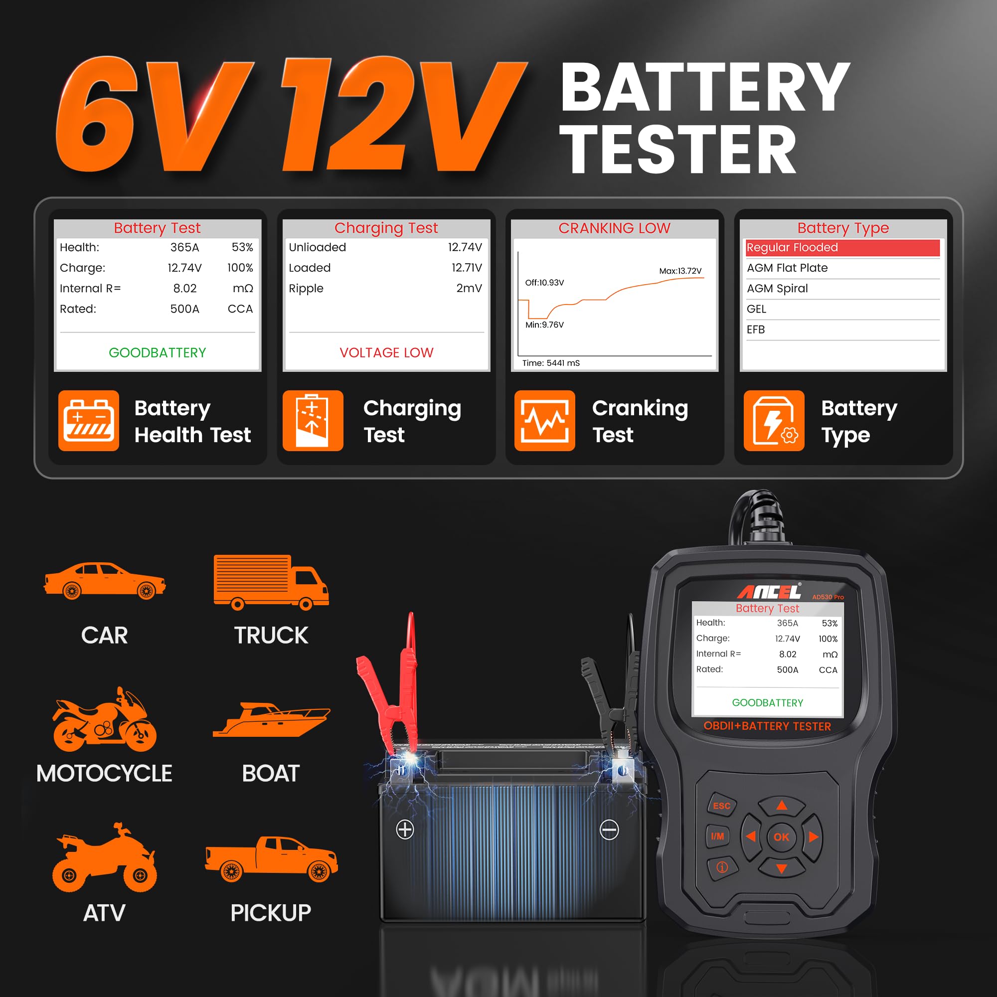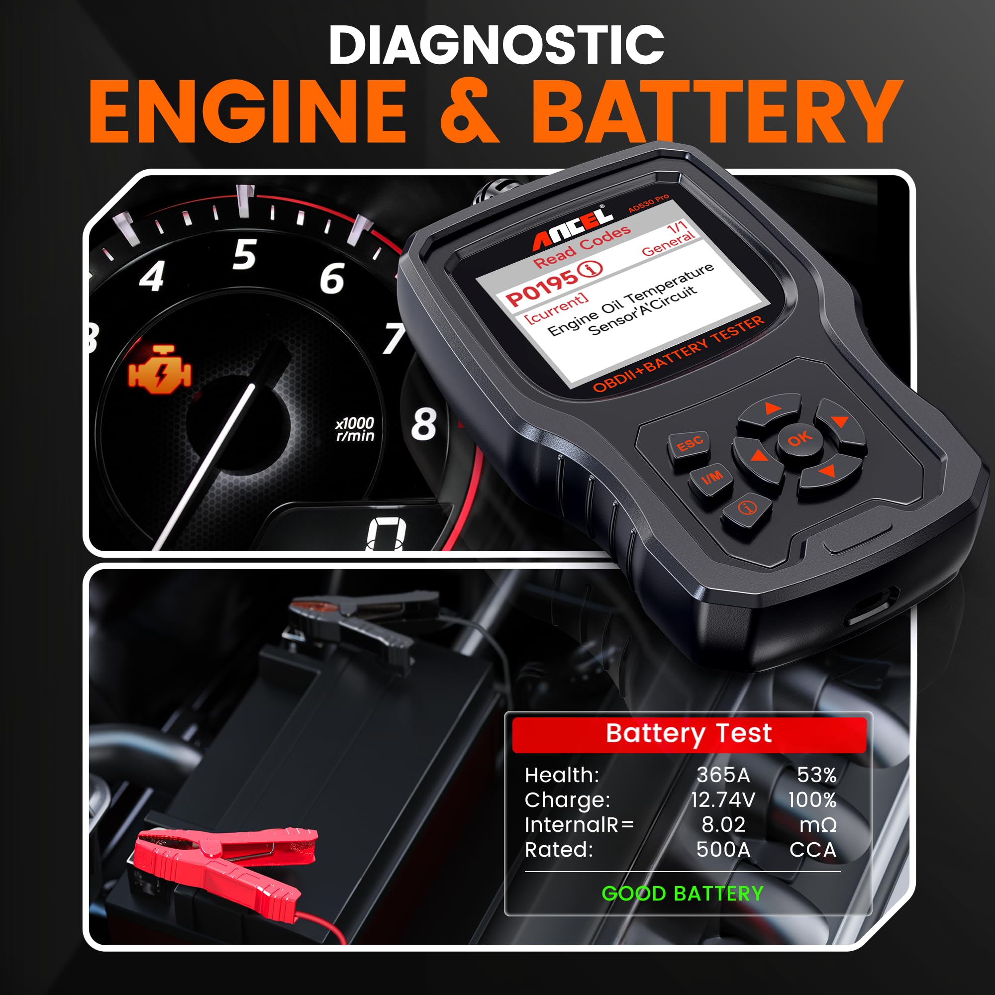 Upgraded 2 in 1 Check Engine & Battery: ANCEL AD530 PRO combines full-function OBD2 scanner with advanced battery tester (100-2000 CCA) in one compact tool—diagnosing engine lights and starting issues in seconds! Upgraded from the AD530, it adds cranking/charging tests for complete battery analysis. Featuring a 36% larger 2.8" screen compared to standard 2.4" screen, upgraded insulated clamps, and silicone protective case, it delivers pro-grade performance at half the cost of separate tools
