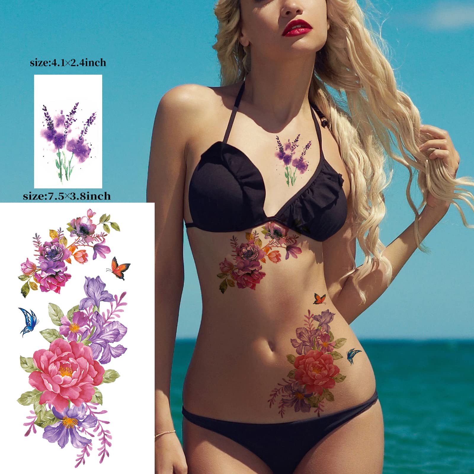 ❥【21 SHEETS】- 21 Sheets Flower Butterfly Temporary Tattoos for Women Kids Girls Adults Body Art Stickers, 【Size】10 sheets7.5'' * 3.8'', 11 sheets 4.1'' * 2.4''.