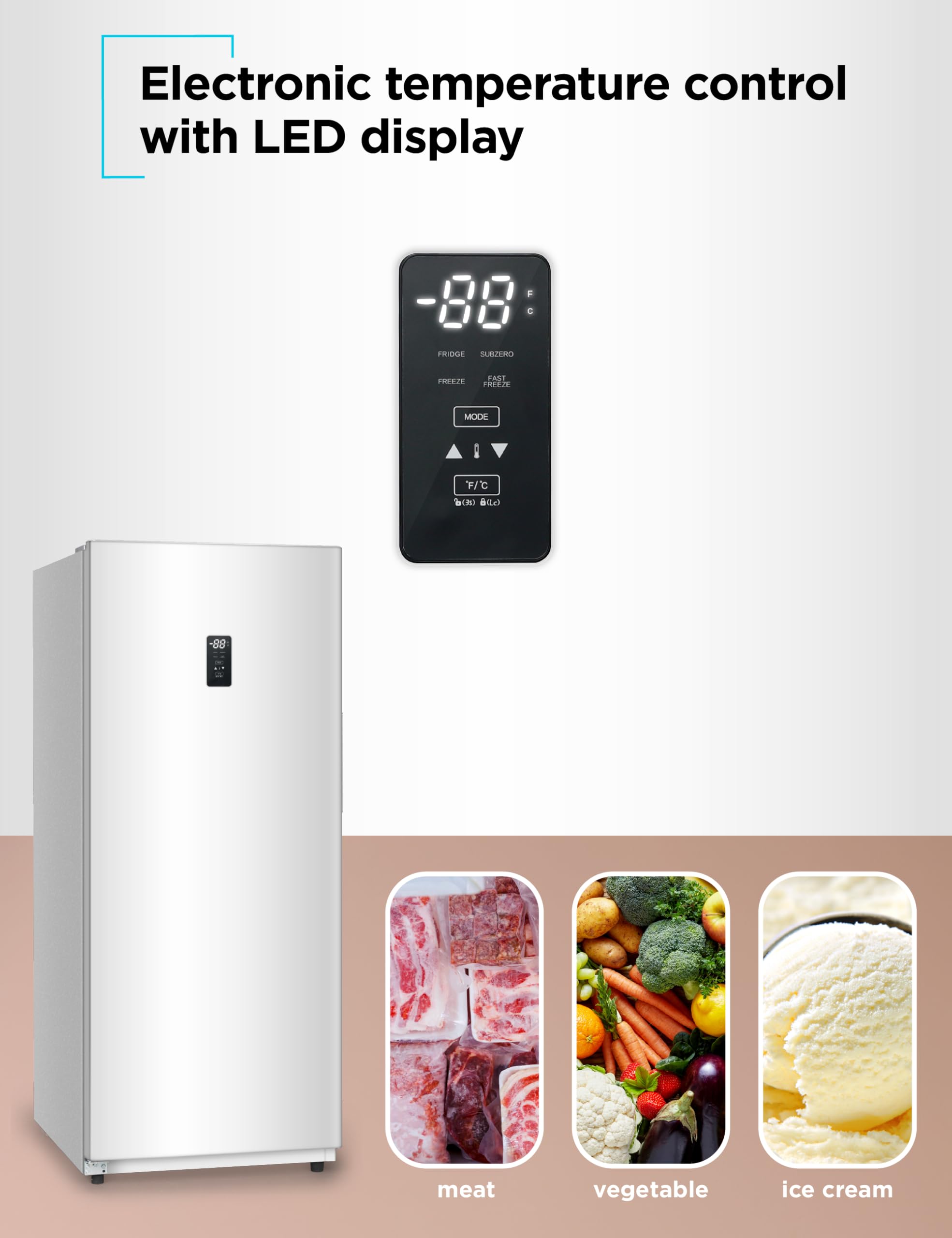 Electronic Control: Manage your standing freezer refrigerator settings with ease using the LED display, ensuring precise temperature control in both garage freezer and vertical refrigerator modes