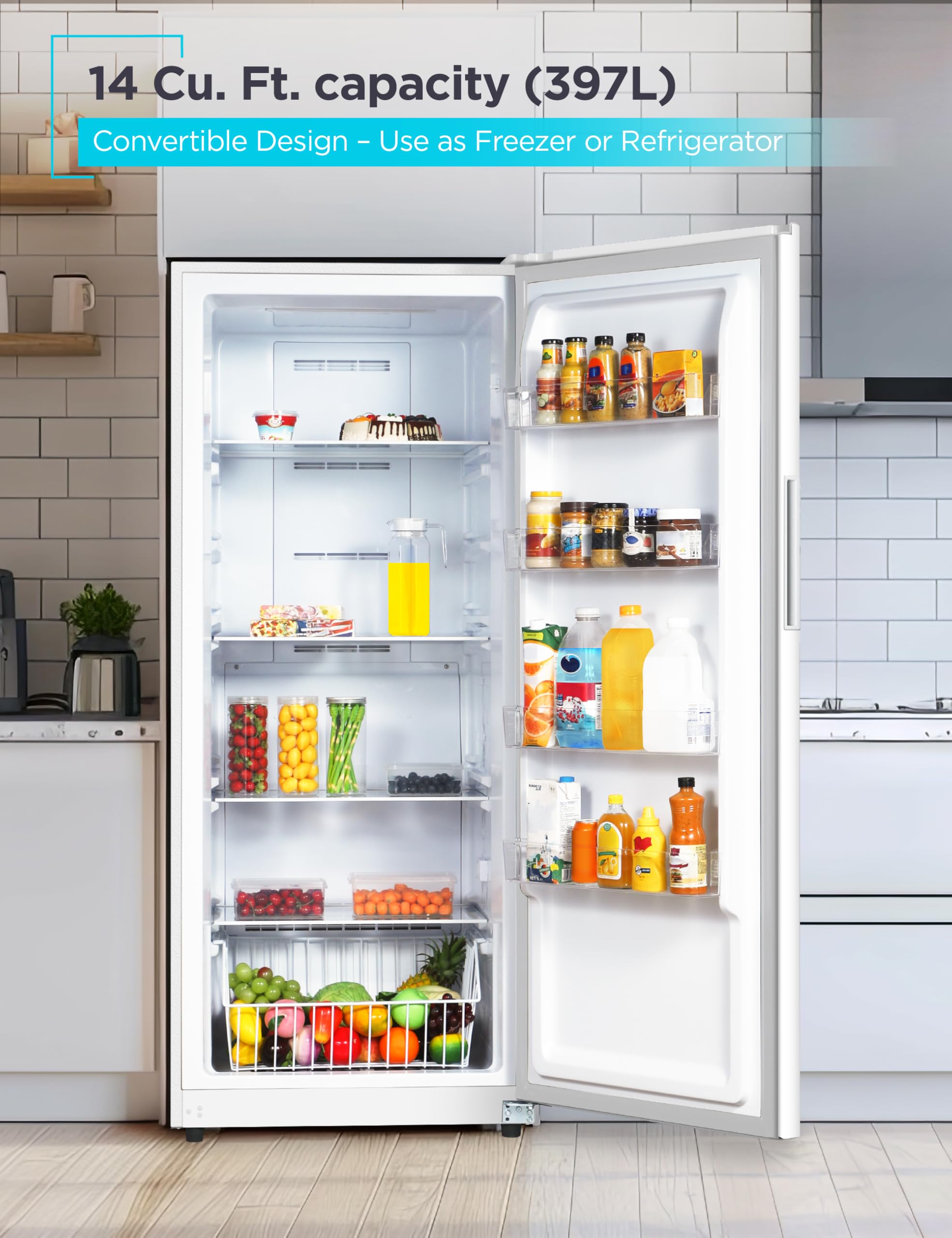 Convertible Design: This versatile 14 cu. ft. stand up freezer effortlessly transitions to a full size refrigerator, offering adaptable freezer storage and food storage solutions for various needs