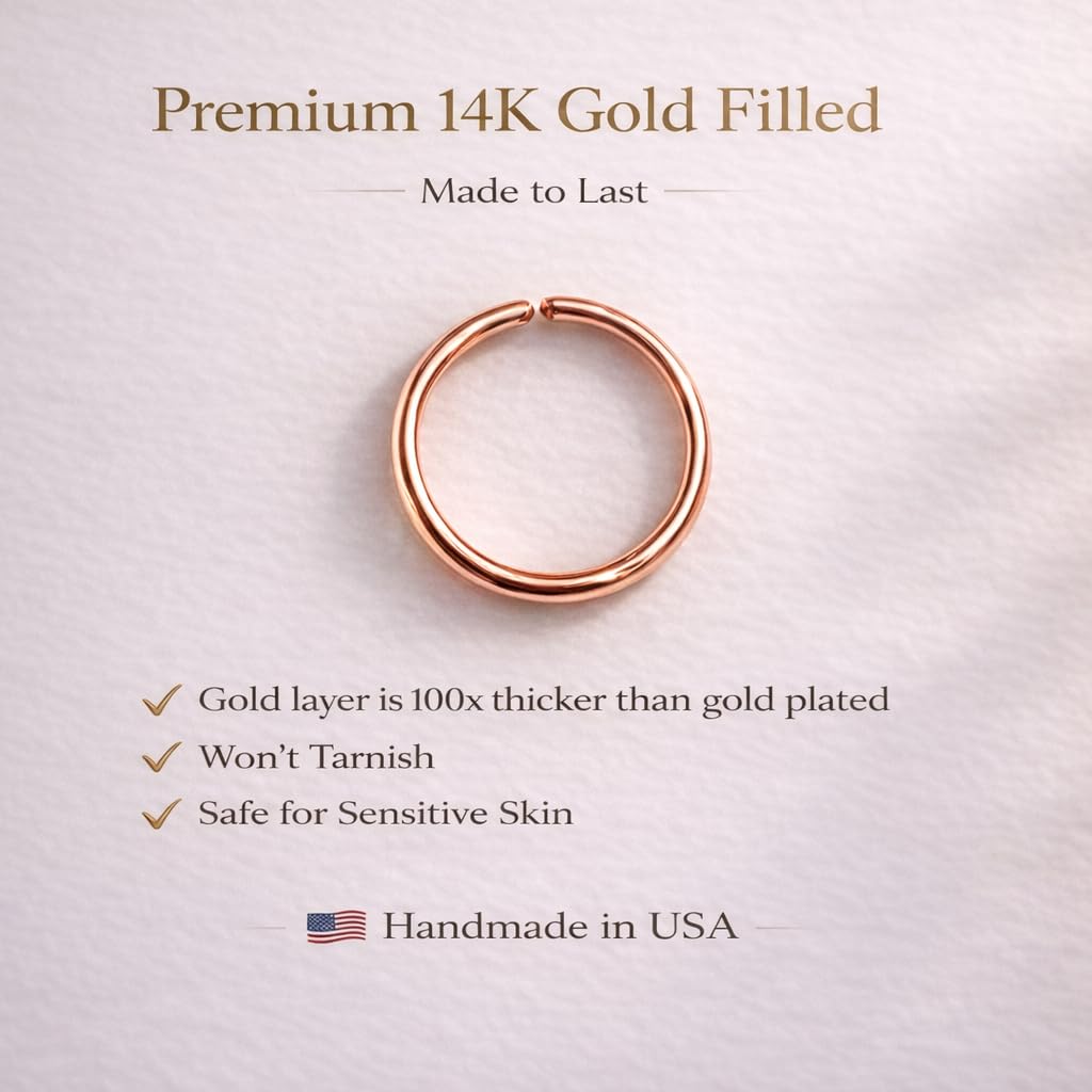 [Hoop Nose Rings for Women]: This 10mm rose gold nose ring hoop is 20 gauge, also available in 14k gold filled, solid sterling silver or rose gold filled, which are hypoallergenic, nickel-free and lead-free, safe for sensitive skin. Gold filled nose hoops are non-tarnish and waterproof, as they have solid 14k real gold heavily bond on (100 times thicker gold than gold plated), so the color will not fade.
