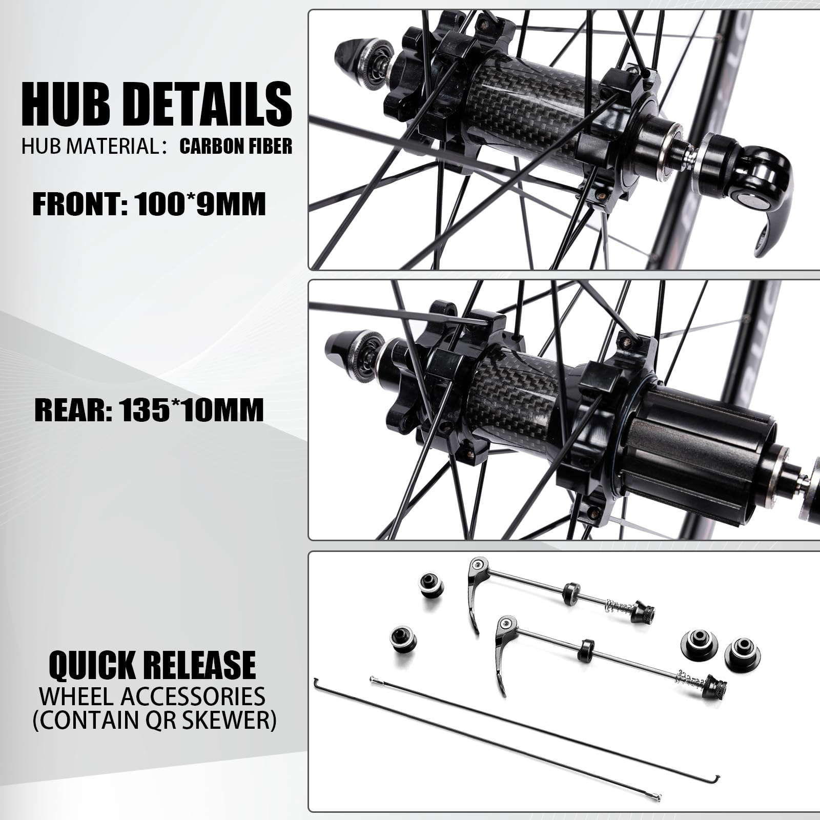 Carbon Fiber Hub: For this bike wheelset 700c, the carbon fiber hub makes your bikes lighter, and the structure of front 2+rear 5 bearings help road bike wheel spin up quickly and go fast, front axle spcing: 9×100 mm, rear axle spacing:10×135 mm