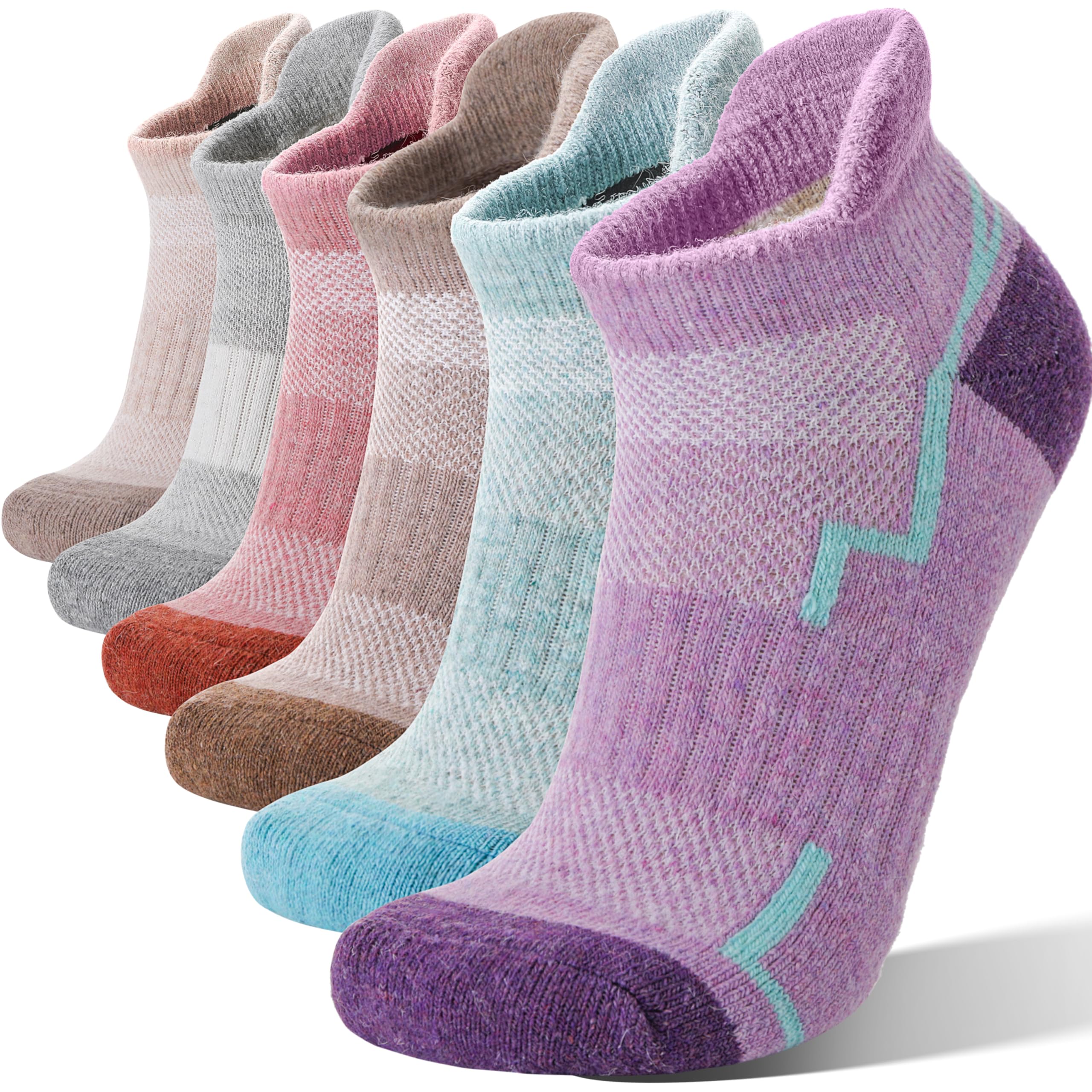 PROTECTION FOR FEET - These womens wool running ankle socks have stretchy cuff and arch support, which can have great compression support to reduce fatigue, protect the Achilles tendon, improve the blood circulation, and keep socks fit snugly. Cushioned sole absorbs shock and reduces risk of blistering. Pull tab resist abrasion and prevent slipping. All of these provide more protection for your feet.