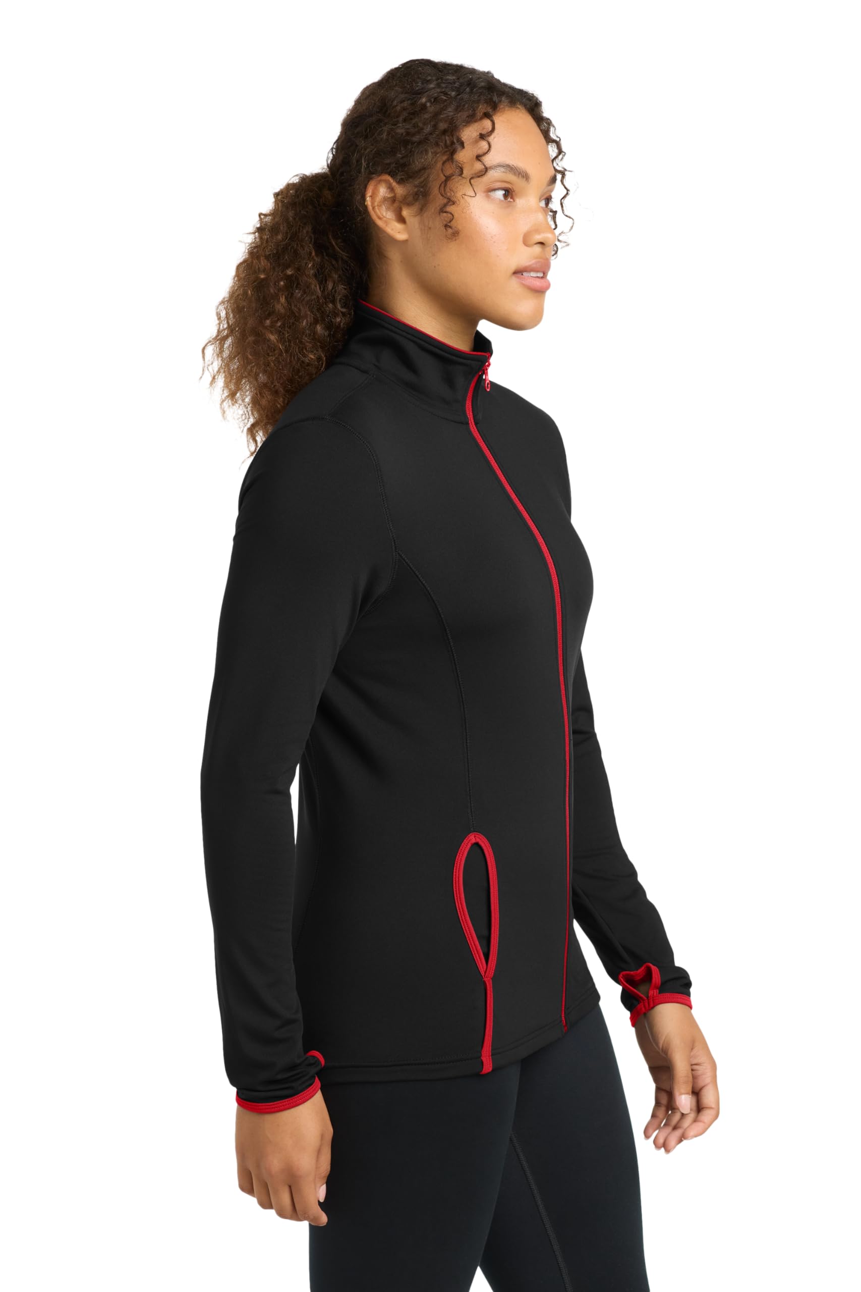 FLEXIBLE STYLE: Whether you're warming up, cooling down, or running around town, this women's full-zip jacket keeps up without slowing you down thanks to its soft-brushed feel, flexible fit, tag-free label, and sporty contrast details throughout.