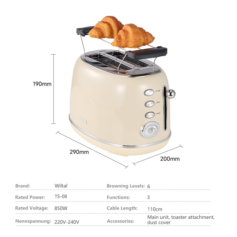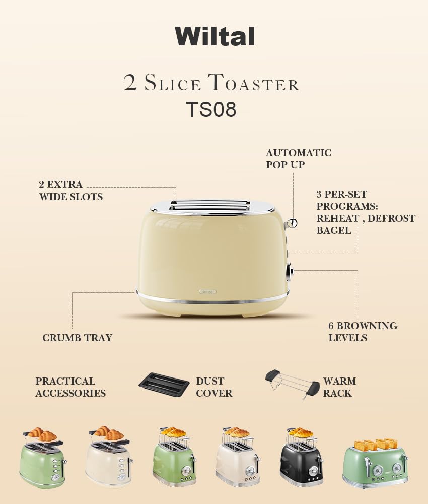 π₯―γπΉππππ π»ππππππ ππππ πΎππ π πΊππππγWiltal 1.58" wide slots 2 slice toaster with a size of 11 x 7.16 x 7.4inch, our cream retro series toaster features a vintage Beige. Powered by 685-815W, it includes two wide slots, perfect for Bagels, Thick-sliced Bread, Sandwiches and more. Compact yet versatile, it complements your kitchen countertop.