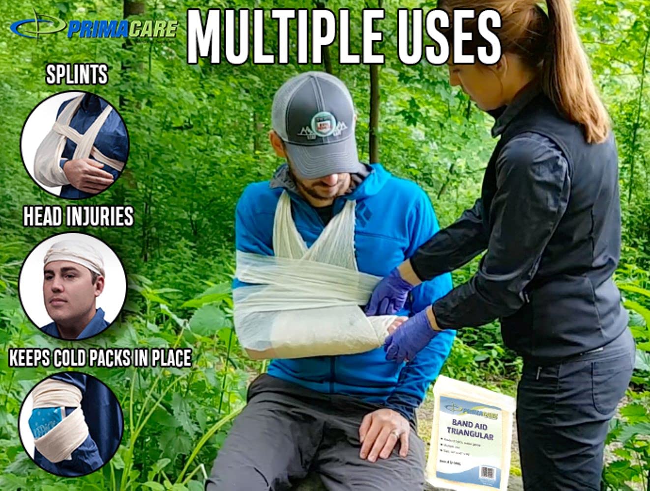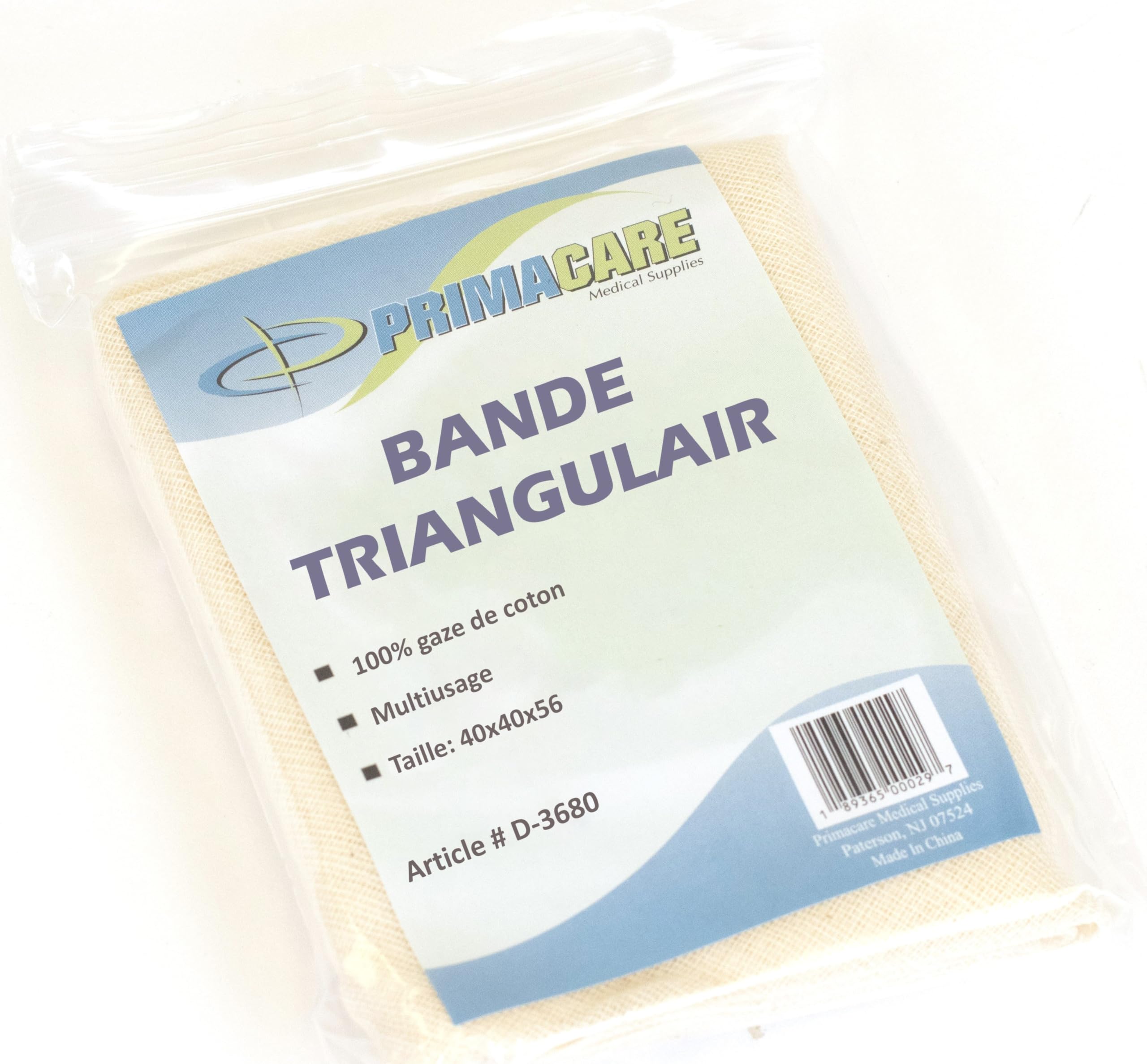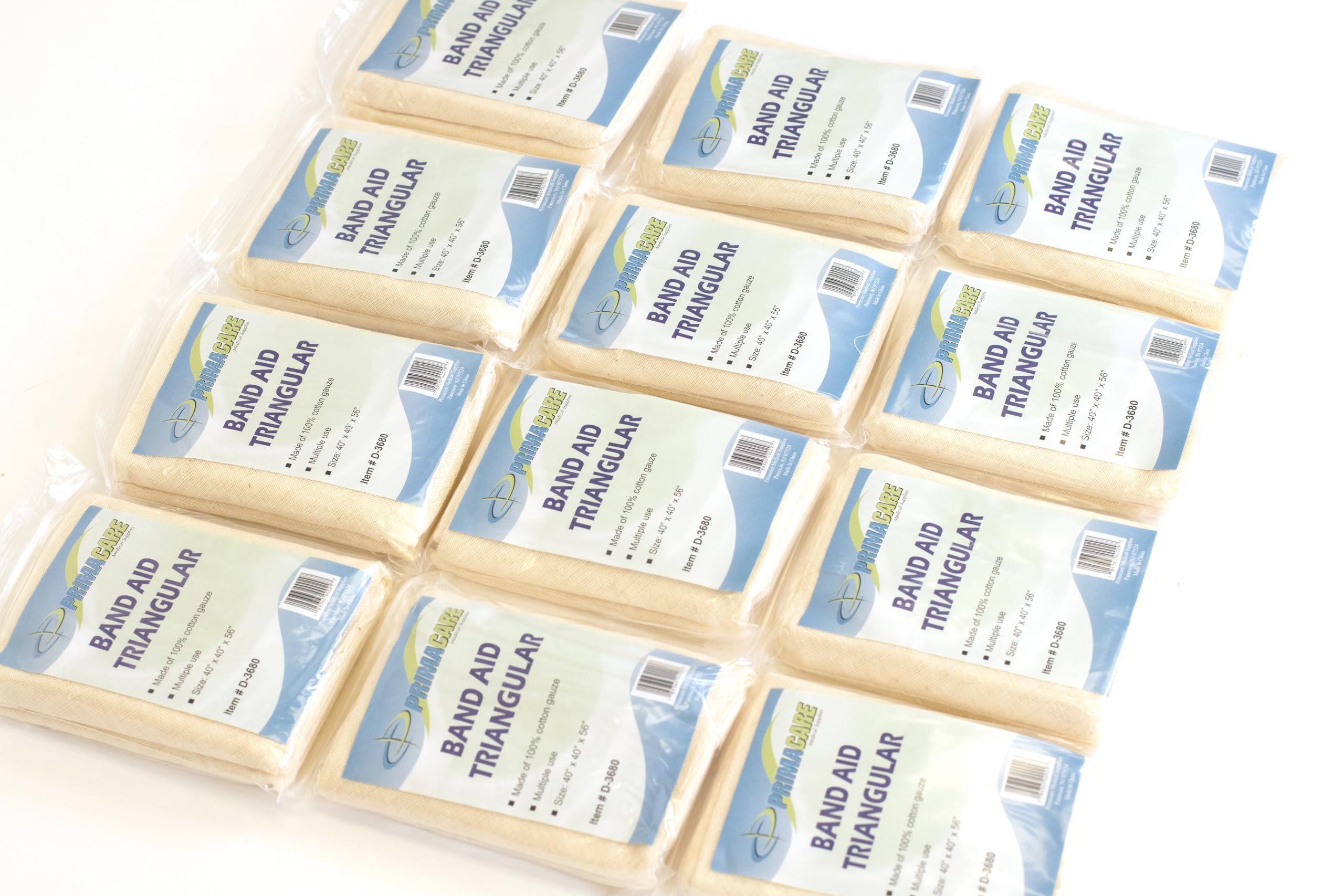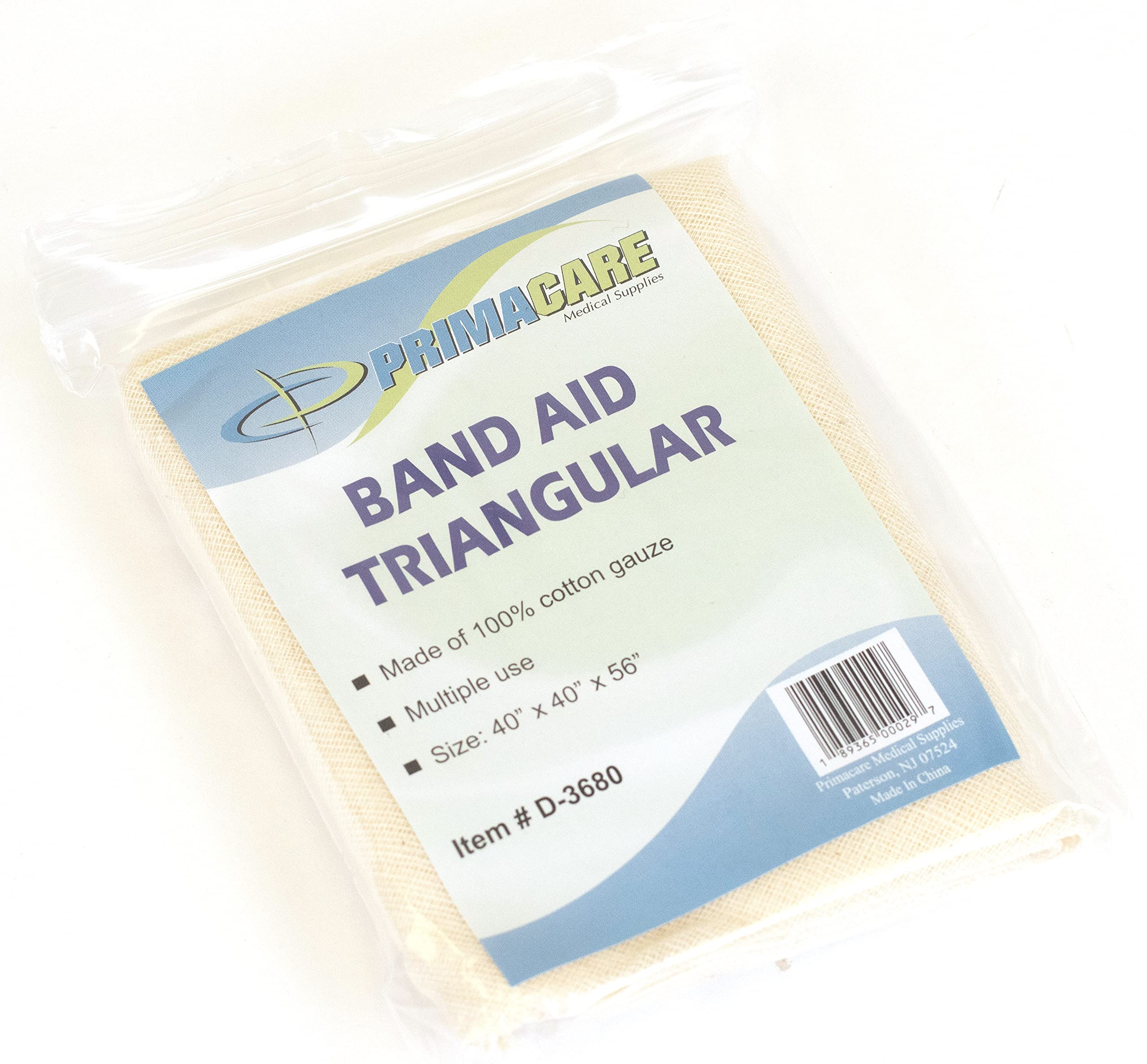 Product Description This Primacare triangular splint bandage is made of 100% non-woven cotton. Ideal for holding first aid dressings or cold packs in place. It is gentle to the skin and completely latex-free. It is measure at the dimension 40"" x 40"" x 56"". The bandage comes in cream color in a pack of 12. It's very handy to use also very easy to carry. It can be used for slings, head injury, ankle sprain, tourniquet, shoulder injuries, bleeding wounds, a splint to fractures, minor hand burns, hip wrap, and much more. It can be folded down multiple ways and used for non-medical also. Like as filtering water, face masks, tying knots, wrapping. It is individually poly-bagged and comes with 2 safety pins used to support or immobilize an injury to a bone or joint for patient comfort Features: Non-Woven Cotton Latex-free Individually poly-bagged Included 2 safety pins Medical and Non-medical use Manufacturer Contact Information 908-486-7050