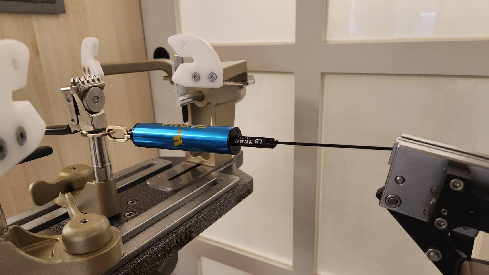 This tool is a spring tension calibrator that checks machine accuracy and helps measure the string tension of a racquet, ensuring they are at the correct tension level and improving racquet performance.
