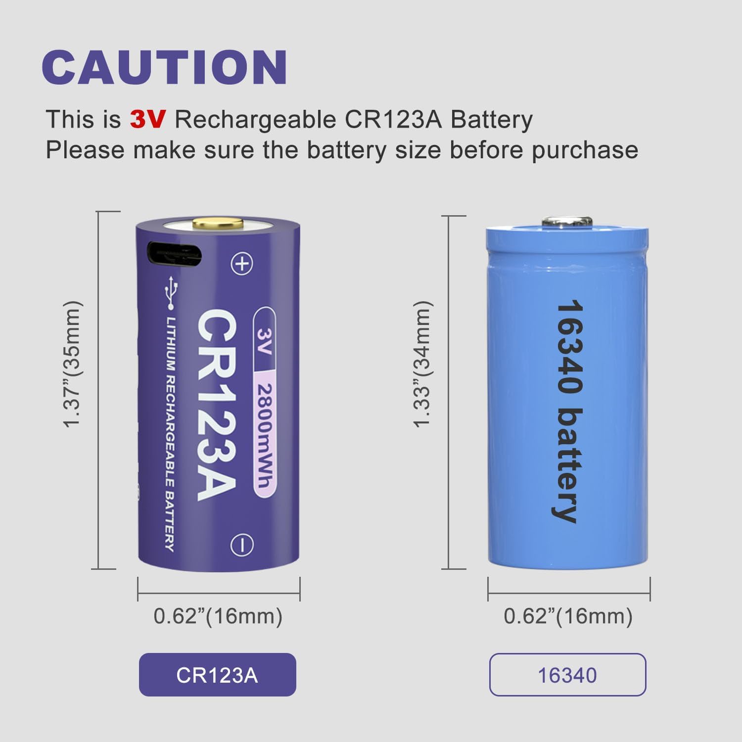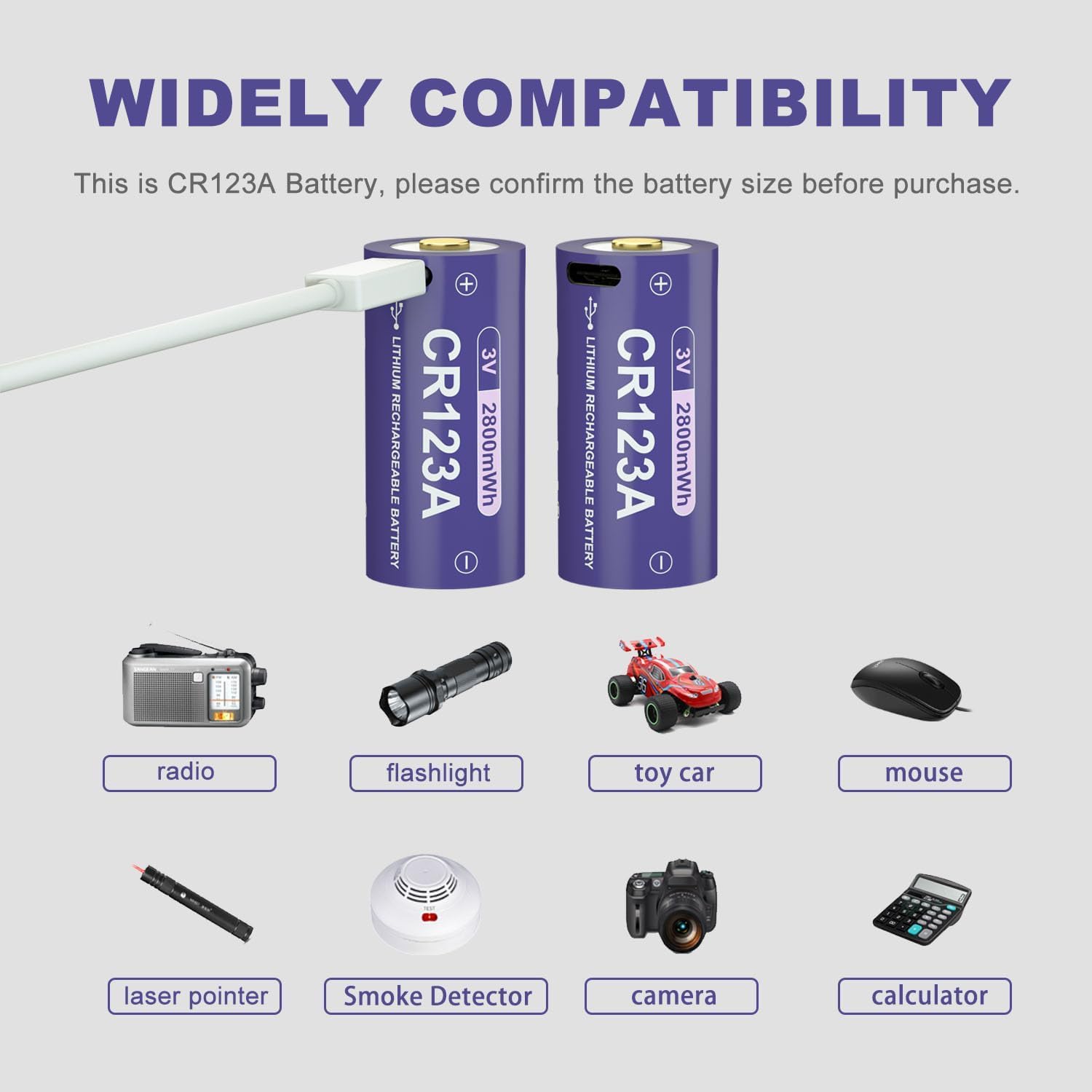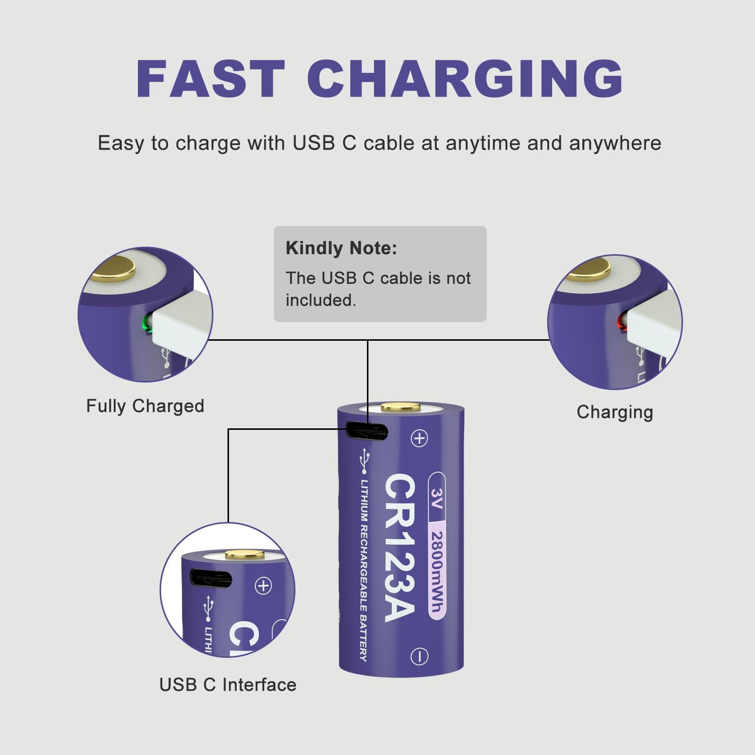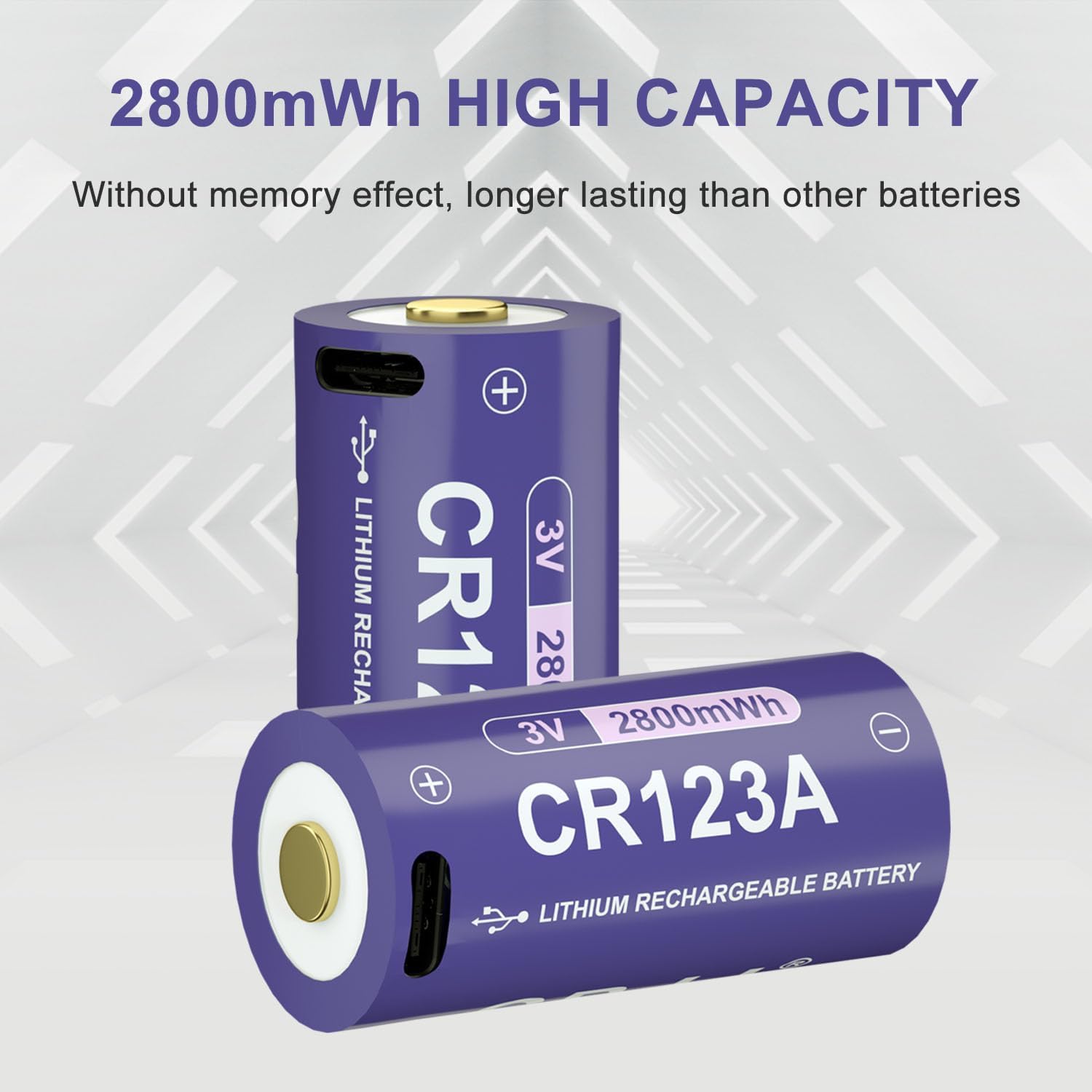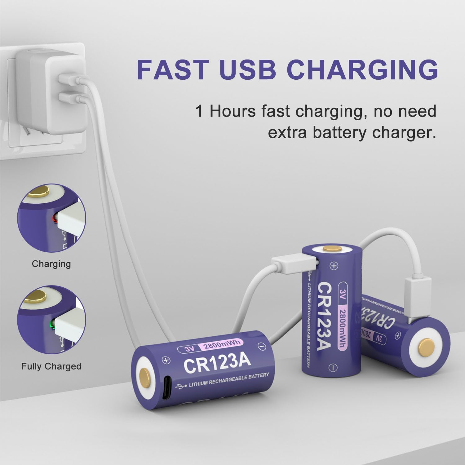 Covenient USB-C Charging: Our CR123A Lithium Battery supports fast charging with a 100W cell phone charger. Plug into any USB port (AC adapter, power bank, or computer) to Charge two Batteries in just 2 hours.