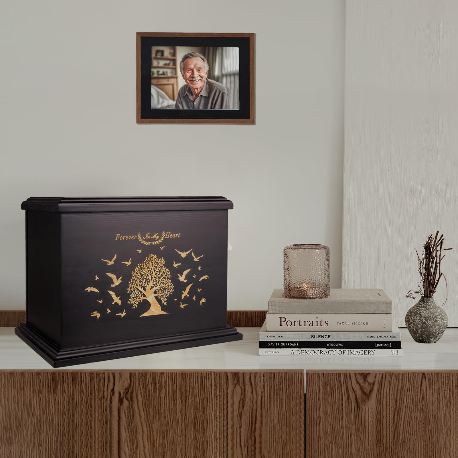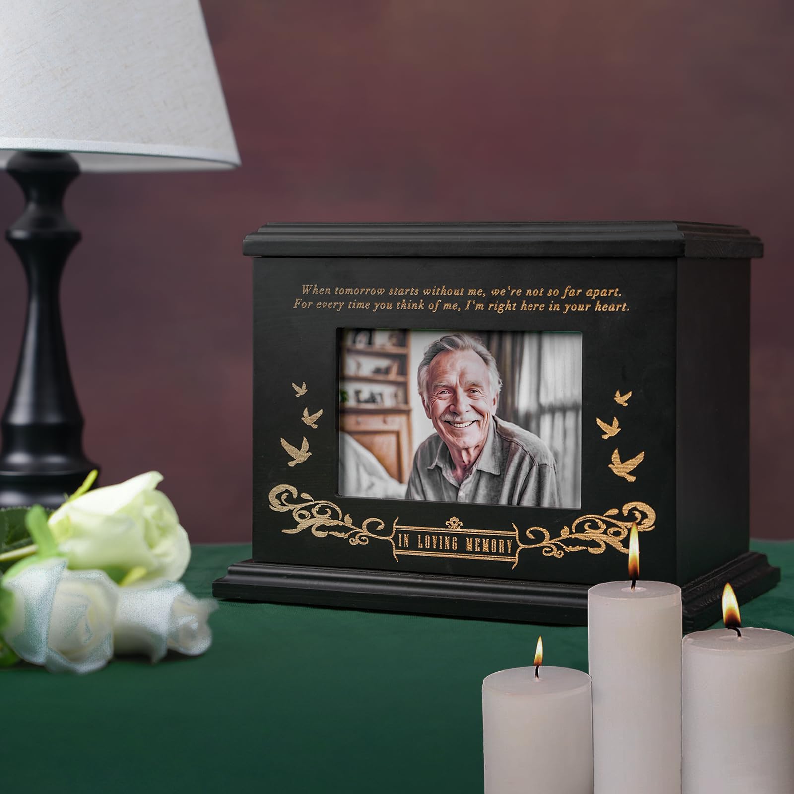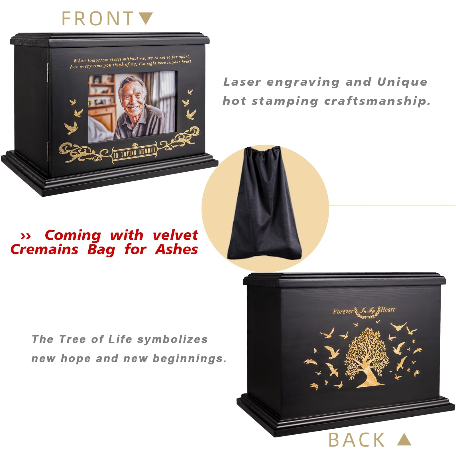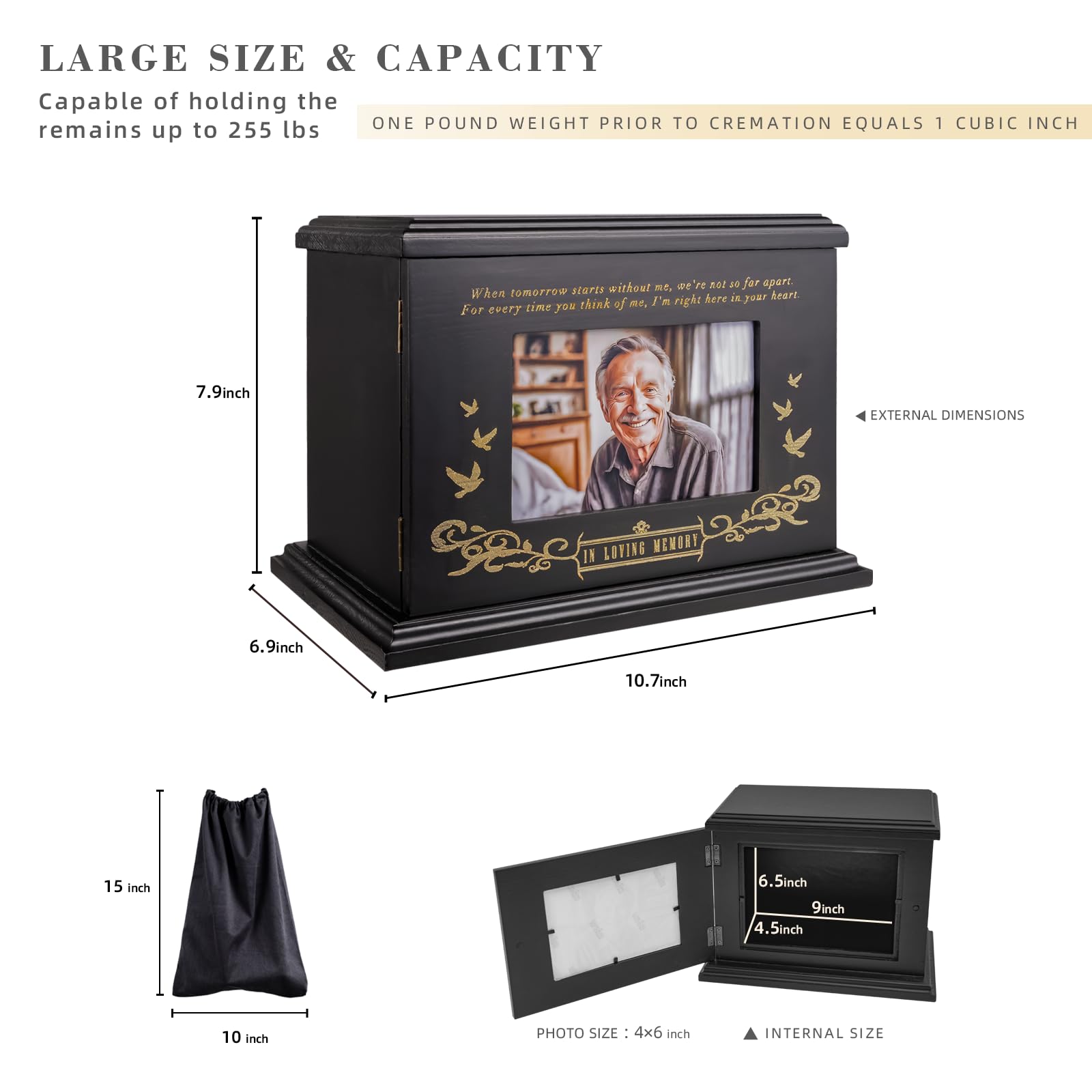 Wooden picture frame urns: The ashes urn box comes with a photo area where customers can add their own photo measuring 4X6 inches or a memorial card and more personalized ways to commemorate the occasion;The photo area is separate from the area where the ashes are placed, and photos can be changed at any time